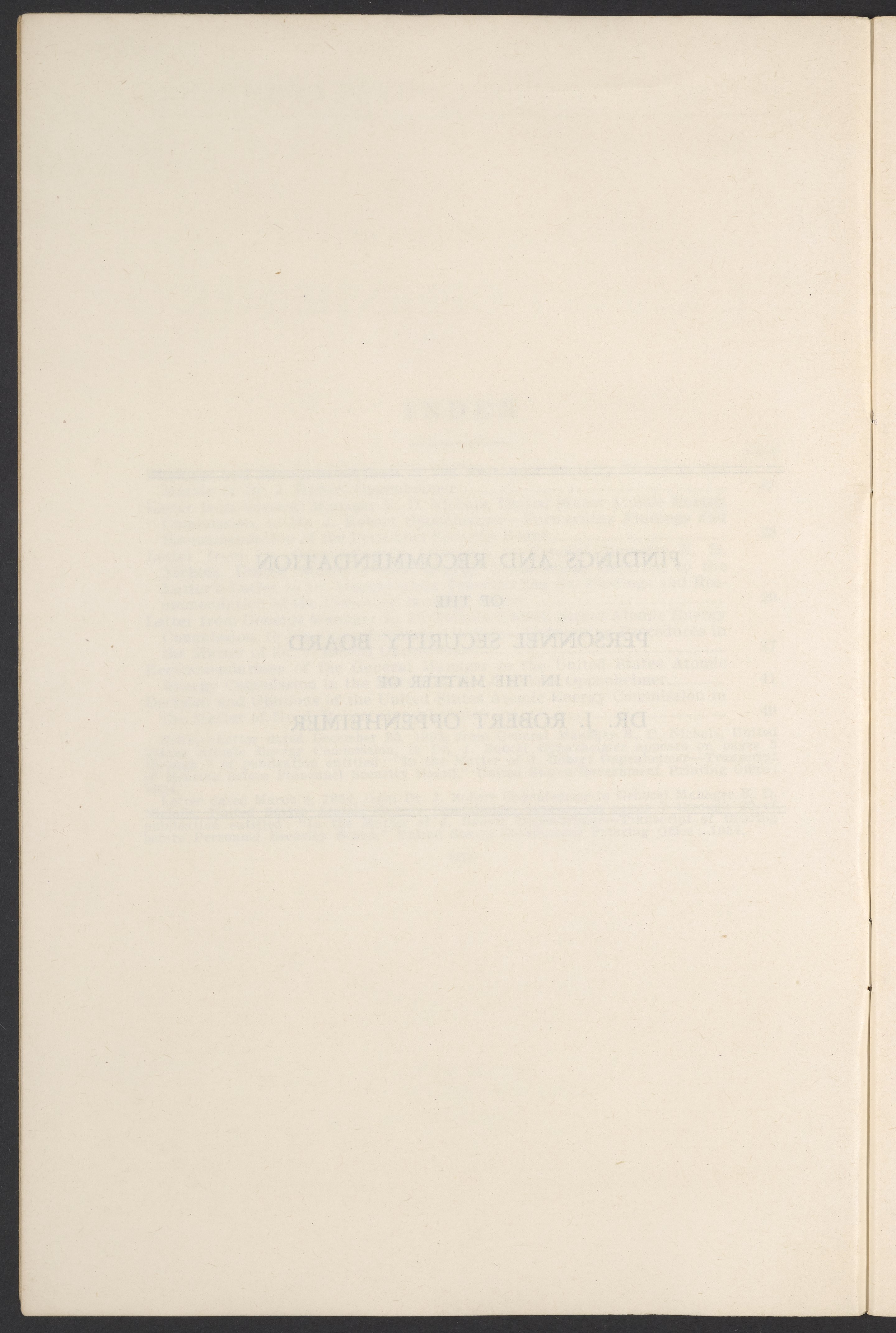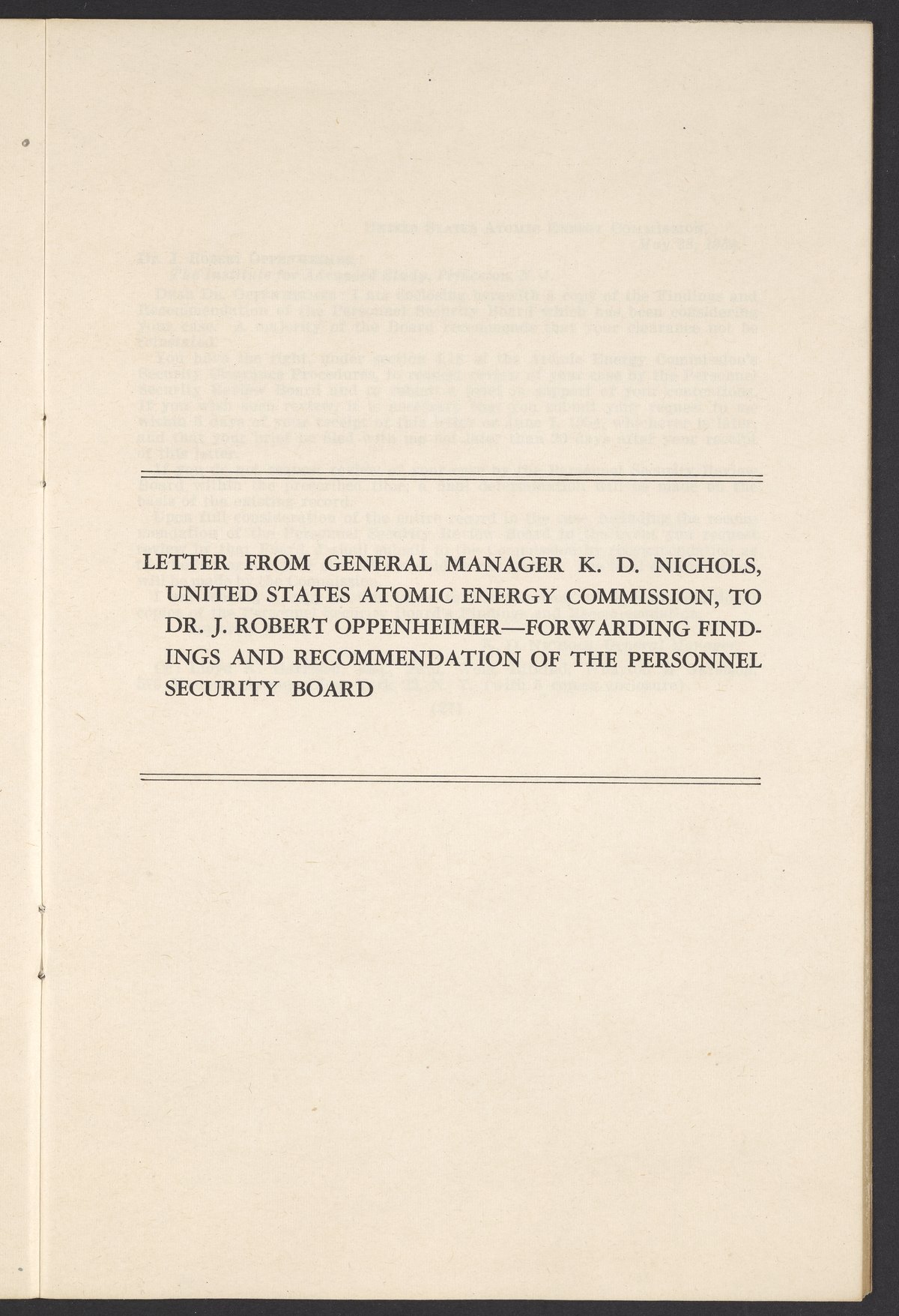 U.S. Atomic Energy Commission. “In the Matter of J. Robert Oppenheimer: Texts of Principal Documents and Letters of Personnel Security Board General Manager Commissioners.” Washington (D.C.): United States. Government Printing Office, 1954. Papers of Max Bredig, Box 8, Folder 42. Science History Institute. Philadelphia. https://digital.sciencehistory.org/works/uxuymyg.