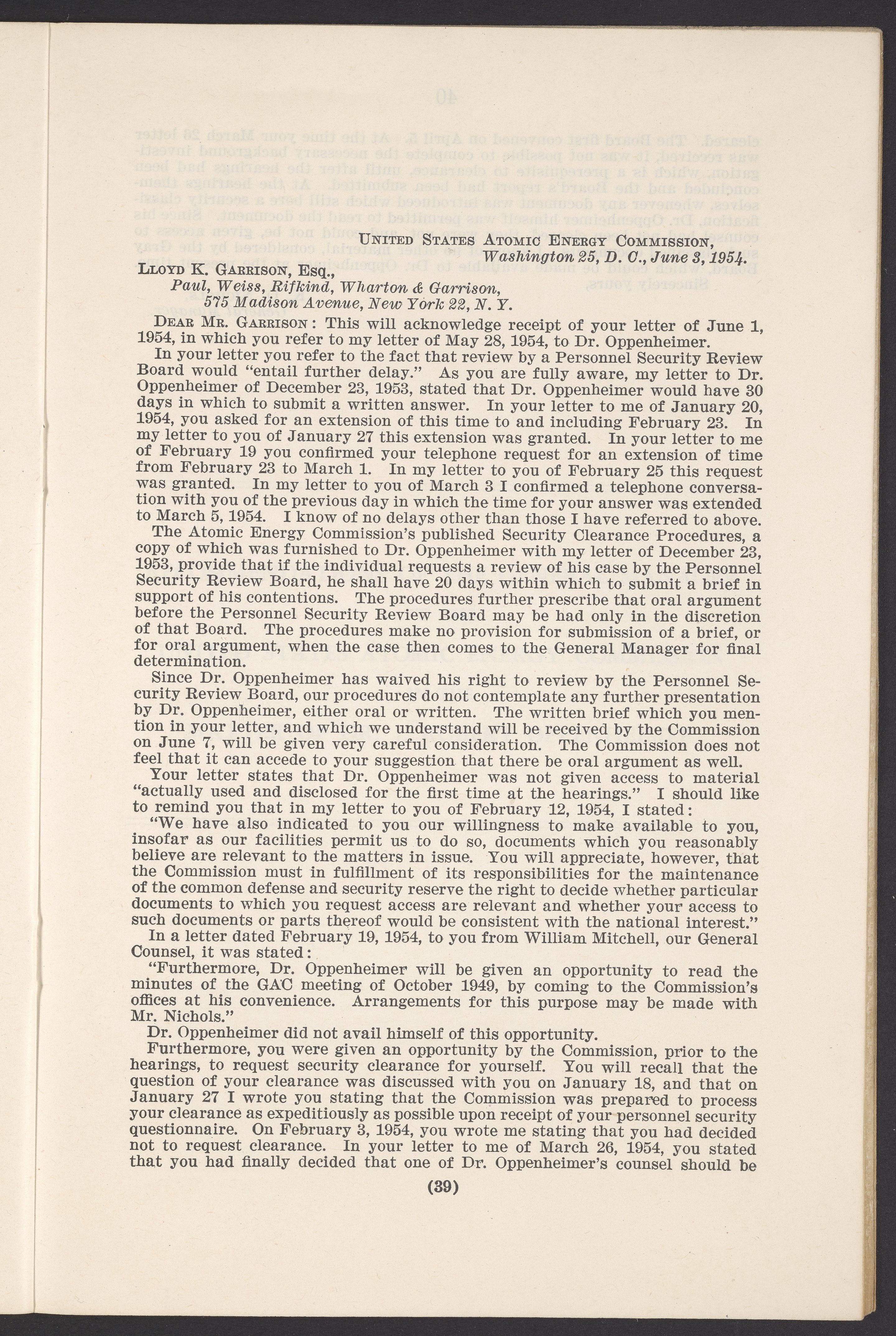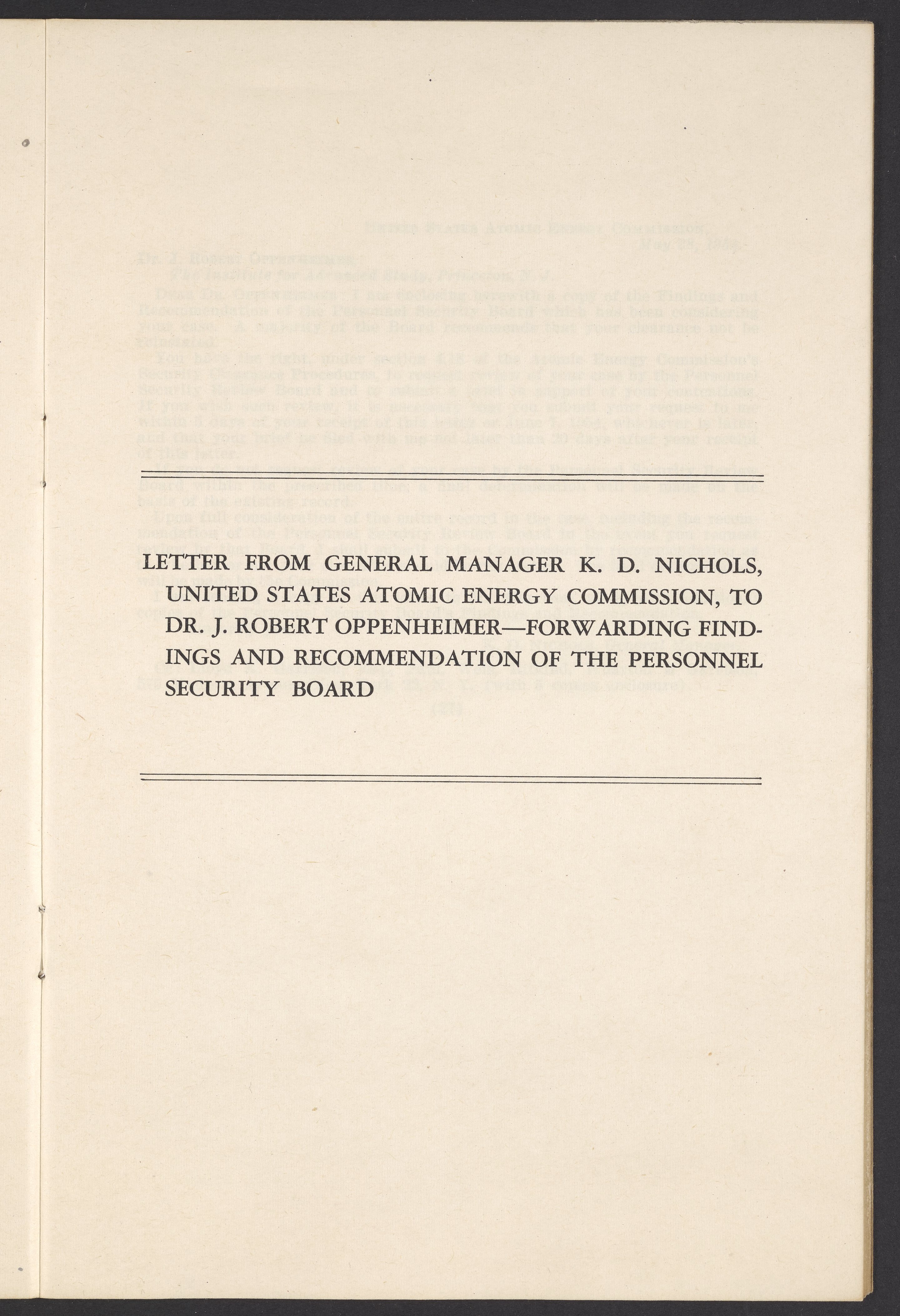 In the Matter of J. Robert Oppenheimer: Texts of Principal Documents and Letters of Personnel Security Board General Manager Commissioners