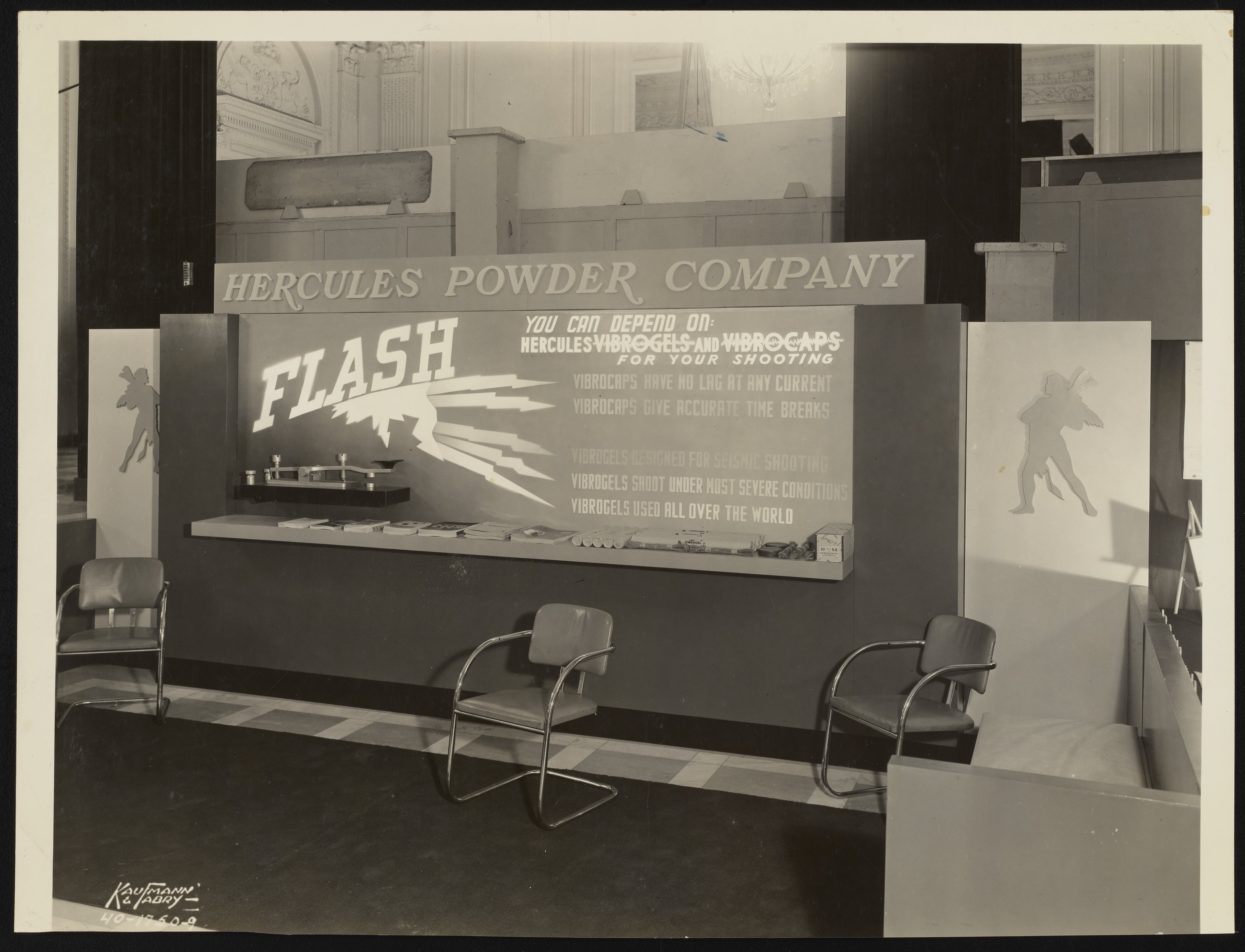 General view of an exhibition display promoting Vibrogel explosives and Vibrocap blasting caps manufactured and sold by the Hercules Powder Company.