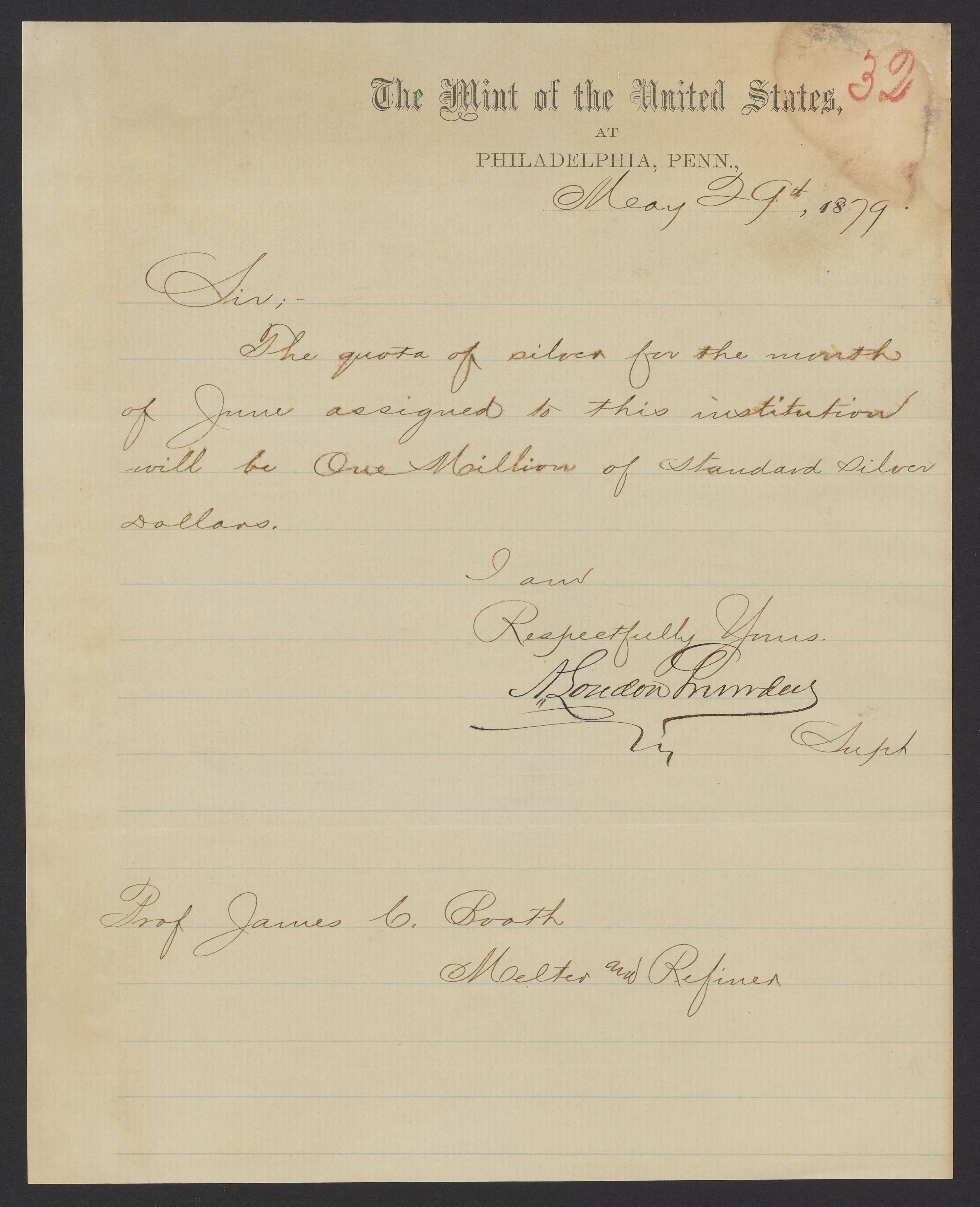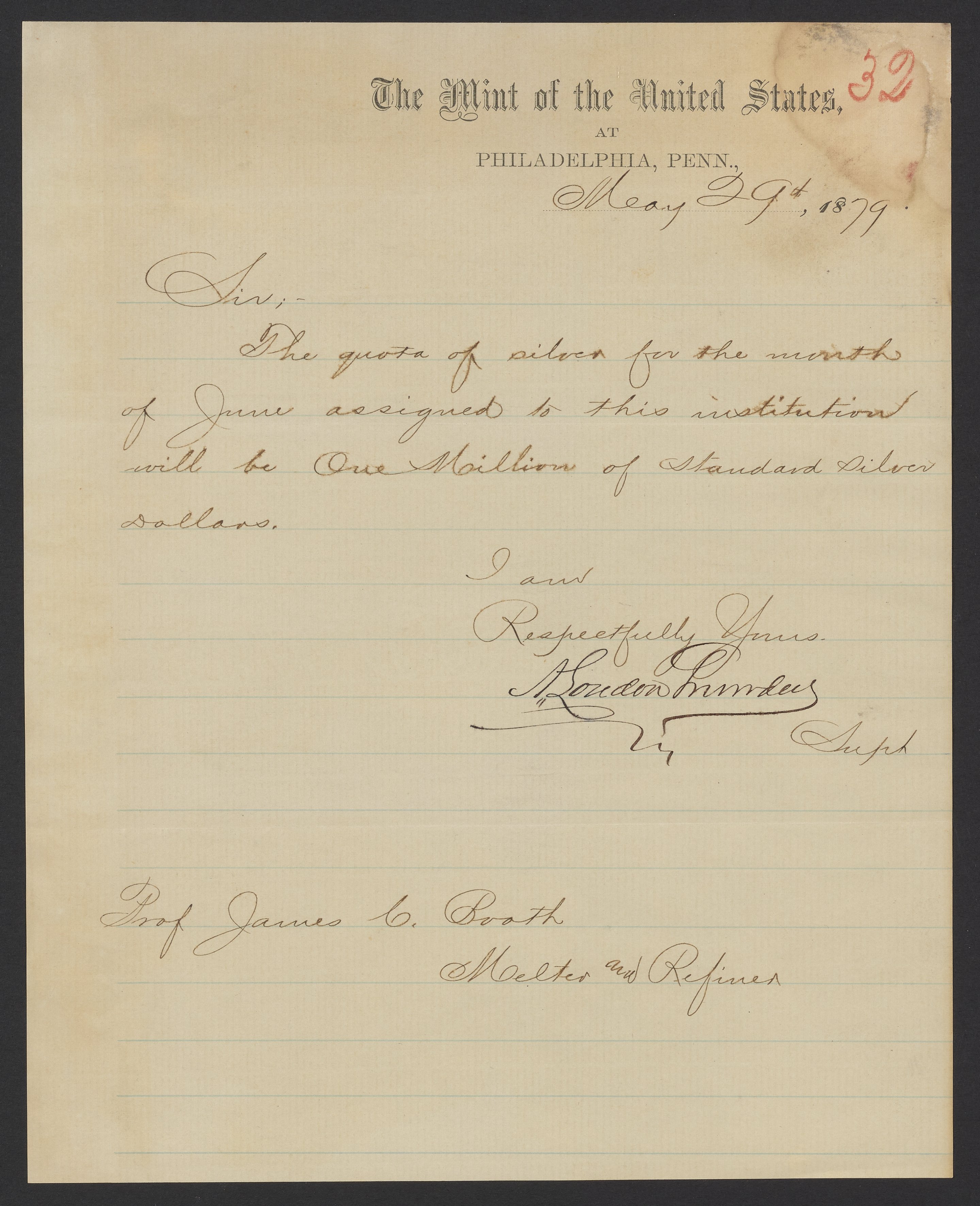 Archibald Loudon Snowden (1835-1912), Superintendent of the United States Mint at Philadelphia from 1879 to 1885, sends James Curtis Booth (1810-1888) a quota of silver production for the month of June 1879.