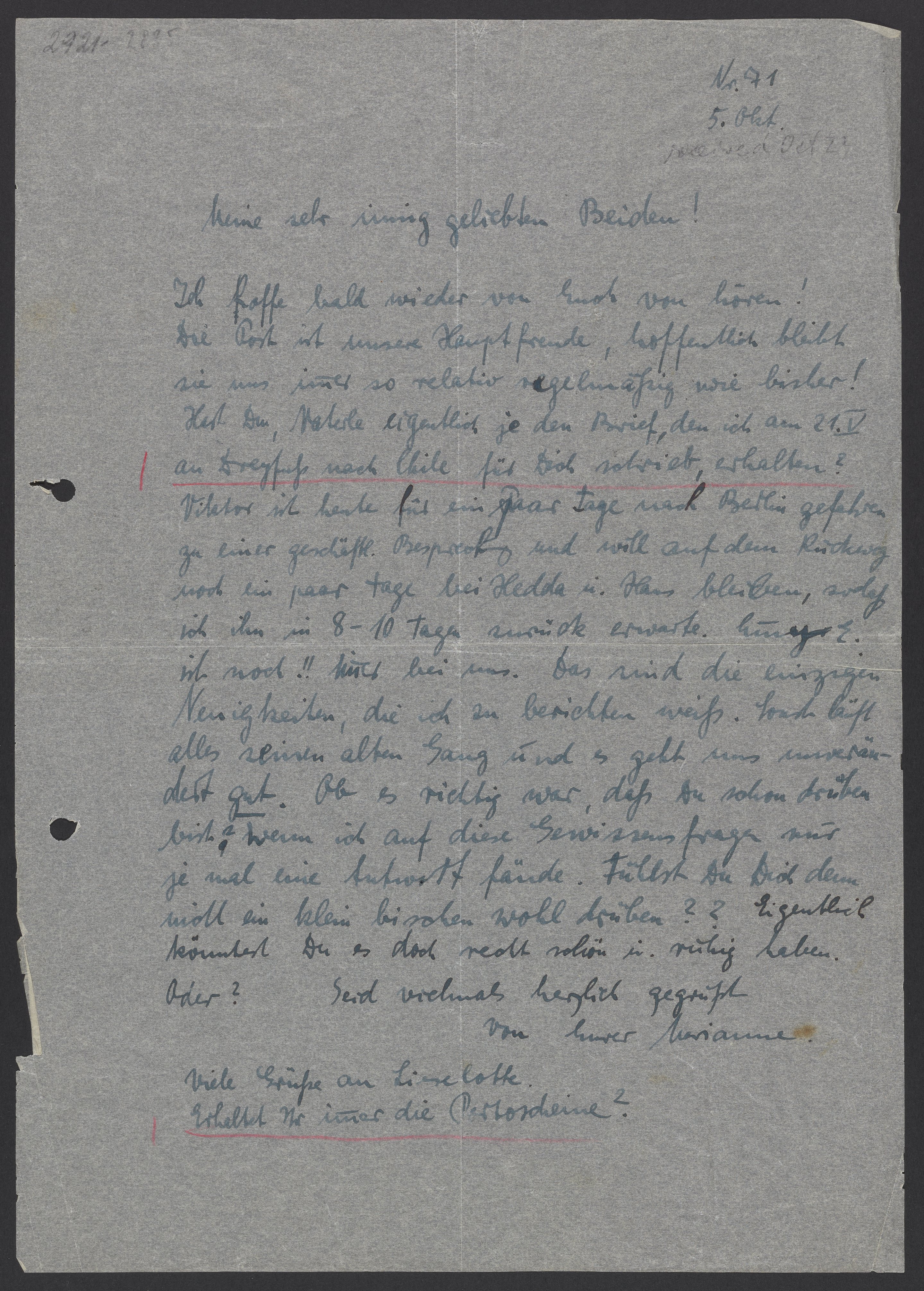 Ich hoffe bald wieder von Euch zu hören! Die Post ist unsere Hauptfreunde, hoffentlich bleibt sie uns immer so relativ regelmäßig wie bisher! Hast Du, Vaterle eigentlich je den Brief, den ich am 21.V an Dreyfuß nach Chile für Dich schrieb, erhalten? Viktor ist heute für ein paar Tage nach Berlin gefahren zu einer geschäftl. Besprechung und will auf dem Rückweg noch ein paar Tage Hedda u. Hans bleiben, sodaß ich ihm in 8-10 Tagen zurück erwarte. Emmy E. ist noch!! hier bei uns. Das sind die einzigen Neuigkeiten, die ich zu berichten weiß. Sonst läuft alles seinen alten Gang und es geht uns unverändert gut. Ob es richtig war, daß Du schon drüben bist? Wenn ich auf diese Gewissensfrage nur je mal eine Antwort fände. Fühlst Du Dich denn nicht ein klein bischen wohl drüben?? Eigentlich könntest Du es doch recht schön u. ruhig haben. Oder?