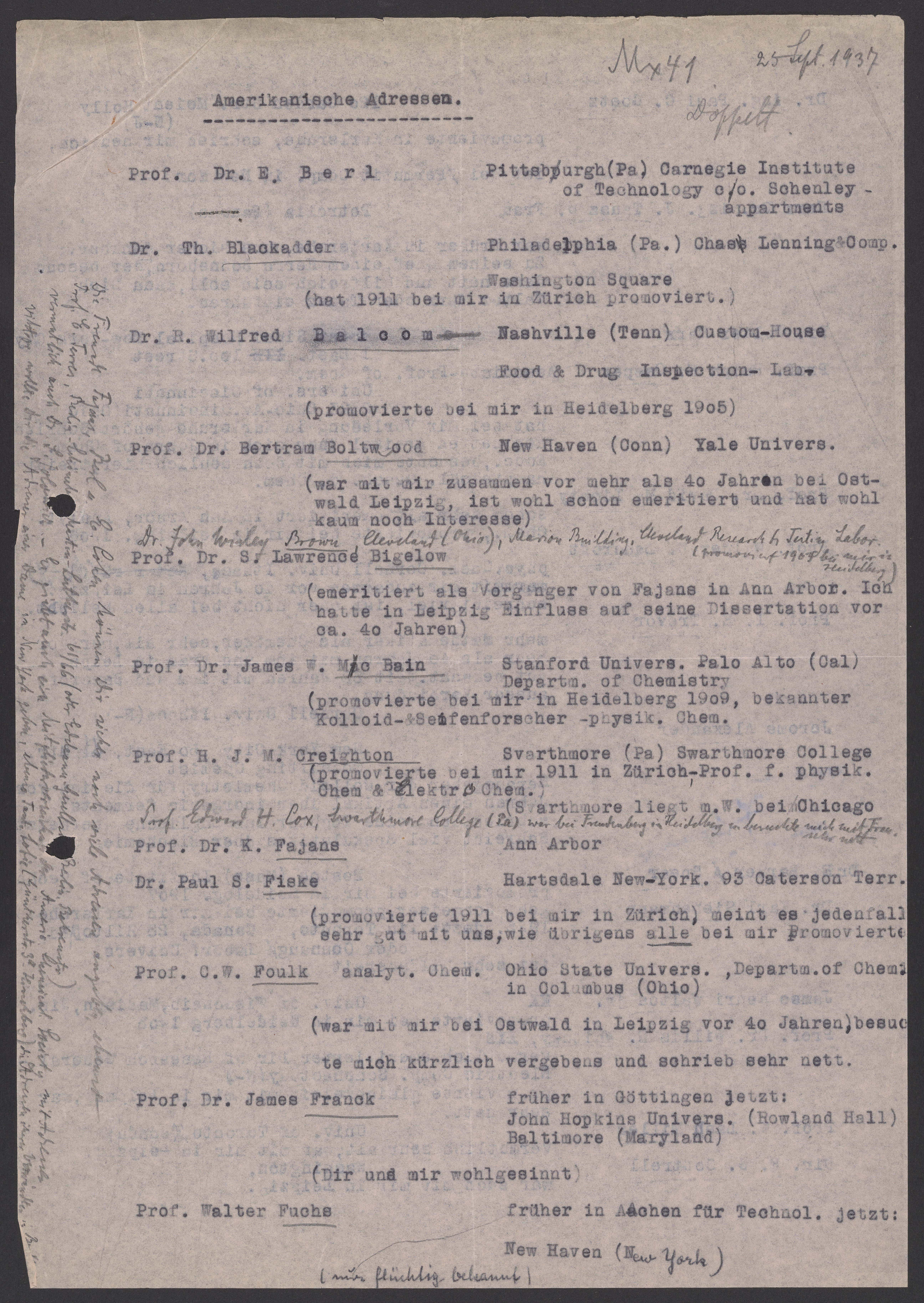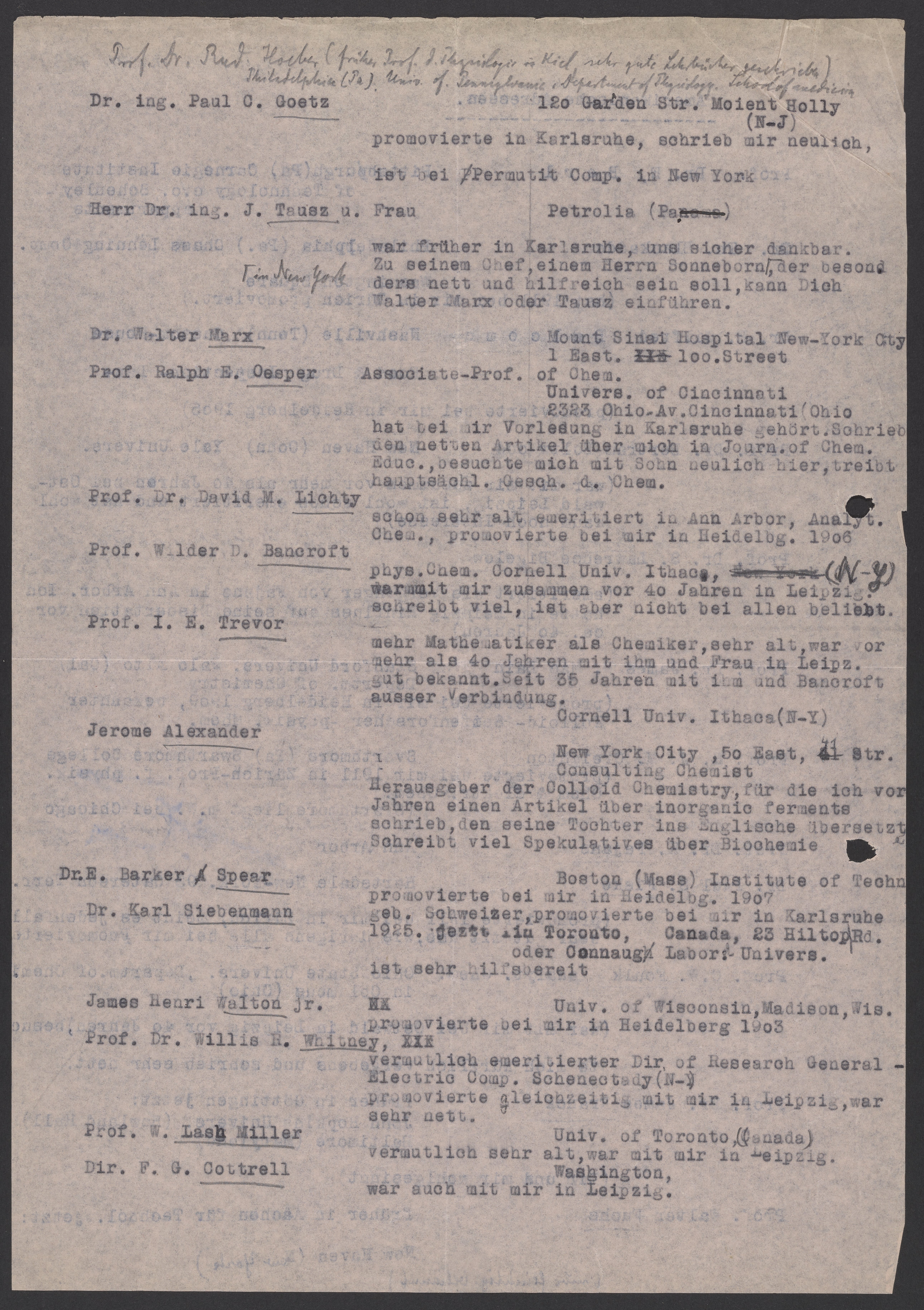 Contacts include Ernst Berl (1877-1946), Thomas Blackadder (1887-1953), Bertram Boltwood (1870-1927), Samuel Lawrence Bigelow (1870 - 1947), James W. McBain (1882–1953), H. Jermain Creighton, Kasimir Fajans (1887-1975), Paul S. Fiske, James Franck (1882-1964), Walter Fuchs, Paul Goetz, Jeno Eugen Tausz (1891-1964), Ralph Edward Oesper (1886-1977), David M. Lichty, Wilder Dwight Bancroft (1867-1953), Joseph E. Trevor (1864-1941), Jerome Alexander (1876–1959), Ellwood Barker Spear (1875-1943), Karl Siebenmann, James Henri Walton Jr., Willis Rodney Whitney (1868-1958), William Lash Miller (1866-1940), and Frederick Gardner Cottrell (1877-948).