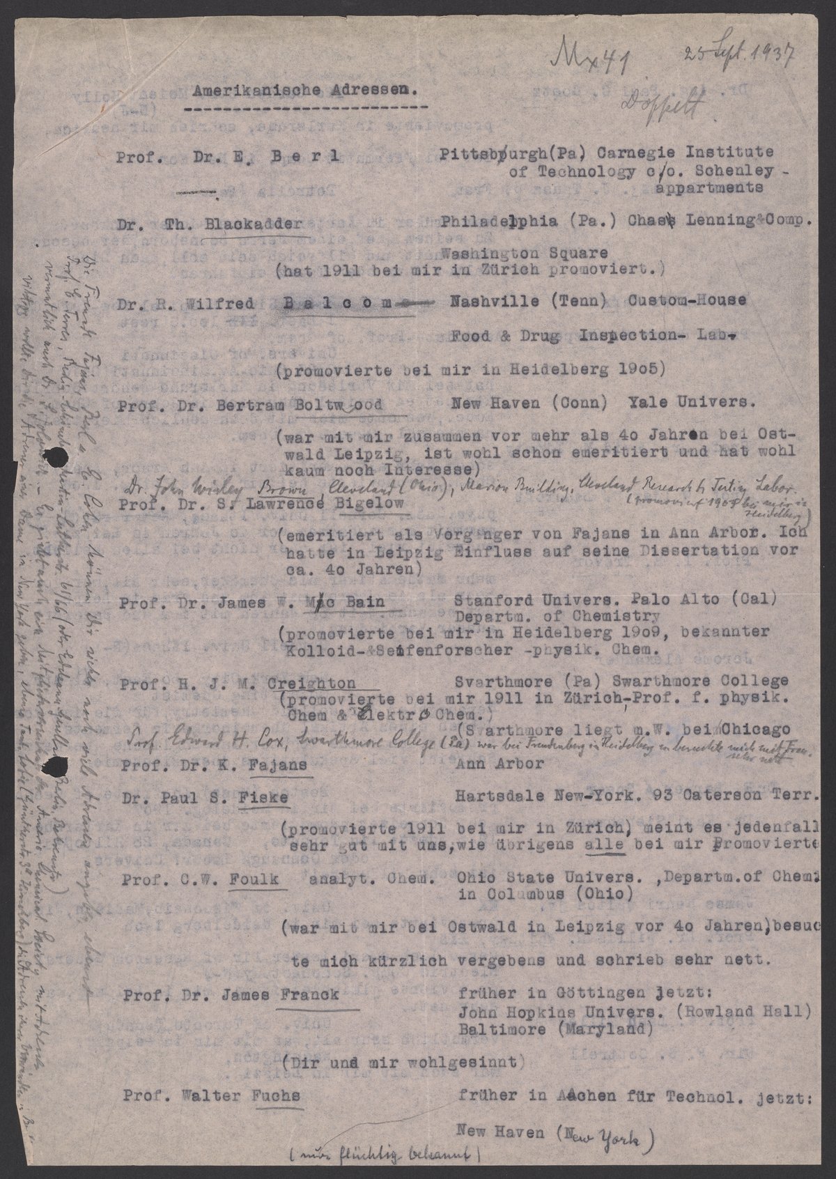 Small JPG1200 x 1692px — 410 KBLarge JPG2880 x 4061px — 2.6 MBFull-sized JPG5182 x 7307px — 7.9 MBOriginal fileTIFF — 5182 x 7307px — 108 MBList of colleagues and former students of Georg Bredig (1868-1944) living in the United States as of September 1937, including prominent figures as well as many lesser-known scientists. Notes institutional affiliations and addresses of the individuals, as well as explanations from Bredig as to how he knew them. Also includes occasional commentary as to whether Bredig believed respective individuals would be willing to help--presumably with emigration from Germany.