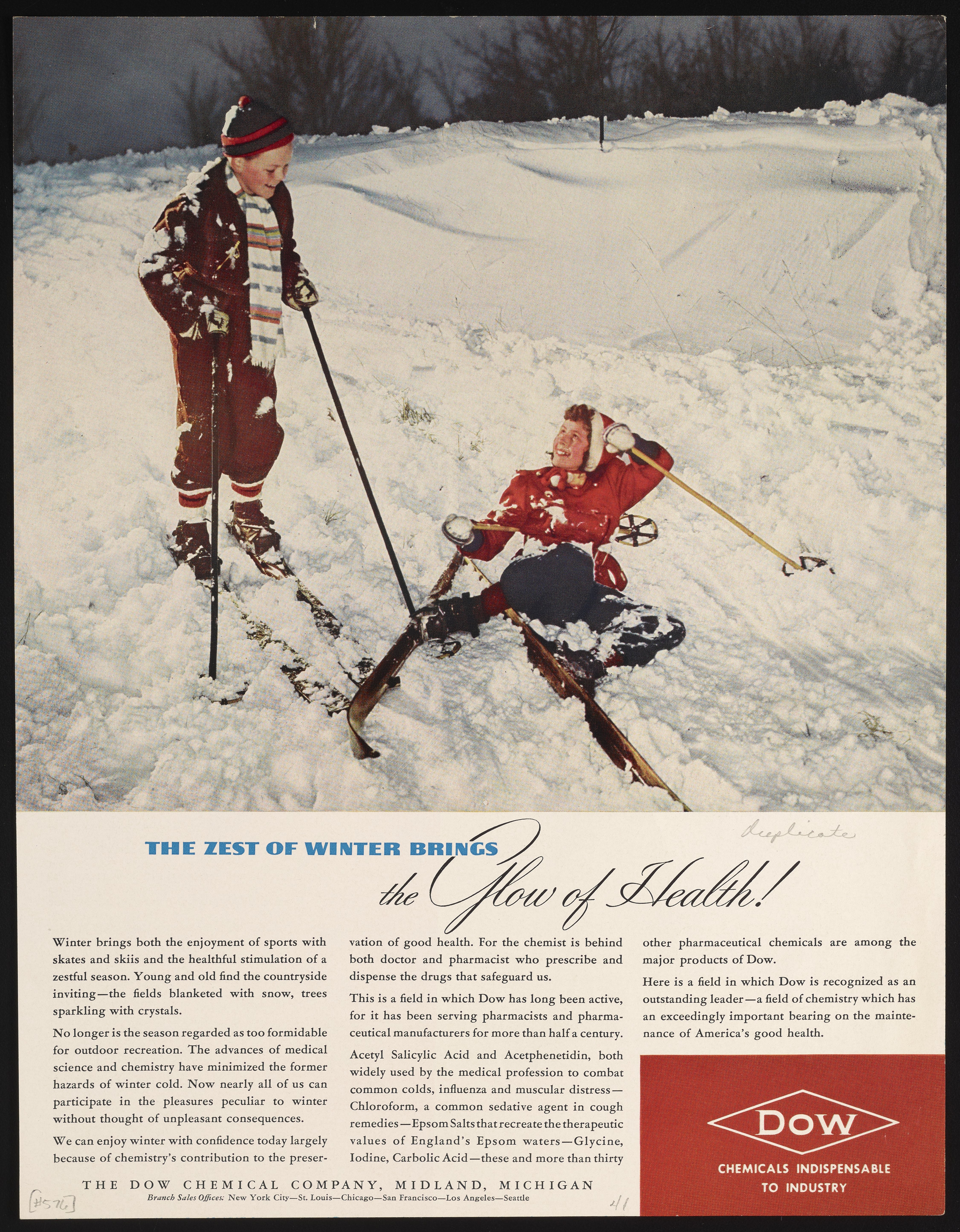 Color print advertisement for pharmaceutical chemicals produced by the Dow Chemical Company. The advertisement features a photographic reproduction of two children skiing. Accompanying text describes how "the advances of medical science and chemistry have minimized the former hazards of winter cold." The advertisement refers to Dow Chemical's production of pharmaceutical chemicals that are used in medicines to treat common winter illnesses. These include acetyl salicylic acid (also known as aspirin), acetophenetidin, chloroform and Epsom salts.