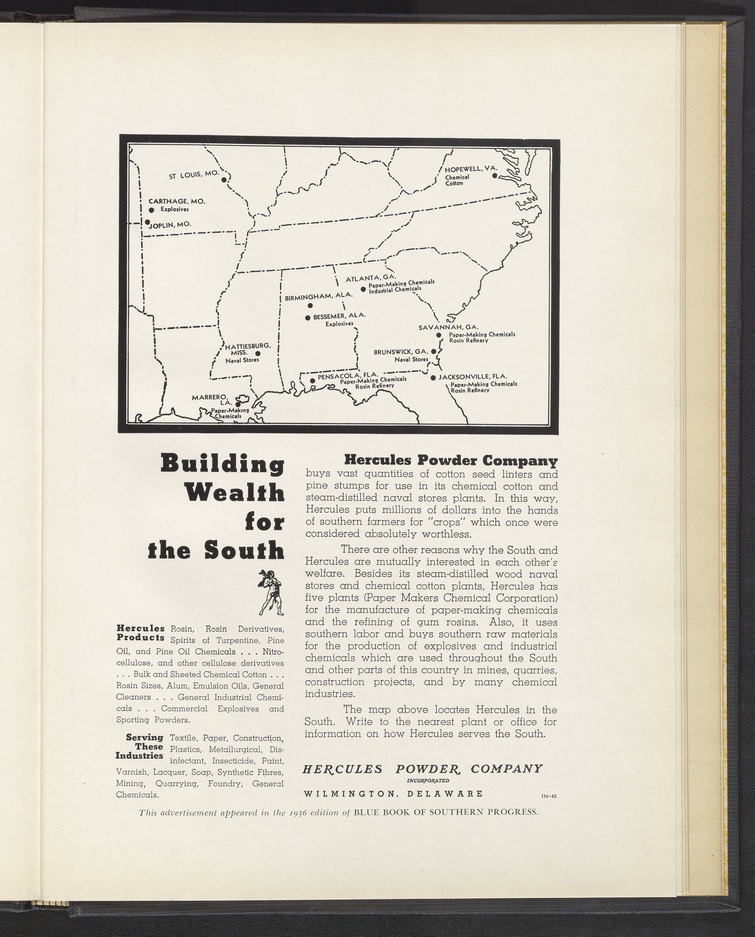 Hercules Incorporated. “Hercules Powder Company: Building Wealth for the New South.” 1936 Hercules Advertisements, 1936. Records of Hercules Incorporated, Volume 1936. Science History Institute. Philadelphia. https://digital.sciencehistory.org/works/v405sb260.