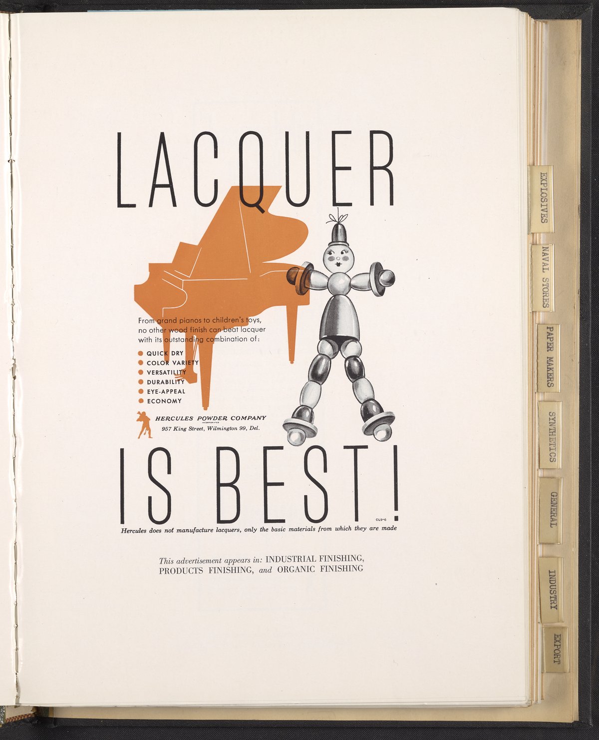 Color print advertisement for lacquer manufactured and sold by the Hercules Powder Company. The advertisement features an illustration of a wooden doll and a silhouette of a grand piano. The accompanying text lists some attributes of Hercules lacquers. This advertisement appeared in Industrial Finishing, Products Finishing, and Organic Finishing.