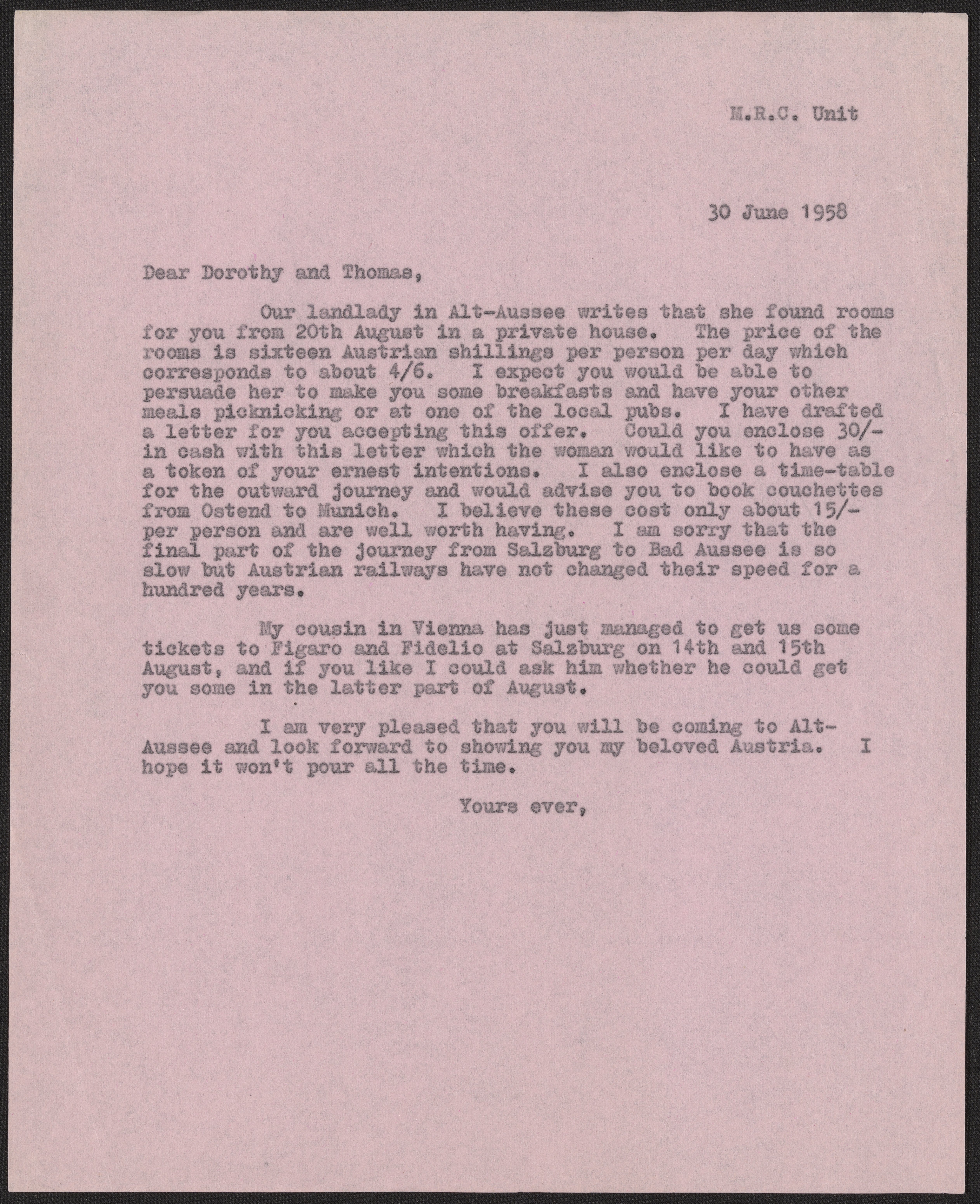 Letter from Max Perutz to Dorothy and Thomas Hodgkin, June 30, 1958
