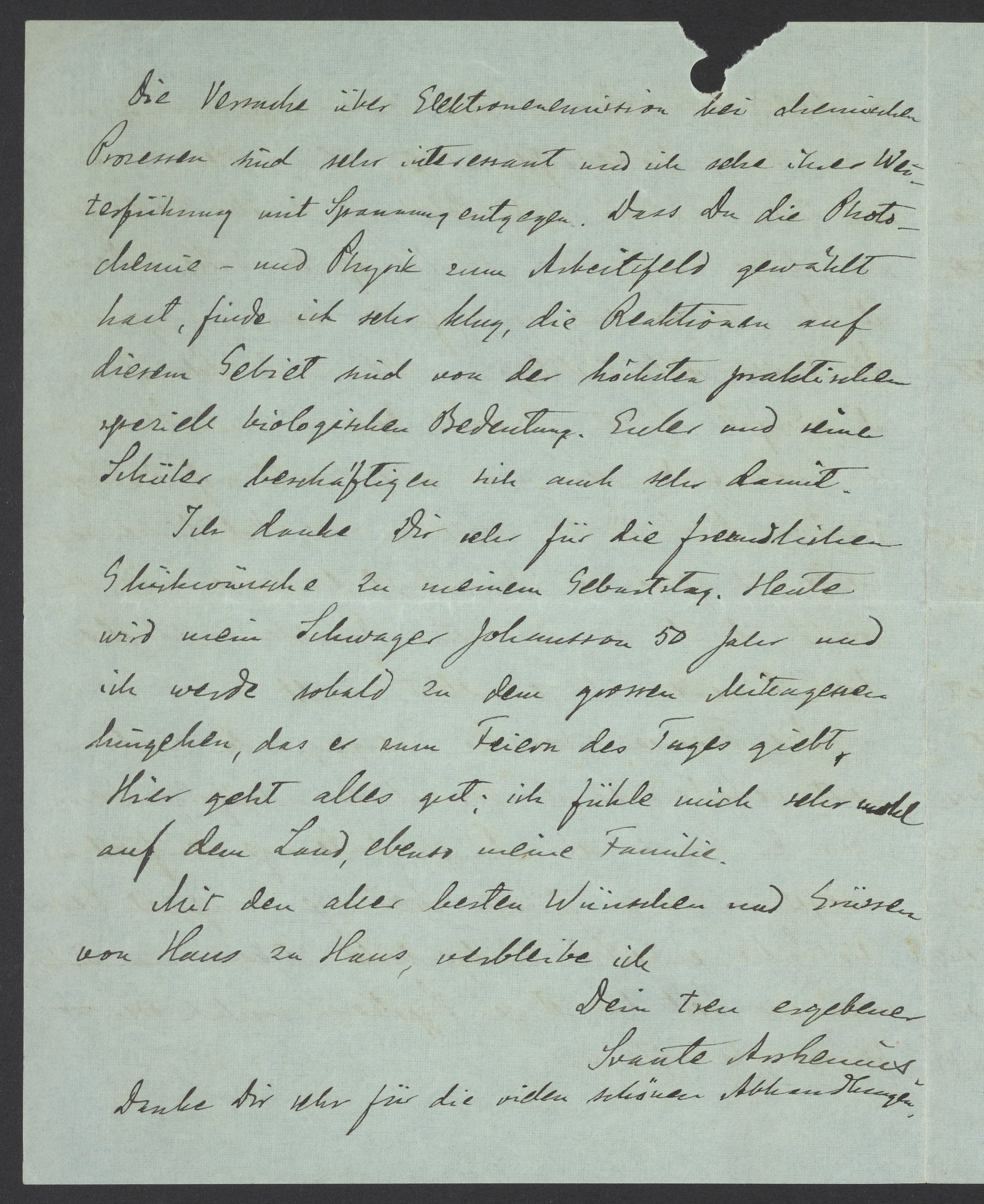 Die Versuche über Elektronenemission bei chemischen Prozessen sind sehr interessant und ich sehe ihrer Weiterführung mit Spannung entgegen. Dass Du die Photochemie – und Physik zum Arbeitsfeld gewählt hast, finde ich sehr klug, die Reaktionen auf diesem Gebiet sind von der höchsten praktischen speziell biologischen Bedeutung. Euler und seine Schüler beschäftigen sich auch sehr damit.