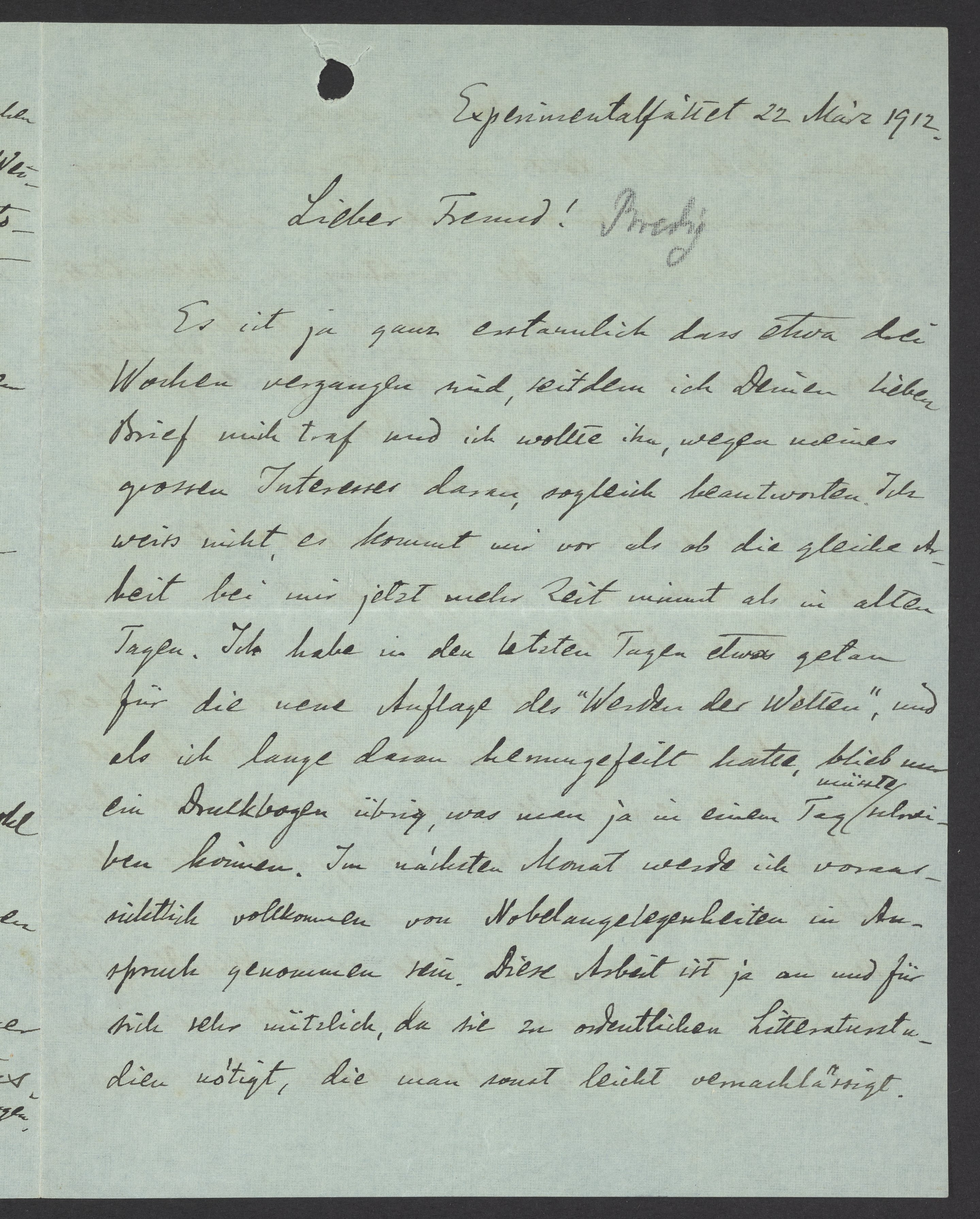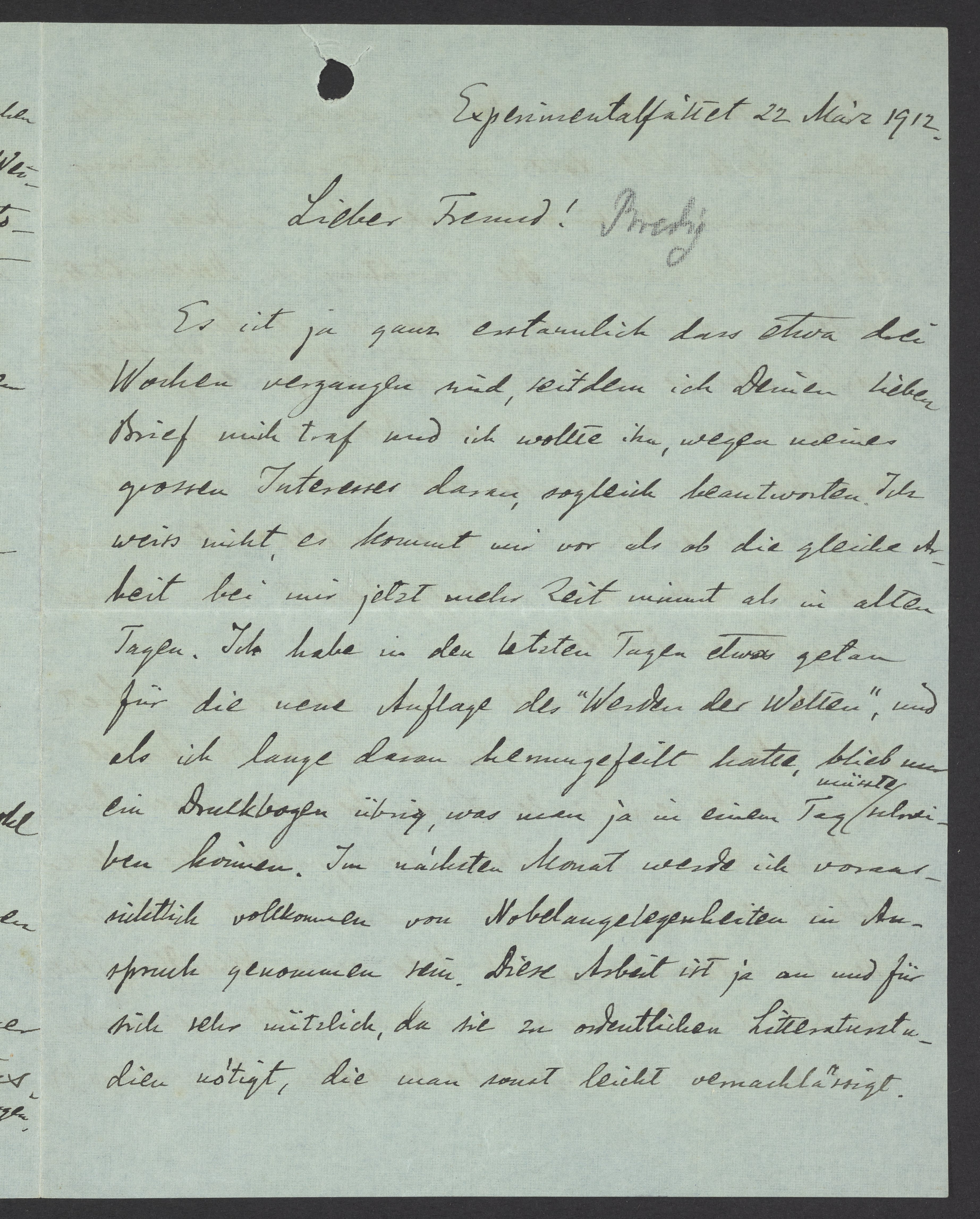 Es ist ja ganz erstaunlich dass etwa drei Wochen vergangen sind, seitdem ich Deinen lieben Brief mich traf und ich wollte ihm, wegen meines grossen Interesses daran, sogleich beantworten. Ich weiss nicht, es kommt mir vor als ob die gleiche Arbeit bei mir jetzt mehr Zeit nimmt als in alten Tagen. Ich habe in den letzten Tagen etwasgetan für die neue Auflage des "Werden der Welten", und als ich lange daran herumgefeilt hatte, blieb mir ein Druckbogen übrig, was man ja in einen Tag müsste schieben können. Im nächsten Monat werde ich voraussichtlich vollkommen von Nobelgelegenheiten in Anspruch genommen sein. Diese Arbeit ist ja an und für sich sehr nützlich, da sie zu ordentlichen Litteraturstudien nötigt, die man sonst leicht vernachlässigt.
