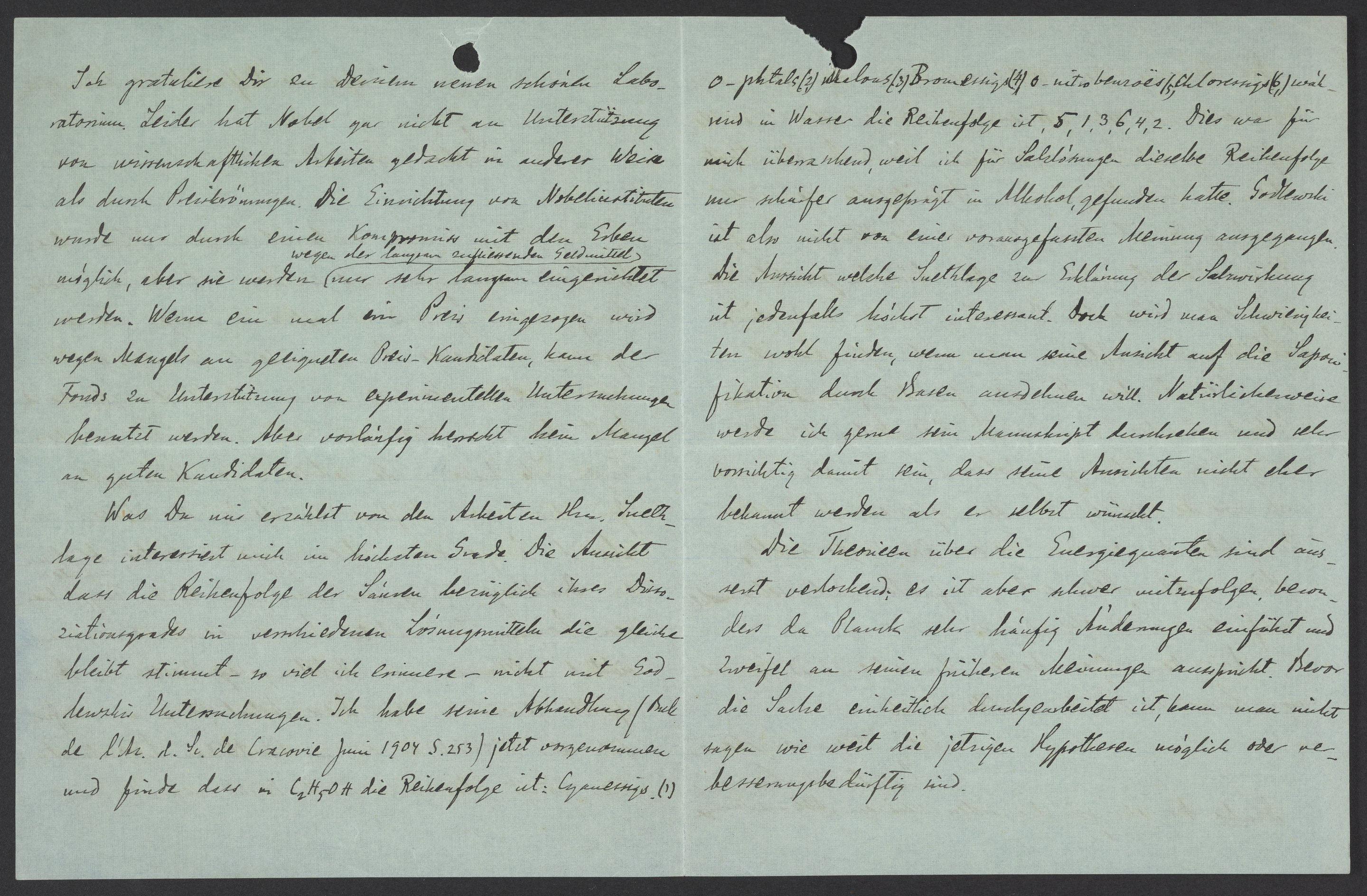 Ich gratuliere Dir zu Deinem neuen schönen Laboratorium. Leider hat Nobel gar nicht an Unterstützung von wissenschaftlichen Arbeiten gedacht in anderer Weise als durch Preiskrönungen. Die Einrichtung von Nobelinstituten wurde nur durch einen Kompromiss mit den Erben möglich, aber sie werden wegen der langen zufliessenden Geldmittel nur sehr langsam eingerichtet werden. Wenn ein und ein Preis eingezogen wird wegen Geldmangels an geligneten Preis-Kandidaten, kann der Fonds zu Unterstützung von experimentellen Untersuchungen benutzt werden. Aber vorläufig herrscht kein Mangel an guten Kandidaten.