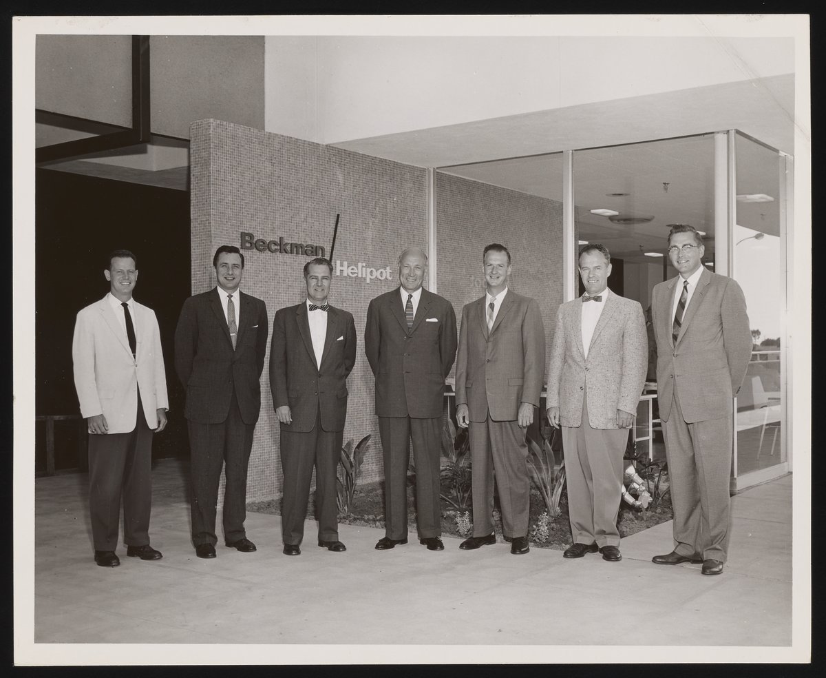 Helipot was a division of Beckman Instruments, Inc., and manufactured potentiometers and other electronic components. Arnold O. Beckman (founder of Beckman Instruments) is at center. The other men in this photograph are unidentified.