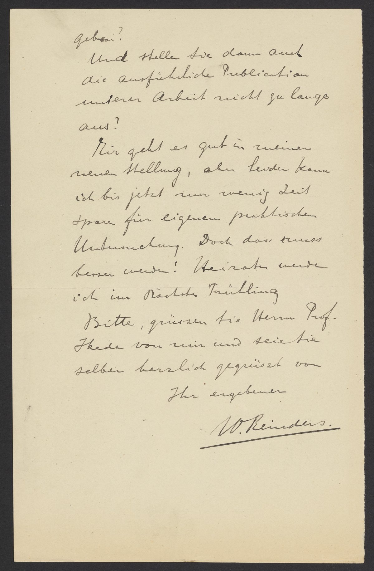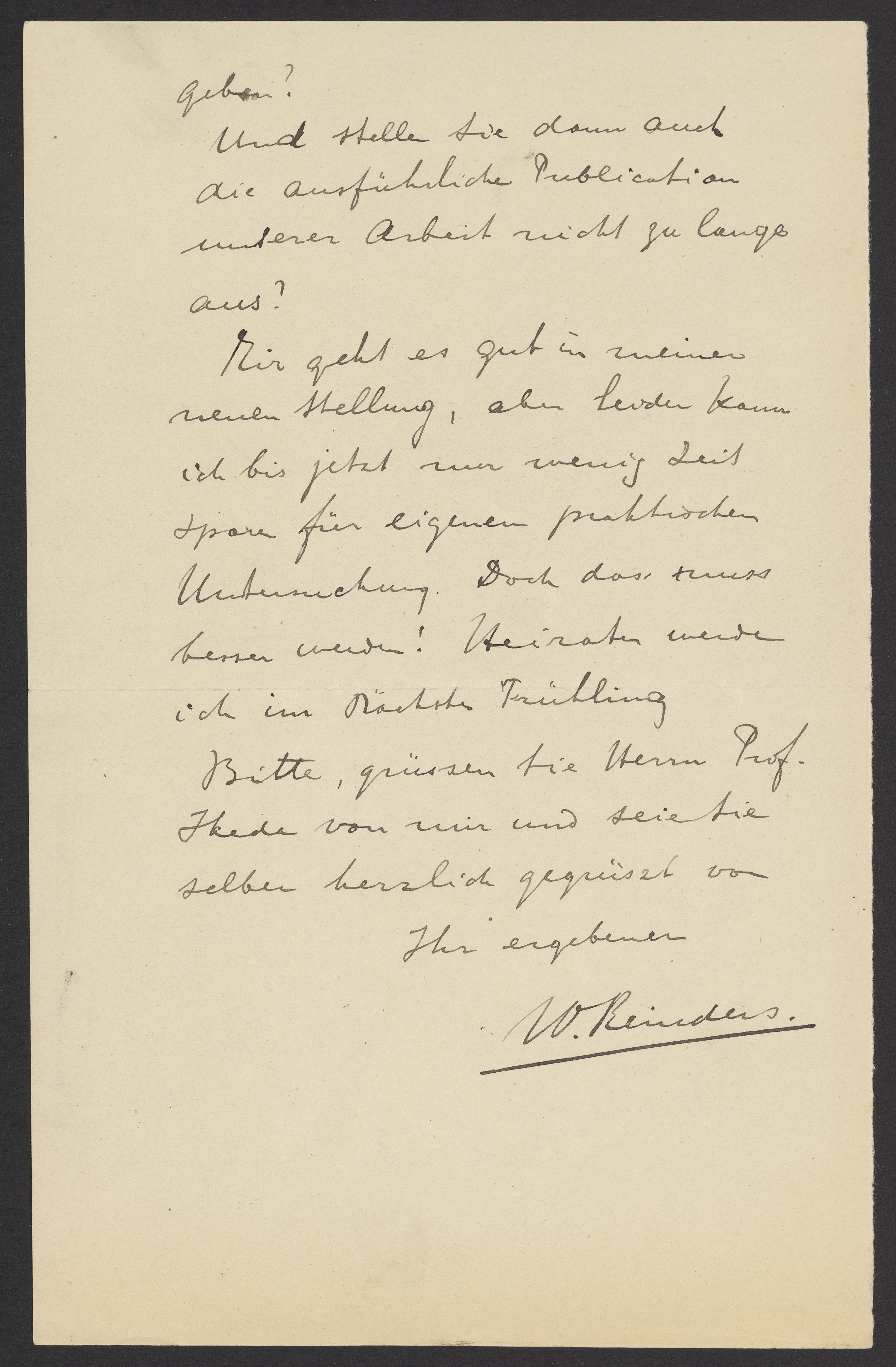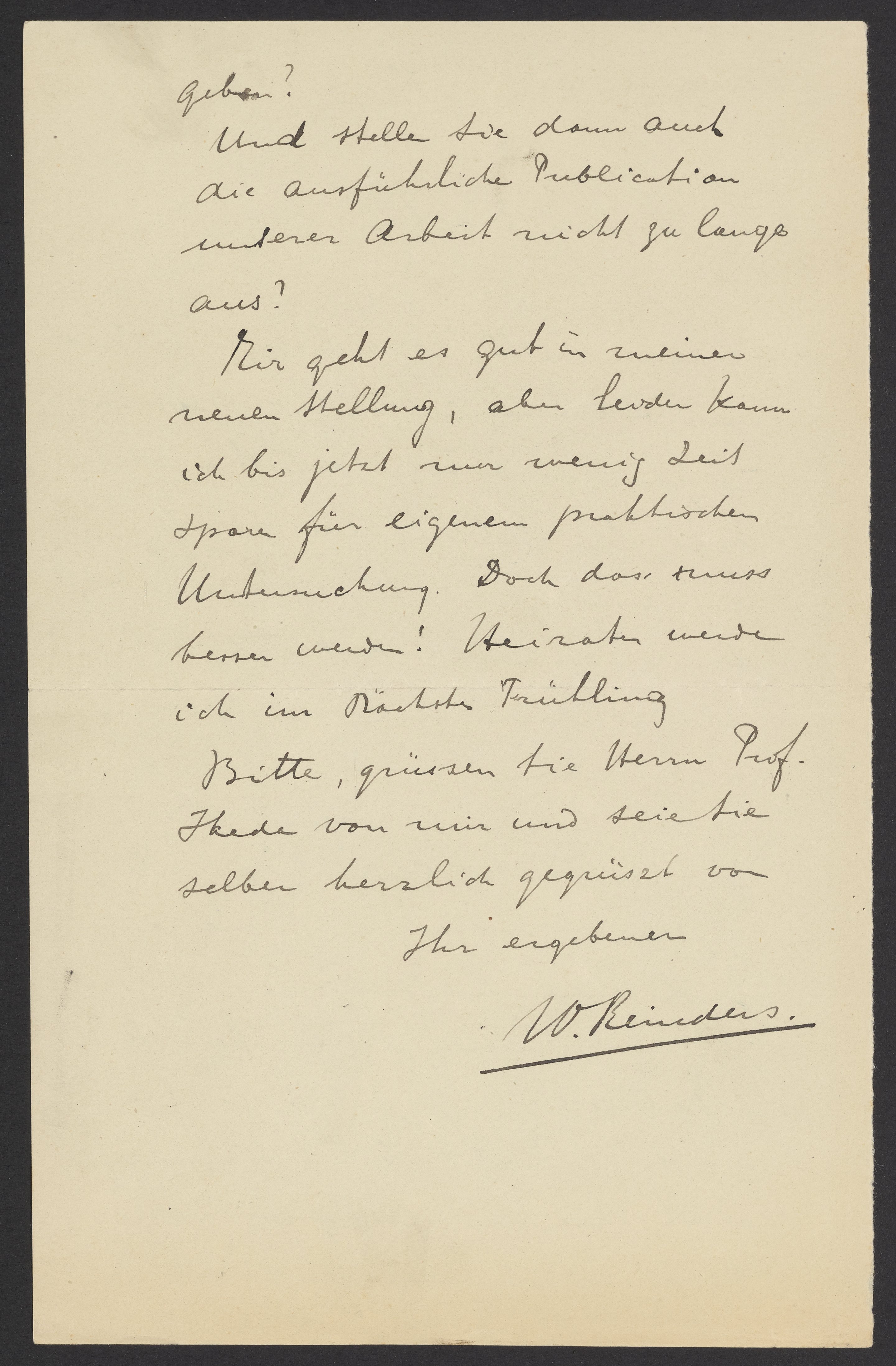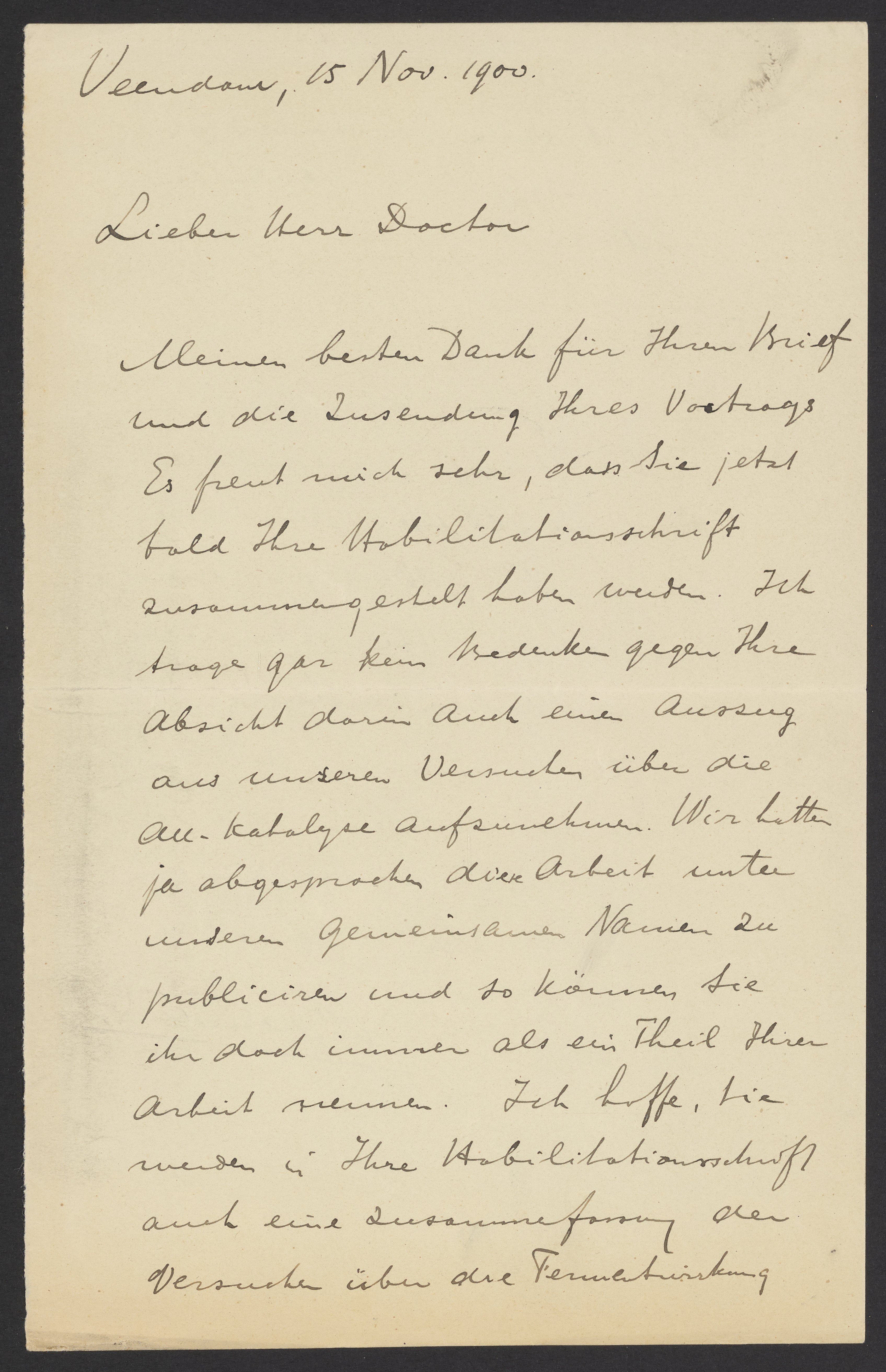 Meinen besten Dank für Ihren Brief und die Zusendung Ihres Vortrags. Es freut mich sehr, dass Sie jetzt bald Ihre Habilitationsschrift zusammengestellt haben werden. Ich trage gar kein Bedenken gegen Ihre Absicht darin auch einen Auszug aus unseren Versuchen über die AU Katalyse aufzunehmen. Wir hatten ja abgesprochen diese Arbeit unter unserem Gemeinsamen Namen zu publicieren und so können ihr doch immer als ein Theil Ihrer Arbeit nennen. Ich hoffe, Sie werden in Ihre Habilitationsschrift auch eine Zusammenfassung der Versuchen über die Serumentwicklung