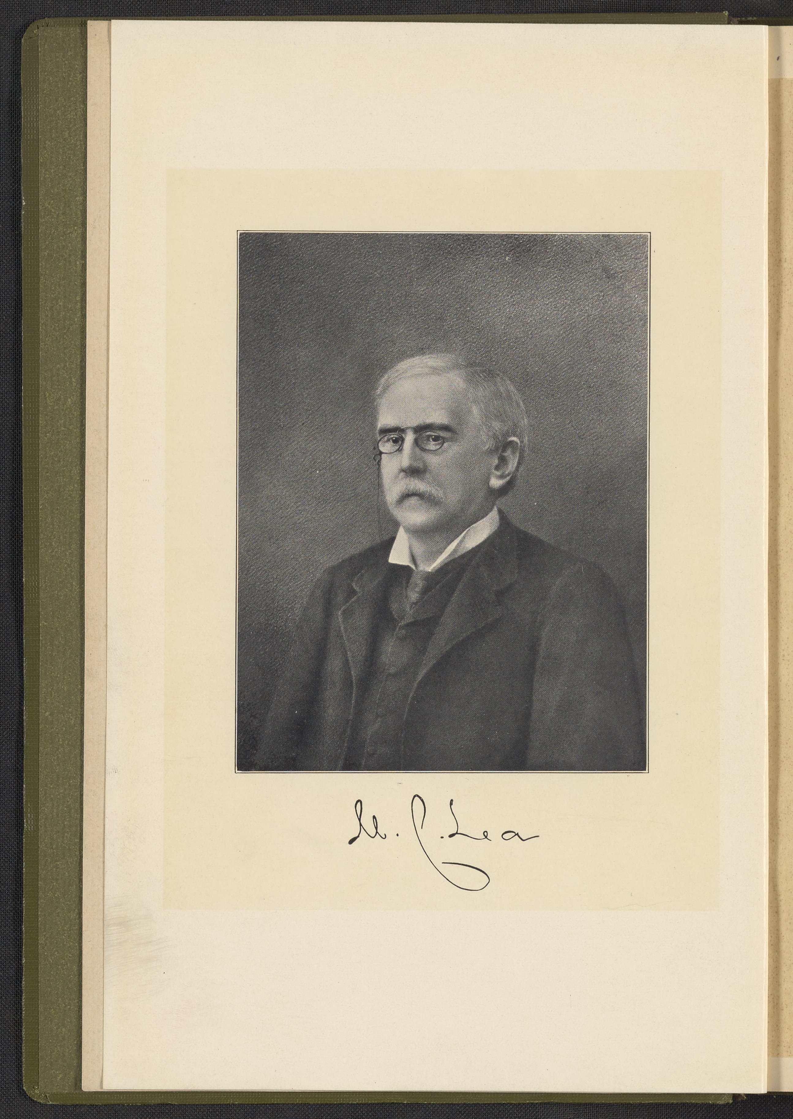 Frontispiece depicting an engraved portrait and signature of Matthew Carey Lea (1823-1897). Lea, a Philadelphian lawyer and scientist, was devoted to the chemistry of photography. He is known as the father of mechanochemistry due to his observations of silver halide decomposition by trituration.