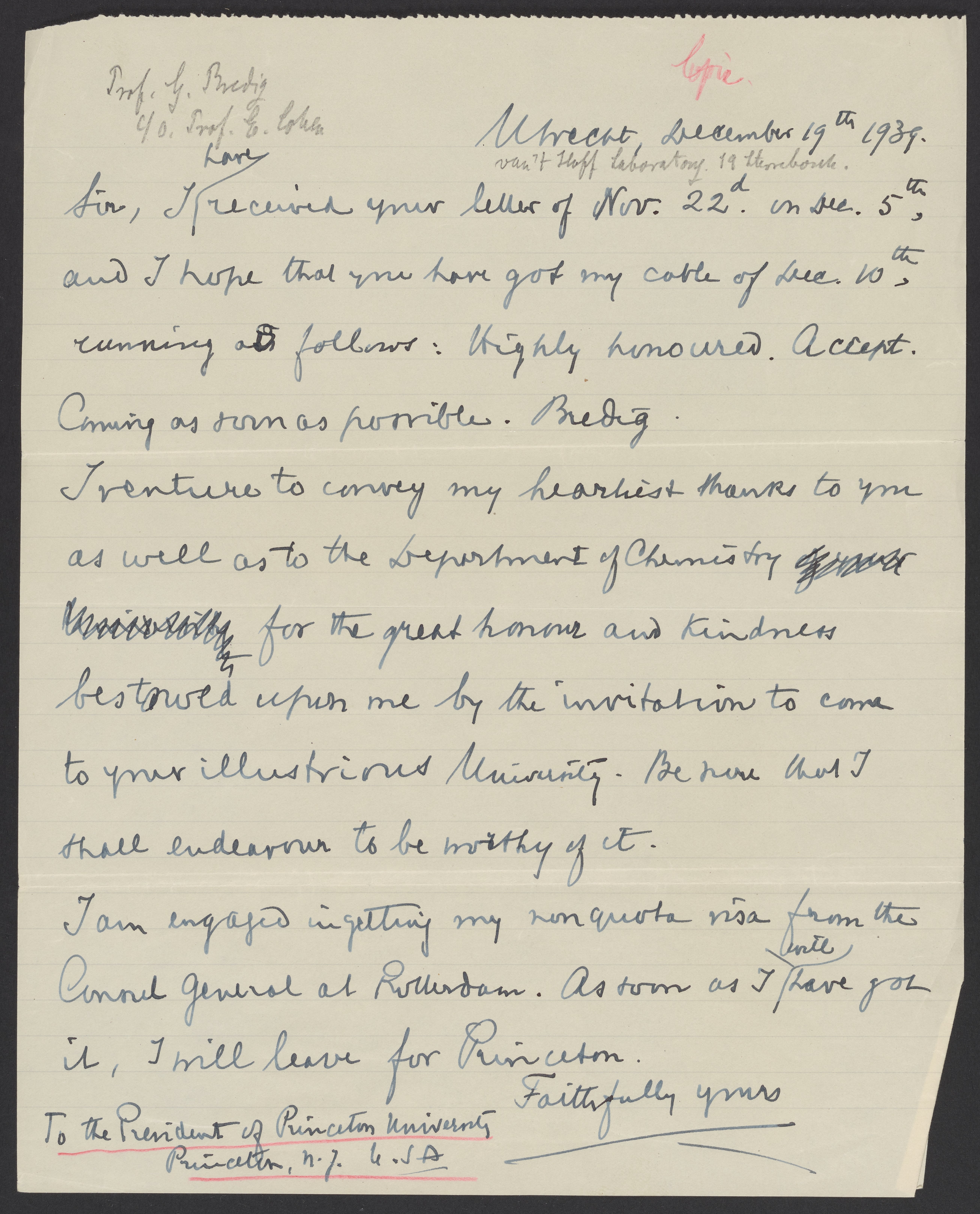 Letter from Georg Bredig (1868-1944) to Harold Willis Dodds (1889-1980), the president of Princeton University. Bredig thanks Dodds for the invitation to be a professor at Princeton and tells him he will be leaving as soon as possible.