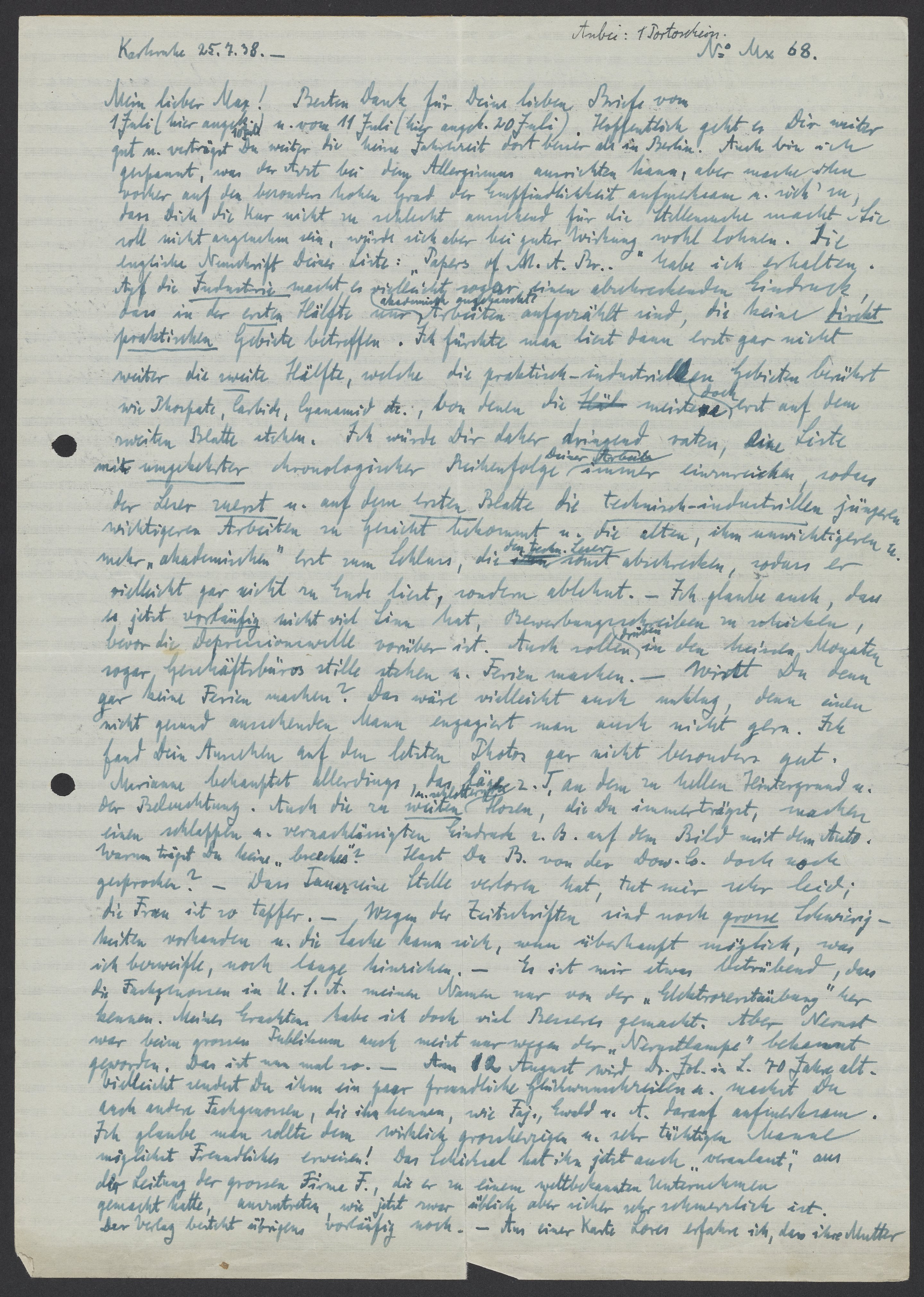Letter from Georg Bredig to Max Bredig, July 25, 1938