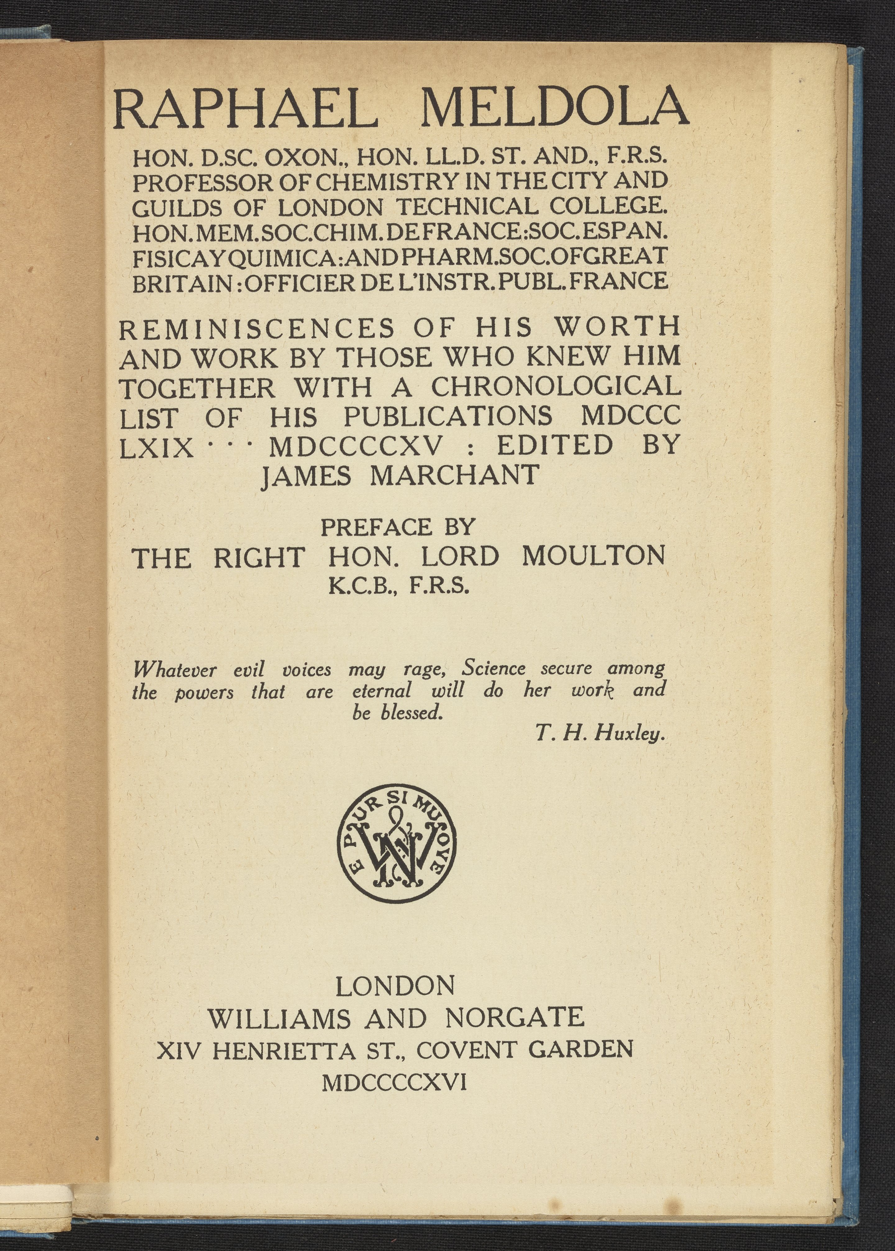 Marchant, James, Sir. “Raphael Meldola.” London, England: Williams & Norgate, 1916. https://digital.sciencehistory.org/works/vcs937d.