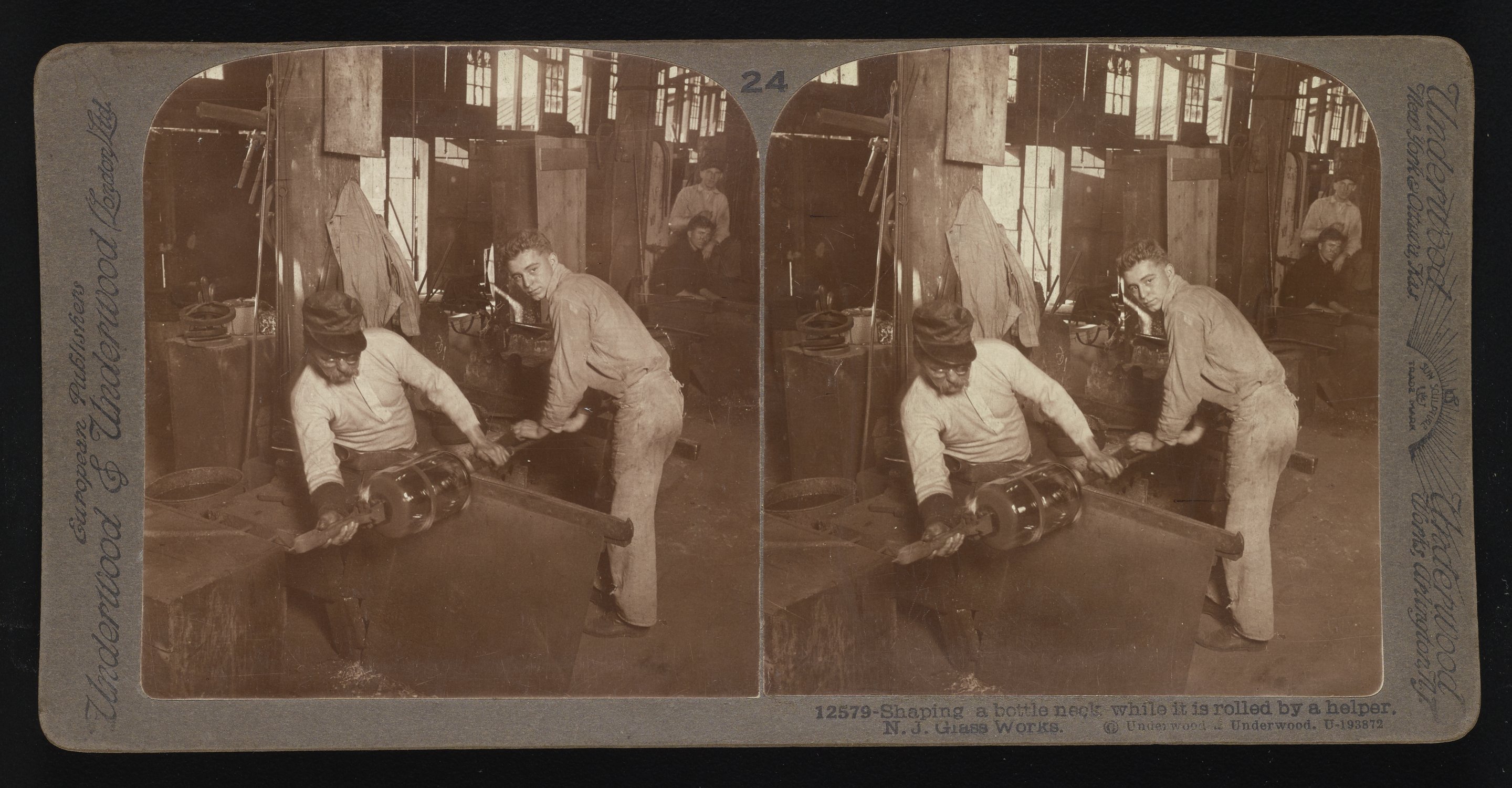 “Shaping a Bottle Neck, While It Is Rolled by a Helper.” Underwood & Underwood, n.d. Underwood & Underwood Stereographs of Manufacturing Industries. Science History Institute. Philadelphia. https://digital.sciencehistory.org/works/vd66vz89n.