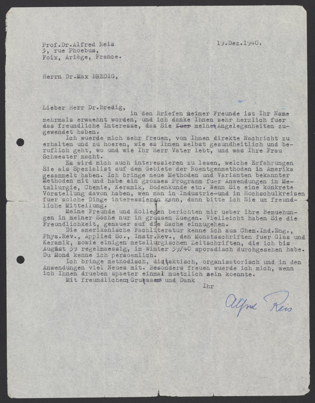 Reis, Alfred J. “Letter from Alfred Reis to Max Bredig, December 19, 1940,” December 19, 1940. Papers of Georg and Max Bredig, Box 9, Folder 5. Science History Institute. Philadelphia. https://digital.sciencehistory.org/works/ve1y645.