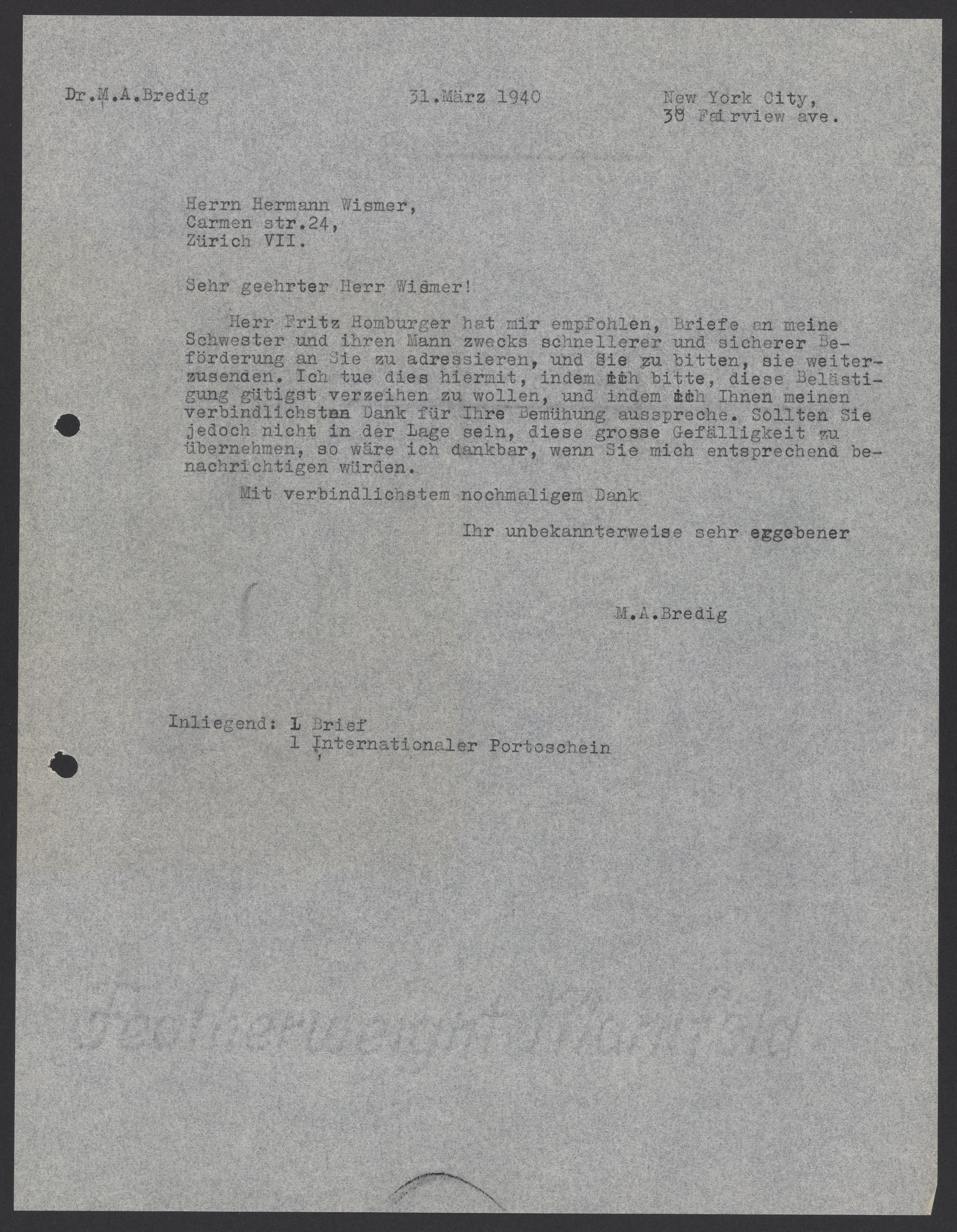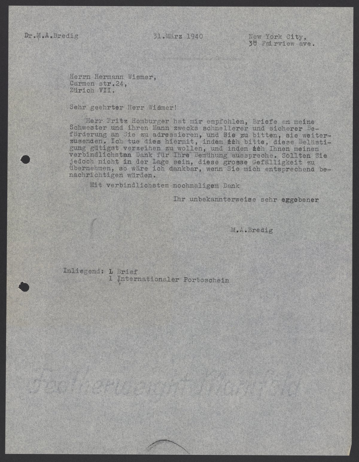 Letter from Max Bredig to Hermann Wismer, March 1940