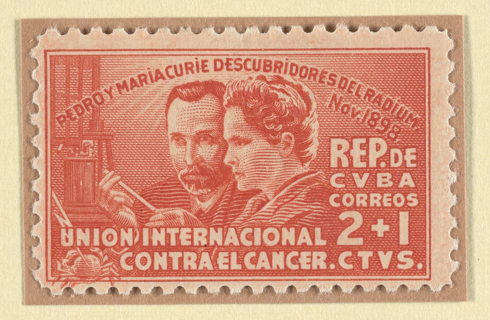 Stamp printed by the Republic of Cuba, depicting Marie and Pierre Curie. The 40th anniversary of the discovery of radium by Marie and Pierre Curie was commemorated in France in 1938 with the release of a semipostal stamp bearing a 50-cent surtax to benefit the International Union Against Cancer. The French Postal Service expected member countries of the Universal Postal Union to prepare a similar stamp, but only Monaco and Cuba (above) did so. Due to the lack of response, France issued stamps for 21 of its colonies, with each stamp having an identical design except for the name of the colony.