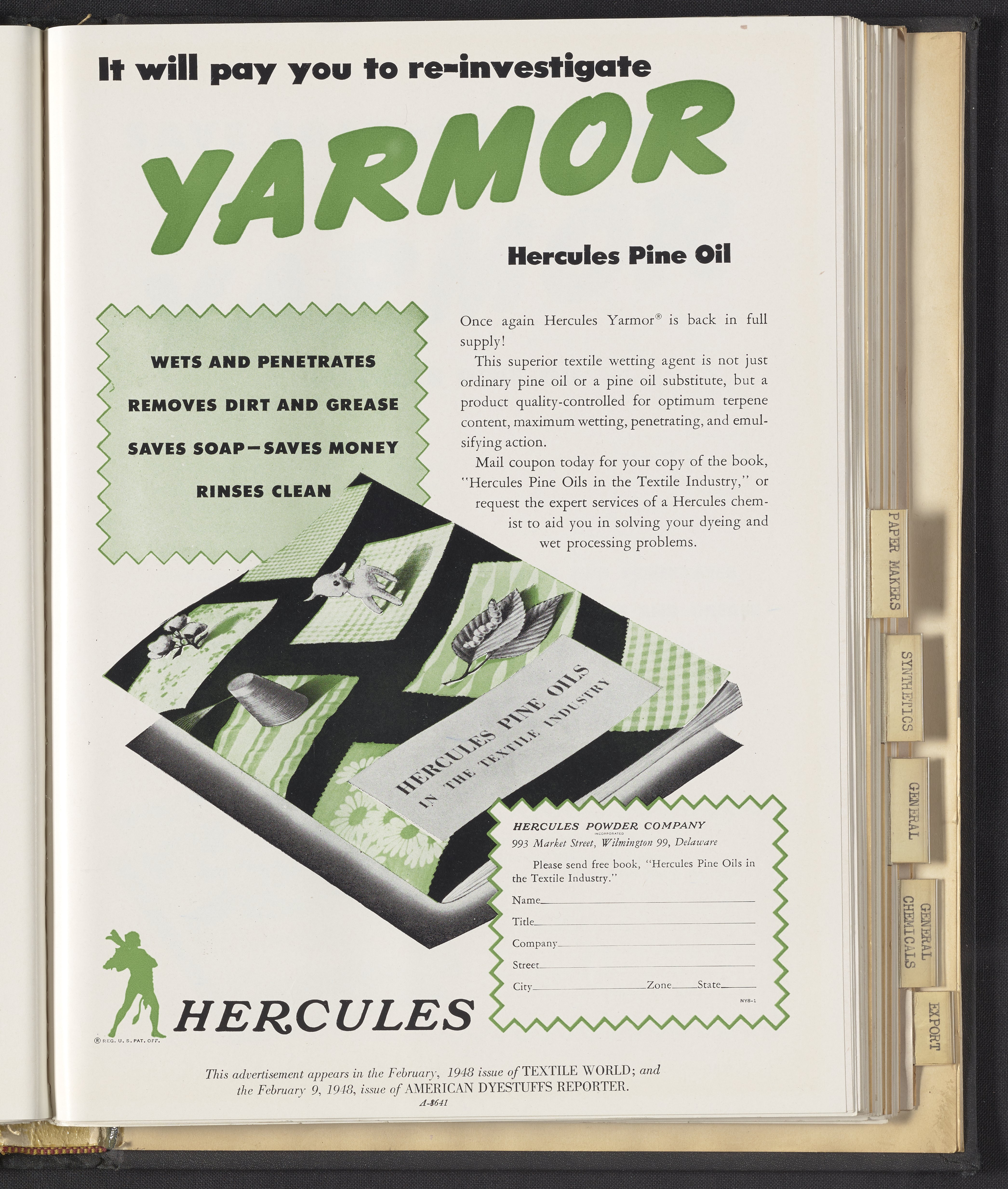 Advertisement for Yarmor Pine Oil manufactured and sold by the Hercules Powder Company for use in the dyeing and wet processing of textiles. This advertisement appeared in February 1948 issues of Textile World and American Dyestuffs Reporter.