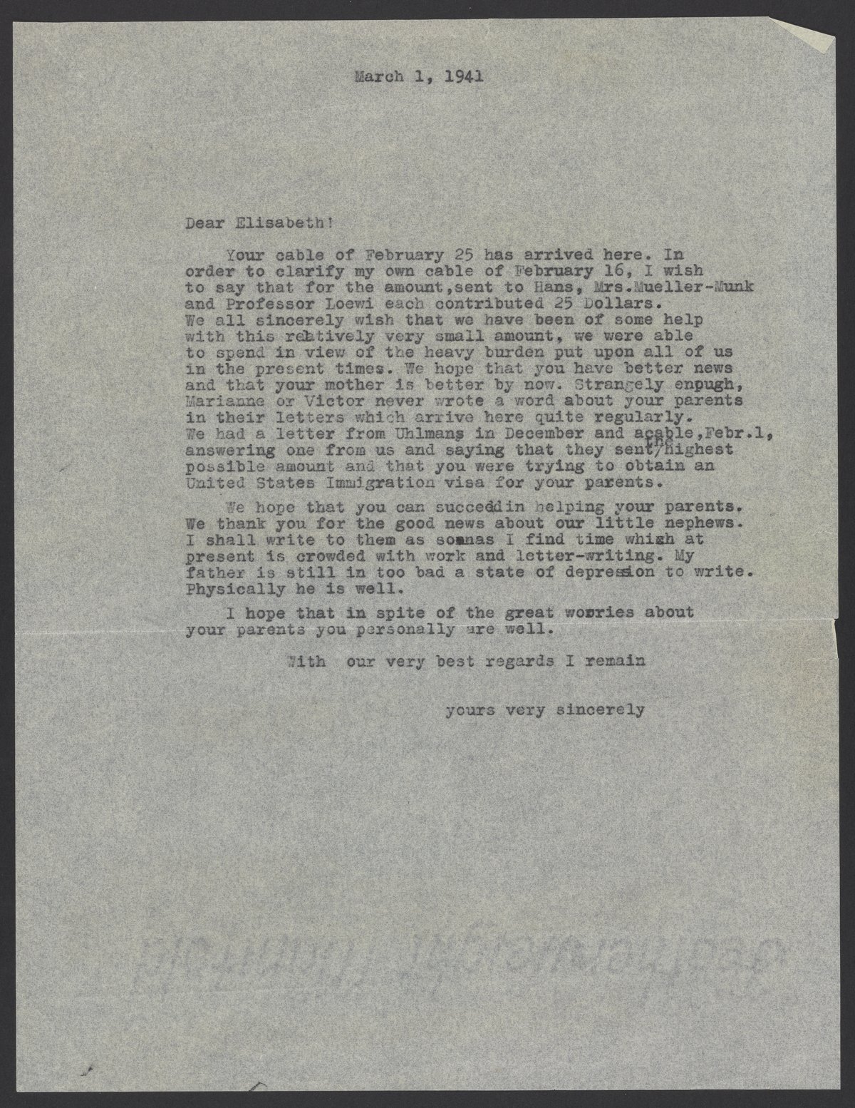 Letter from Max Bredig to Elisabeth Neumann, March 1, 1941