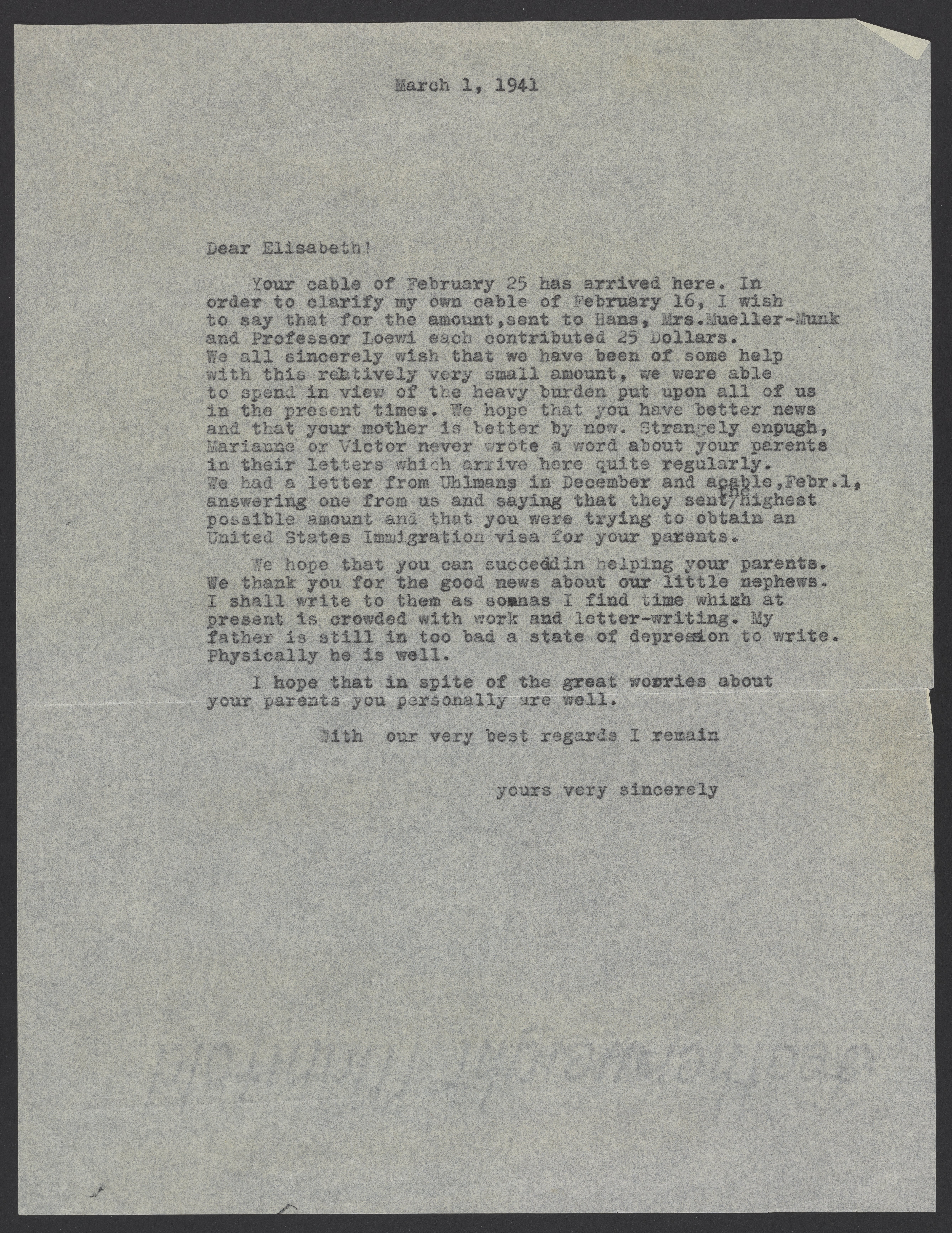 Letter from Max Bredig to Elisabeth Neumann, March 1, 1941