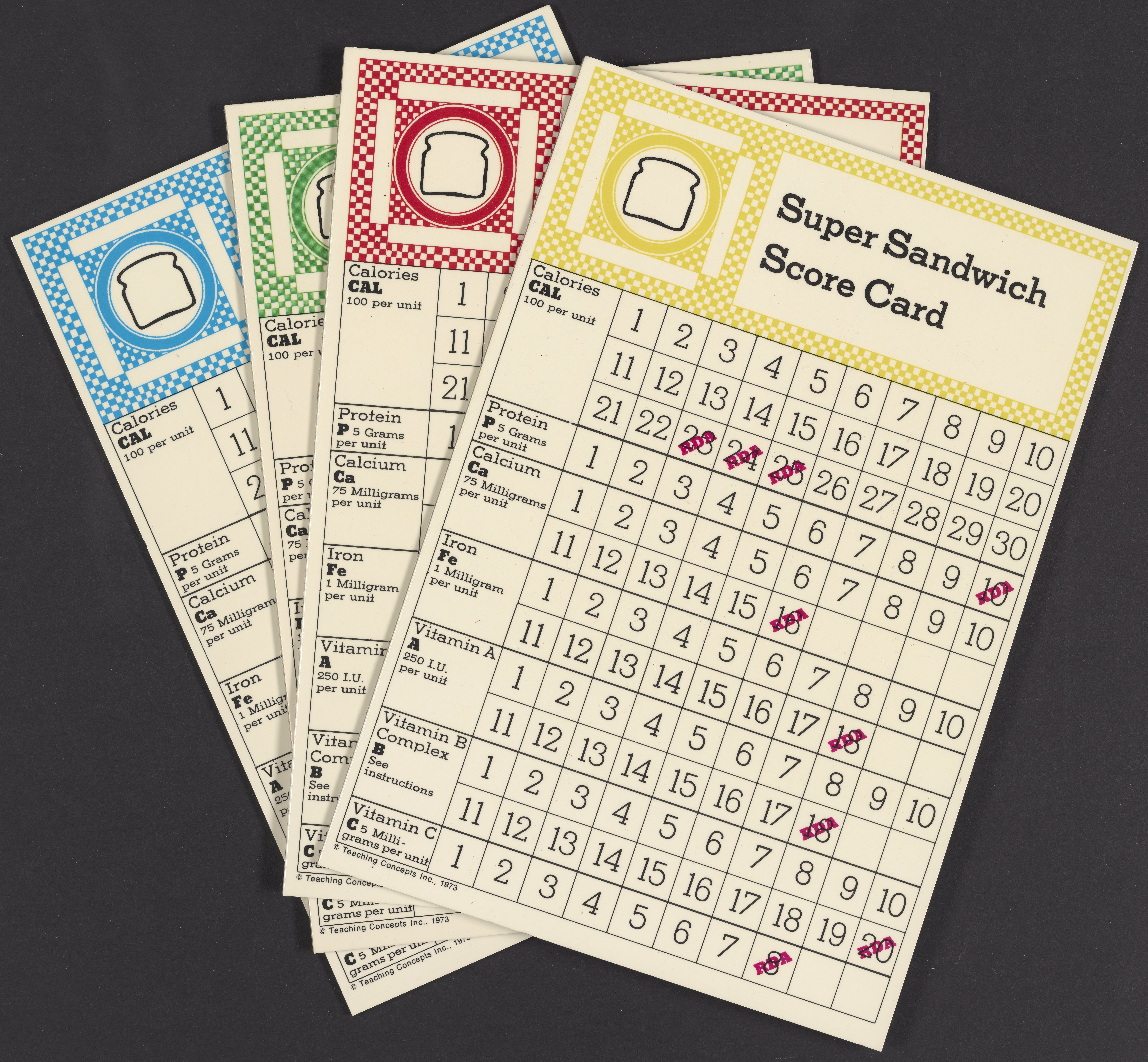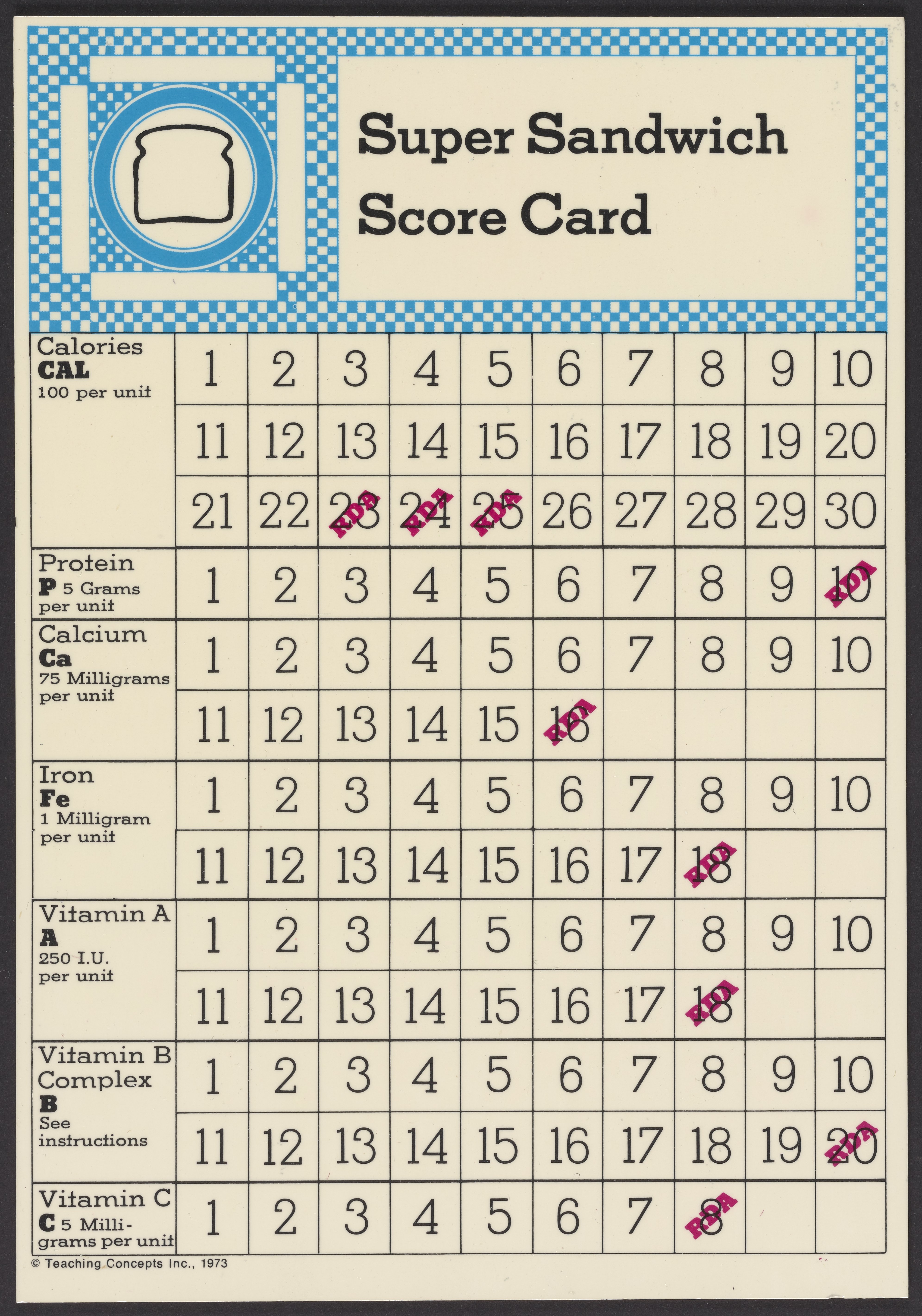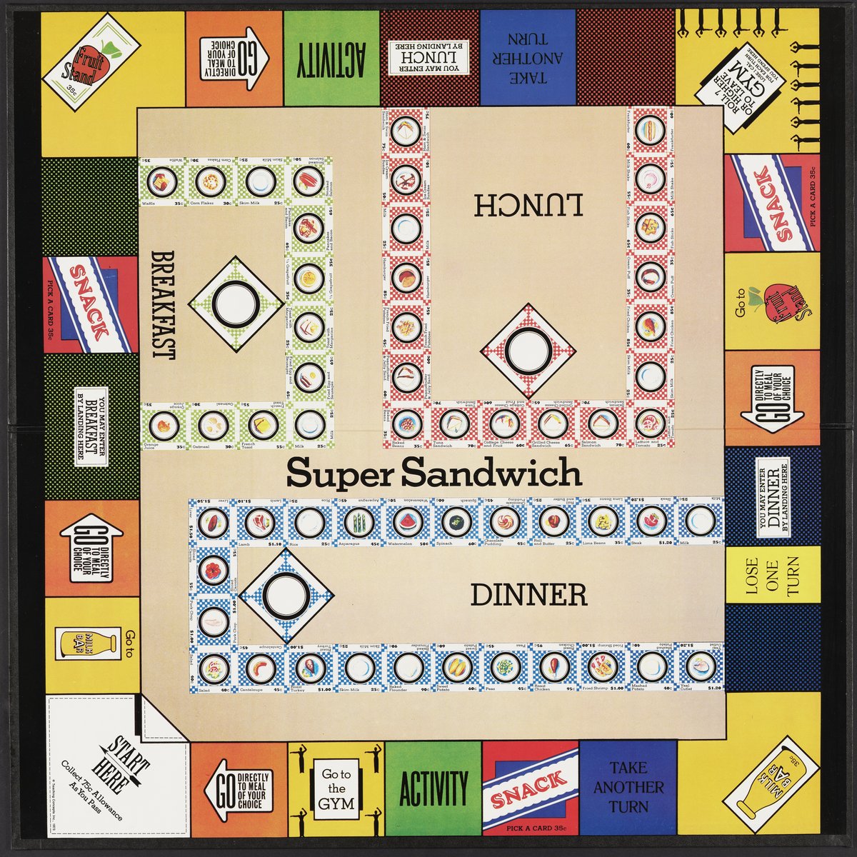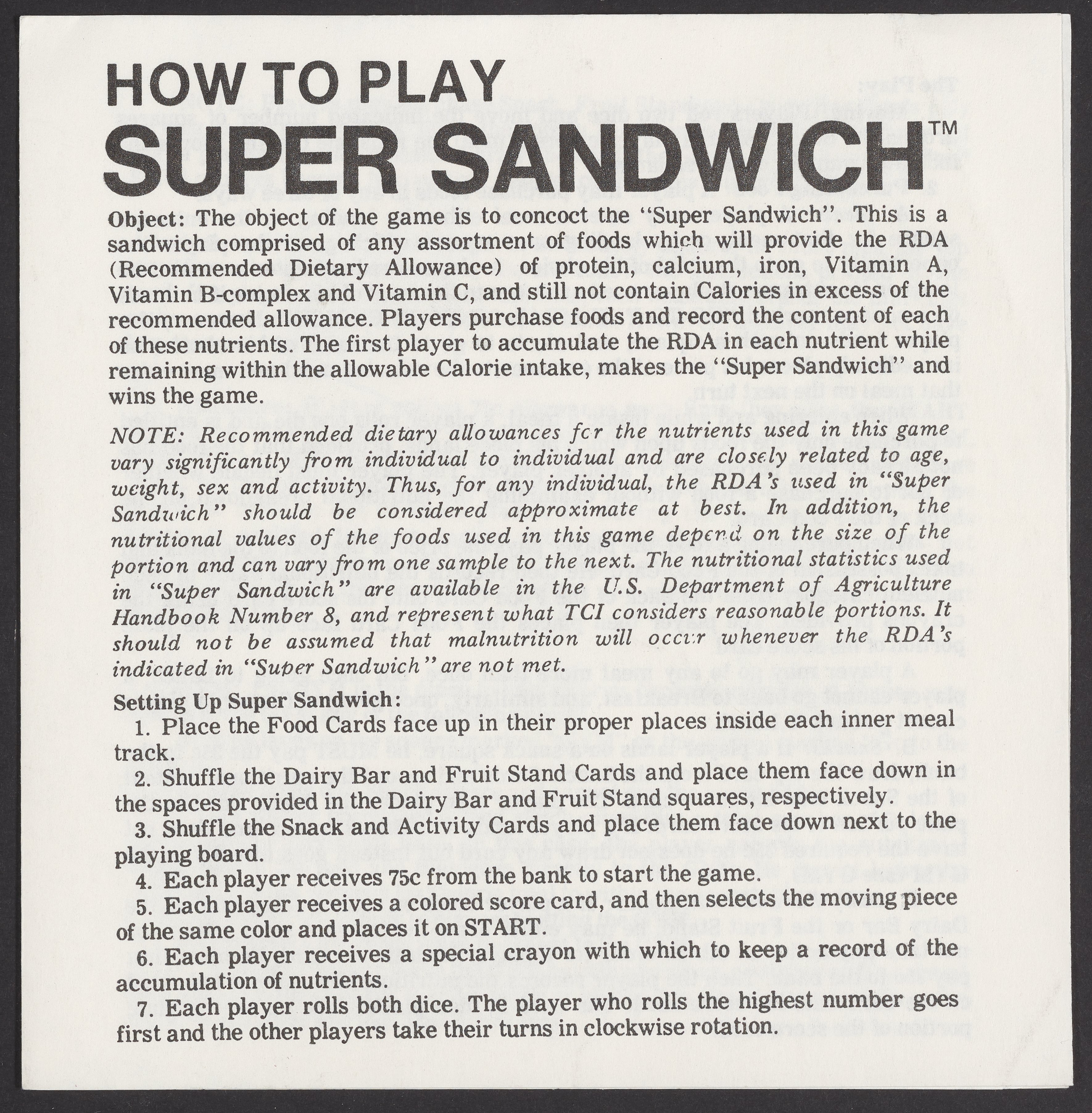 Small JPG1200 x 1200px — 393 KBLarge JPG2880 x 2880px — 1.9 MBFull-sized JPG11189 x 11189px — 31.6 MBOriginal fileTIFF — 11189 x 11189px — 358 MBSuper Sandwich board game, 1973. The object of the game is to create a "super sandwich" comprised of ingredients that will provide the RDA (Recommended Dietary Allowance) of protein, calcium, iron, vitamin A, vitamin B-complex and vitamin C while not exceeding the RDA of calories. Players purchase foods and record the content of each nutrient found in these foods. The first player to accumulate the RDA of each nutrient while remaining within the allowable calorie intake makes a "super sandwich" and wins the game.