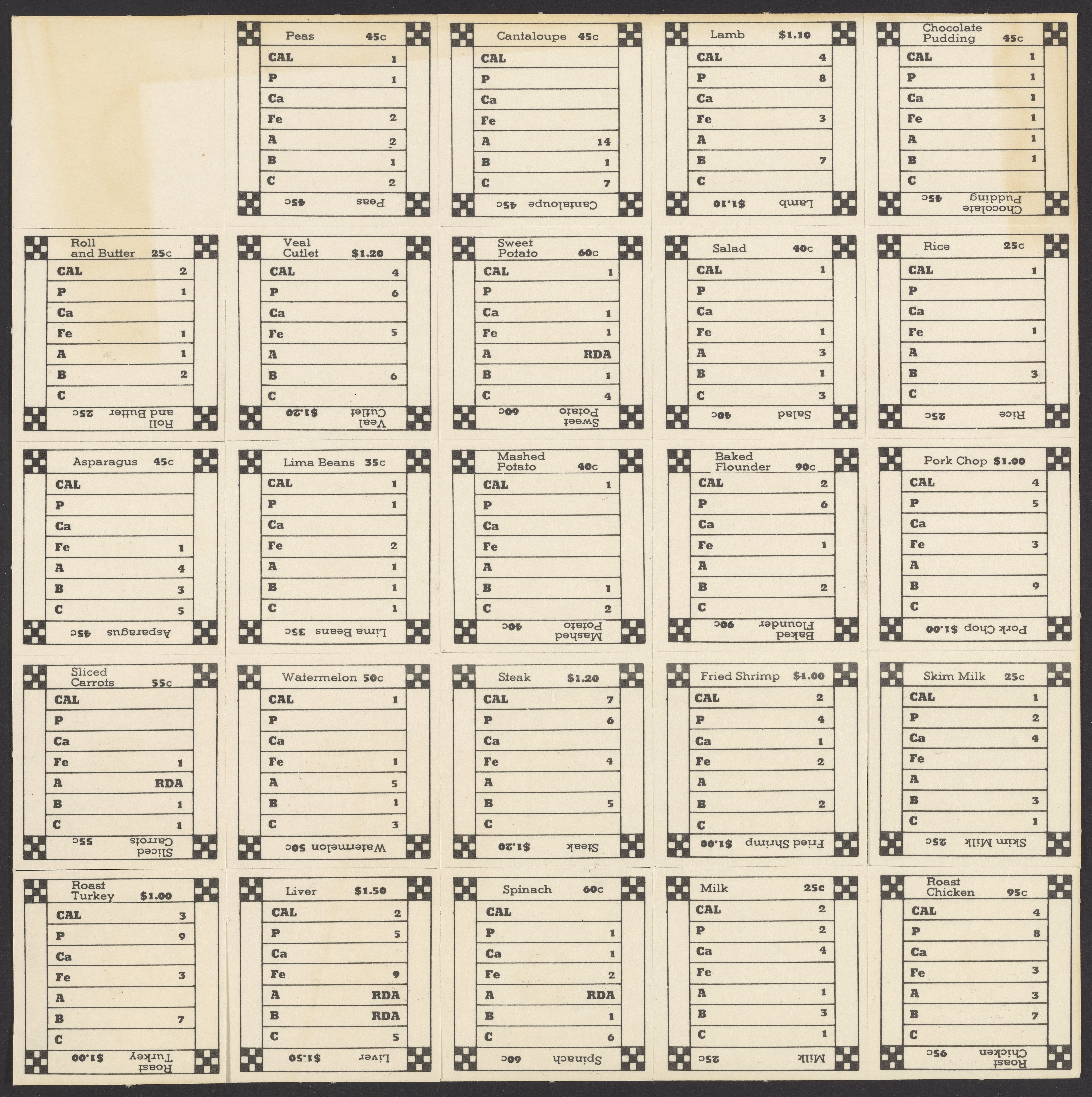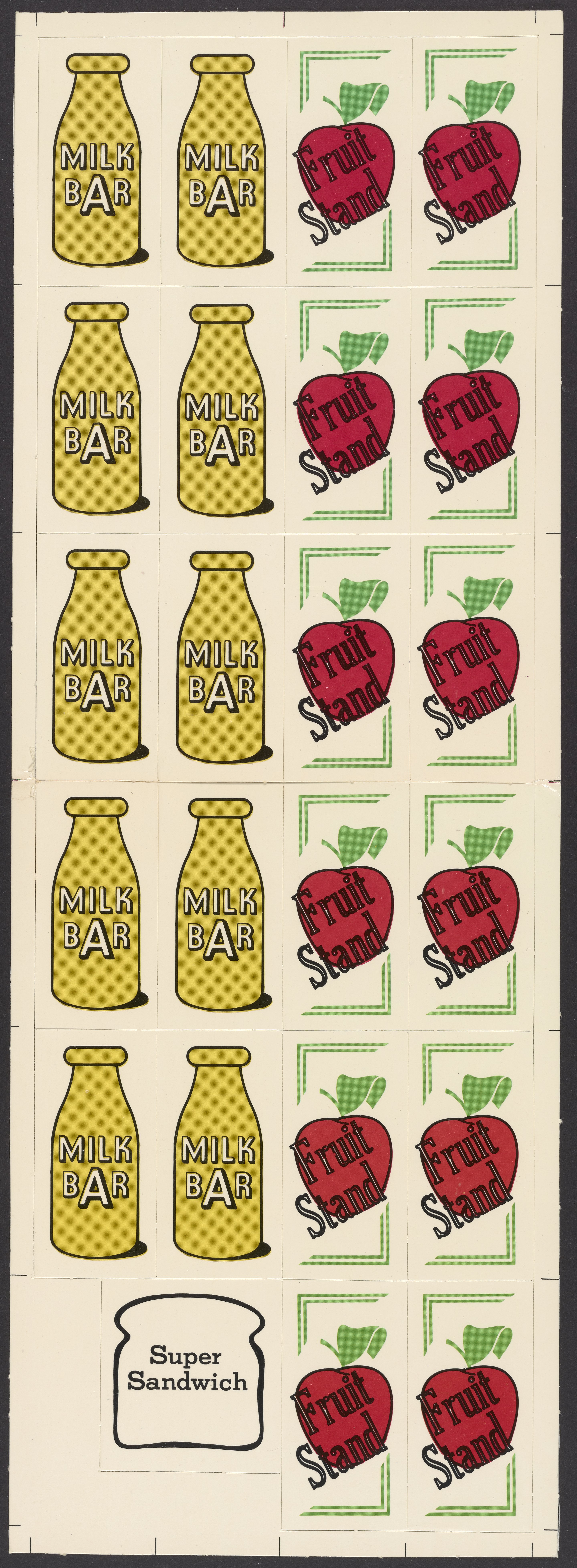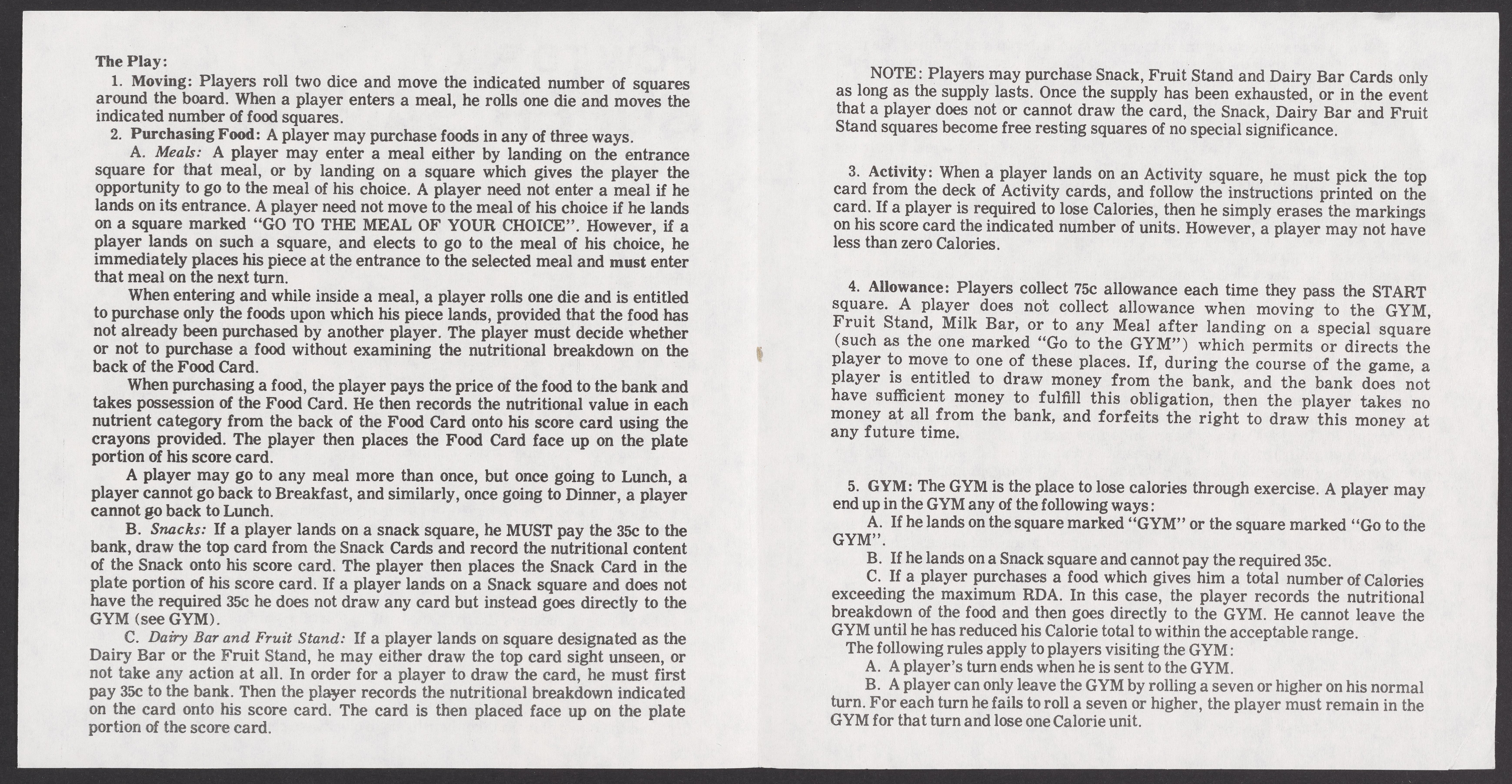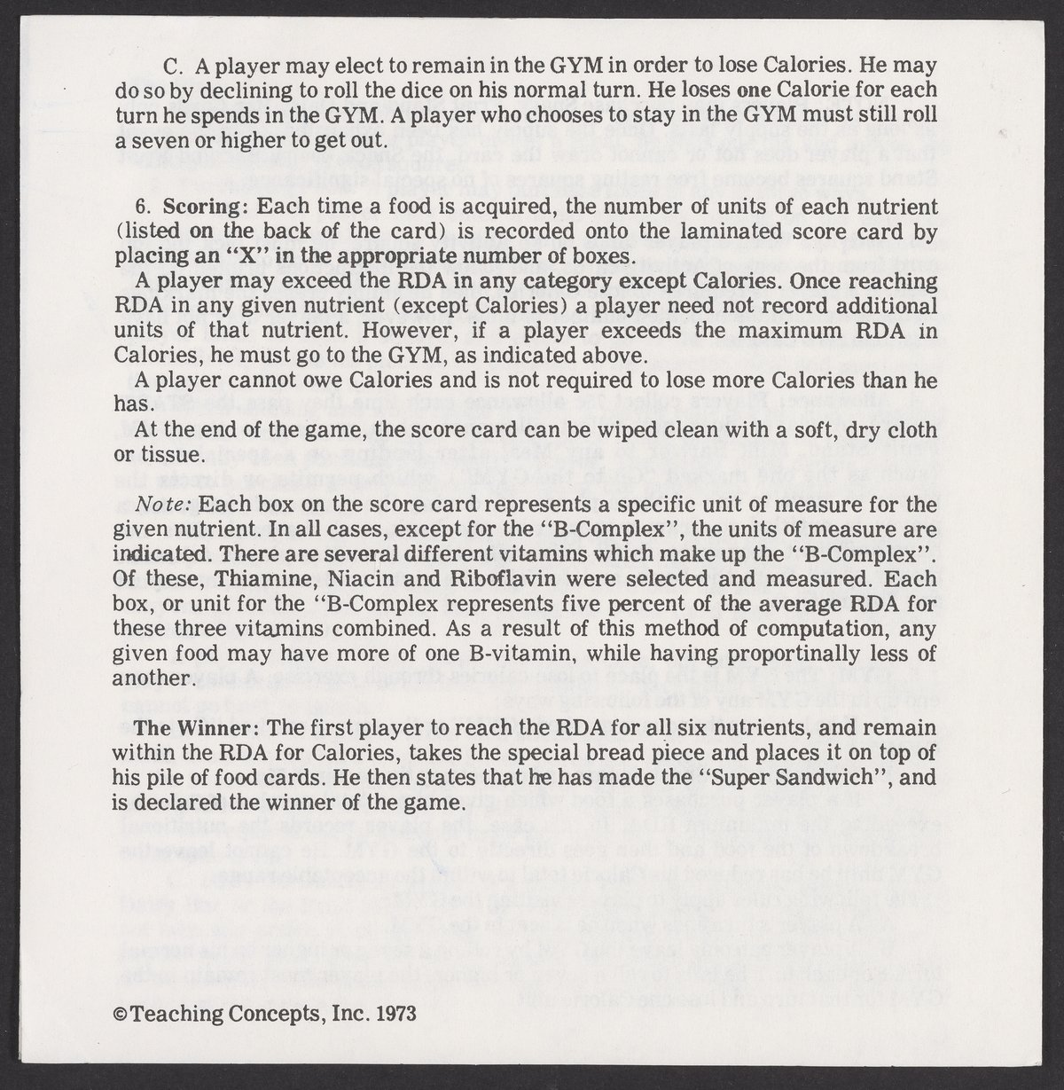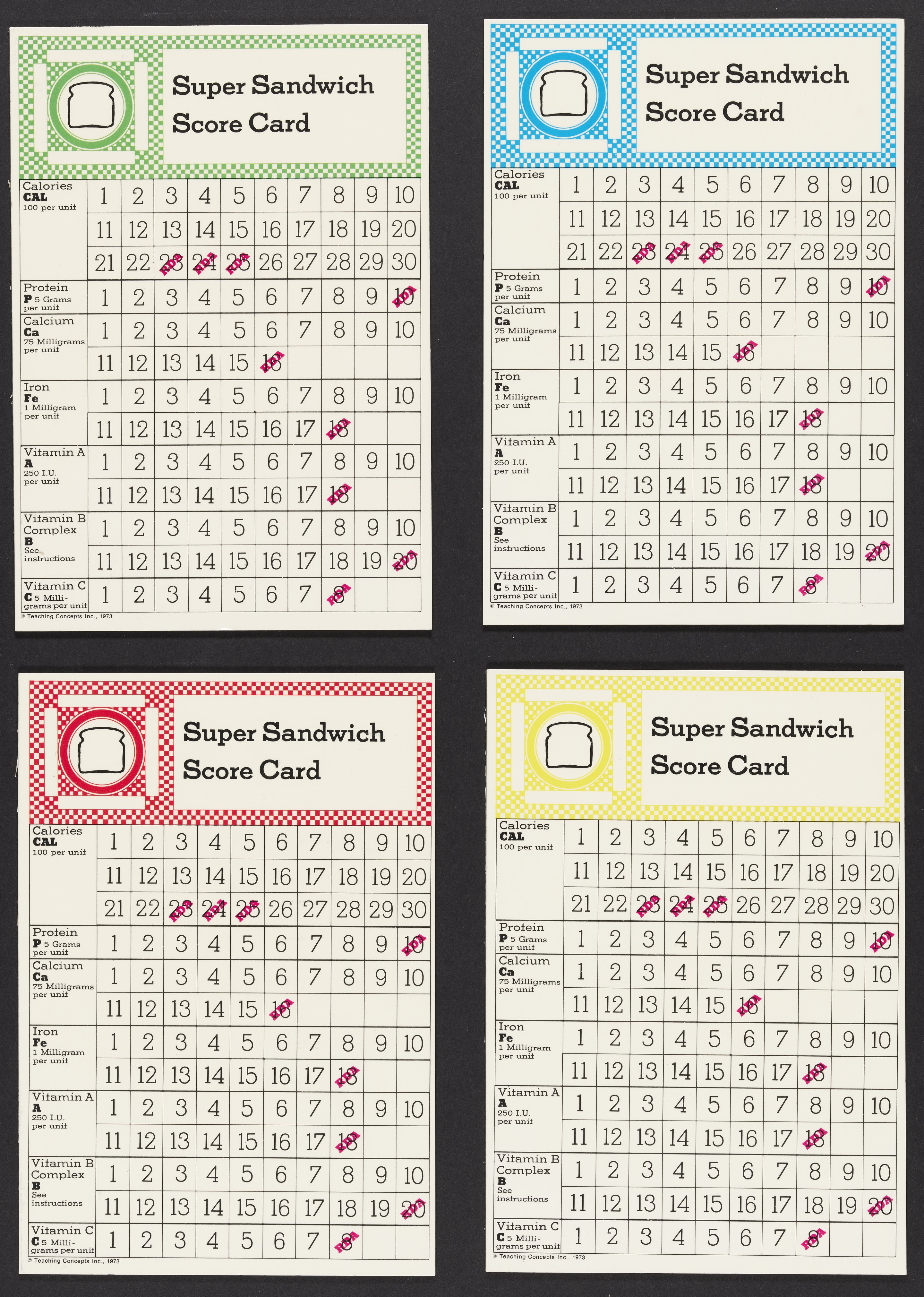 Small JPG1200 x 1200px — 393 KBLarge JPG2880 x 2880px — 1.9 MBFull-sized JPG11189 x 11189px — 31.6 MBOriginal fileTIFF — 11189 x 11189px — 358 MBSuper Sandwich board game, 1973. The object of the game is to create a "super sandwich" comprised of ingredients that will provide the RDA (Recommended Dietary Allowance) of protein, calcium, iron, vitamin A, vitamin B-complex and vitamin C while not exceeding the RDA of calories. Players purchase foods and record the content of each nutrient found in these foods. The first player to accumulate the RDA of each nutrient while remaining within the allowable calorie intake makes a "super sandwich" and wins the game.