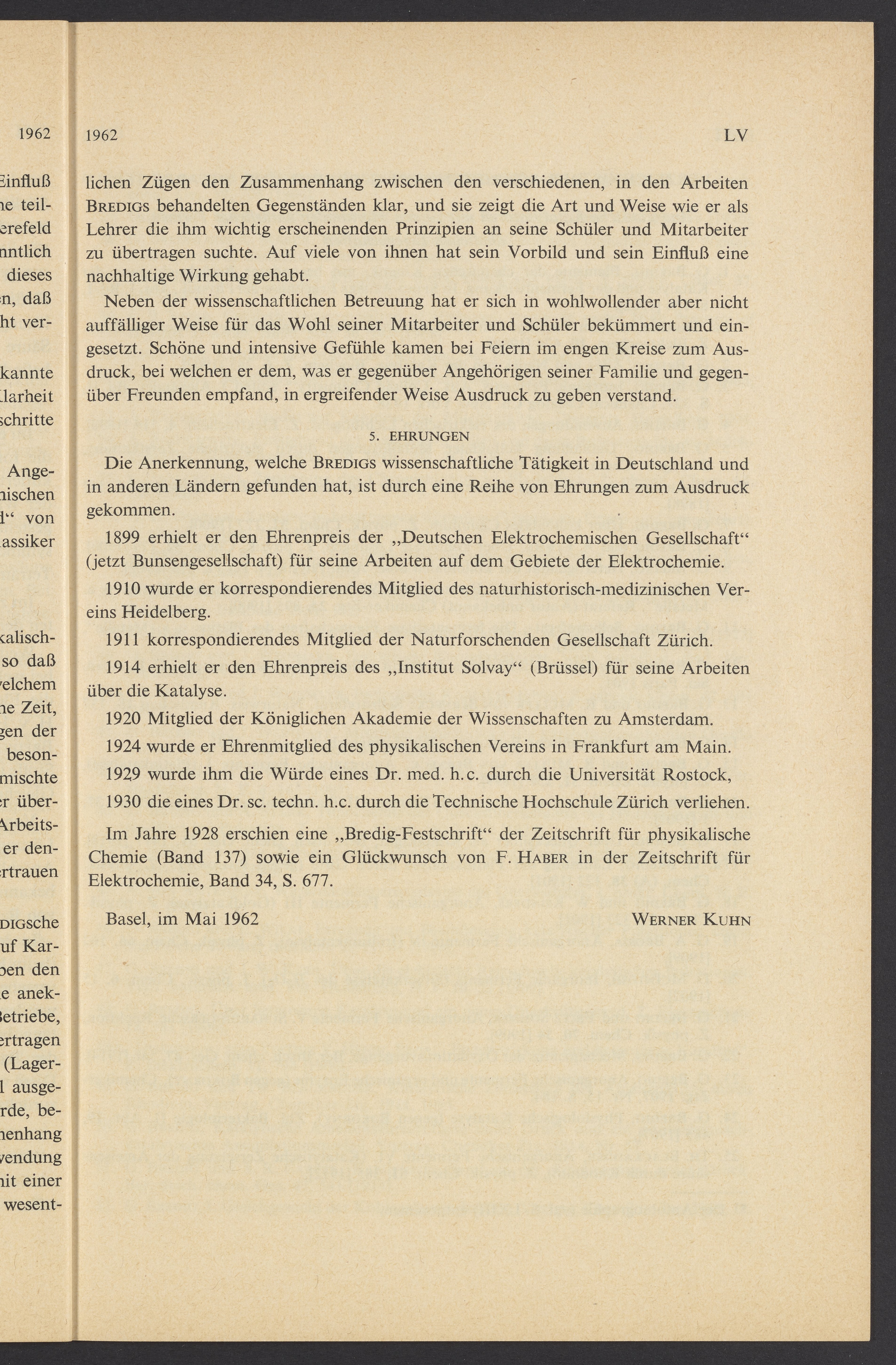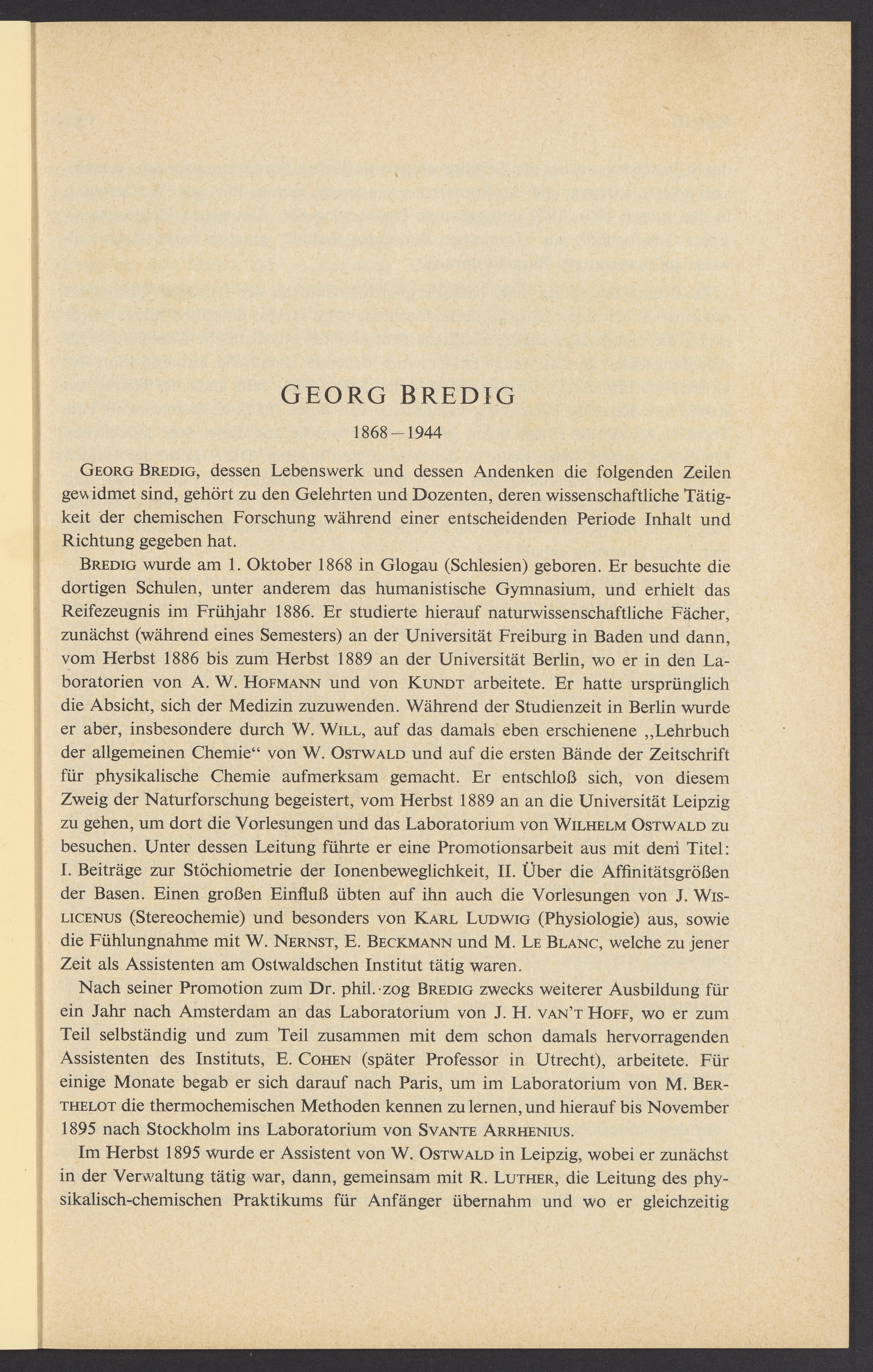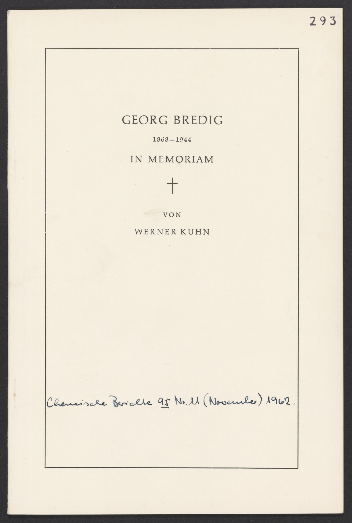 Kuhn, Werner. “Georg Bredig: In Memoriam,” November 1, 1962. Papers of Georg and Max Bredig, Box 4, Folder 10. Science History Institute. Philadelphia. https://digital.sciencehistory.org/works/vlqqkk0.