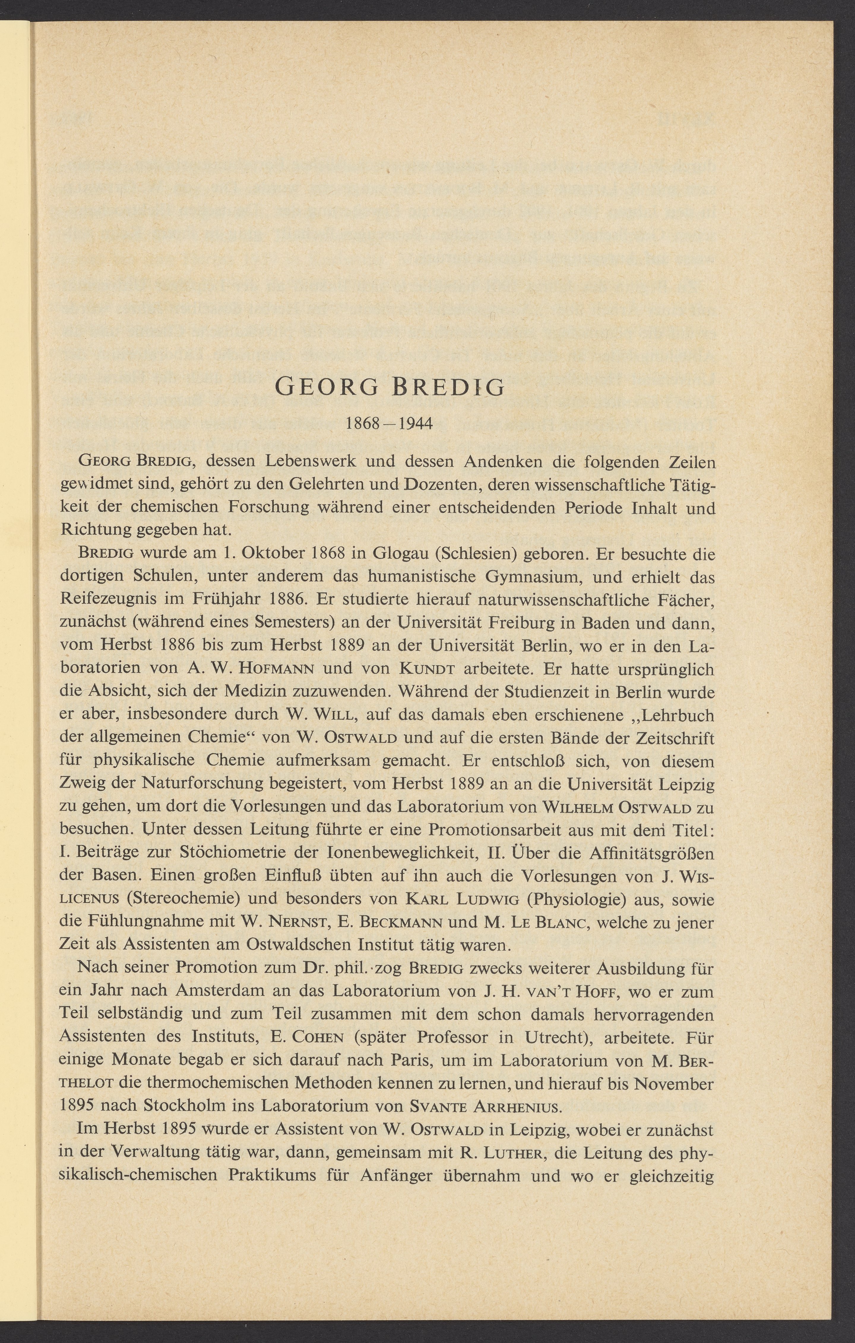 Small JPG1200 x 1779px — 124 KBLarge JPG2880 x 4269px — 846 KBFull-sized JPG3920 x 5810px — 1.5 MBOriginal fileTIFF — 3920 x 5810px — 65.2 MBGeorg Bredig was a German physical chemist known for his work with catalysts, reaction kinetics, and electrochemistry. In 1898 he created Bredig's Arc method, which became the preferred chemical method for preparing colloidal solutions of metals. Bredig studied with a number of notable scientists including Wilhelm Ostwald (1853-1932), Jacobus Henricus van’t Hoff (1852-1911), Marcellin Berthelot (1827-1907) and Svante Arrhenius (1859-1927). He taught at the Technische Hochschule, Karlsruhe from 1911 until he was forced to resign in 1933 when the National Socialist party banned Jewish people from holding academic positions. In 1940 Bredig left Germany for the Netherlands and ultimately emigrated to the United States.