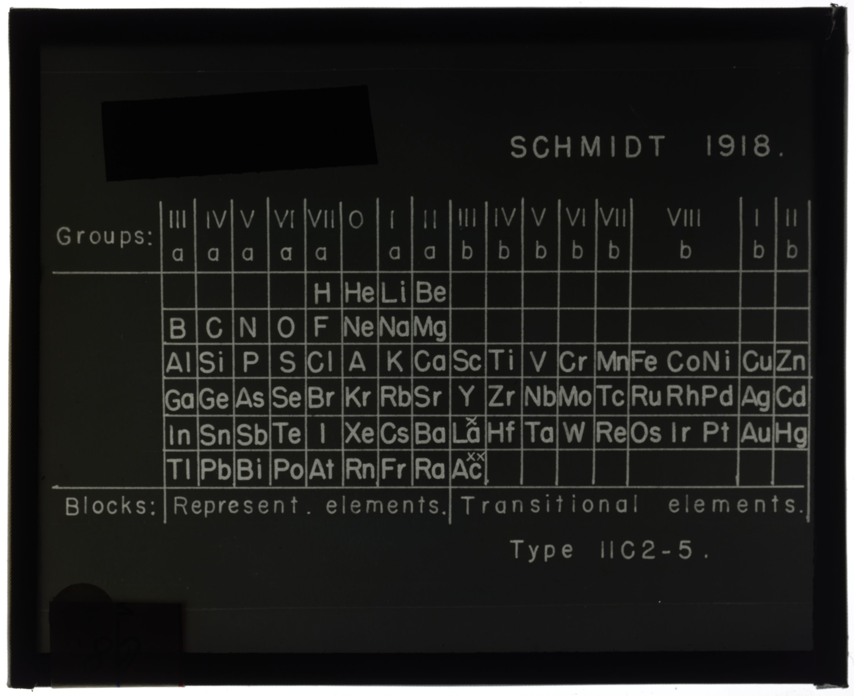Schmidt, Curt, and Edward G. Mazurs. “Series Table with Group 0 Placed in Middle of Table.” Glass (material), circa 1918–1957. Edward G. Mazurs Collection of Periodic Systems Images, Box 1. Science History Institute. Philadelphia. https://digital.sciencehistory.org/works/vm40xs148.