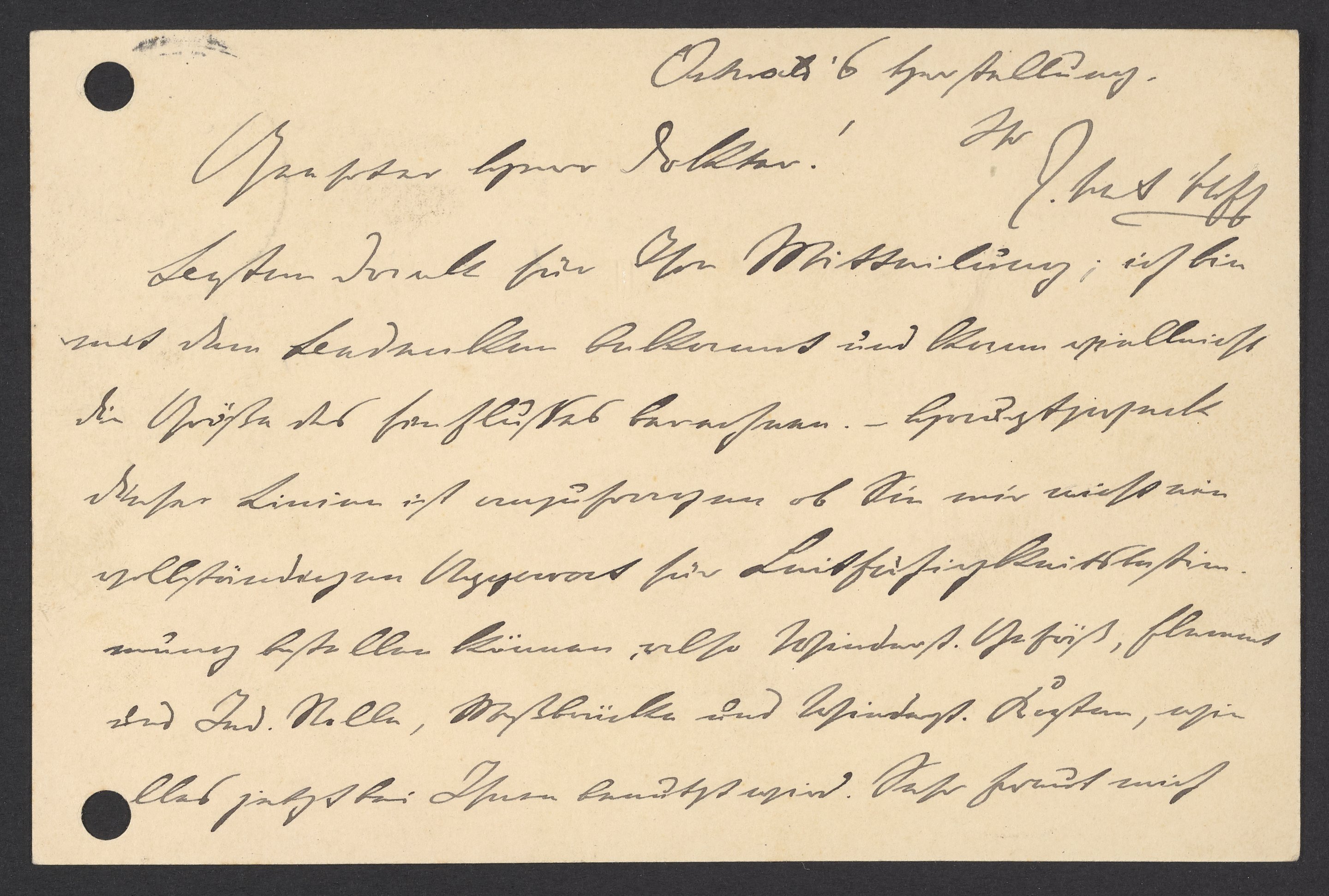 Besten Dank für Ihre Mitteilung; ich bin mit den Bedenken bekannt und kann vielleicht die Größe des Einflusses berechnen. – Hauptpunkt dieser Linien ist anzufragen ob Sie mir nicht ein[en] vollständigen Apparat für Leitflüssigkeitsbestimmung bestellen können, also Widerst. Gefäß, Flammer und Ind. Welle, Meßbrücke und Widerst. Kasten, wie alles jetzt bei Ihnen benutzt wird. Sehr freut mich Ostwalds Bestellung.