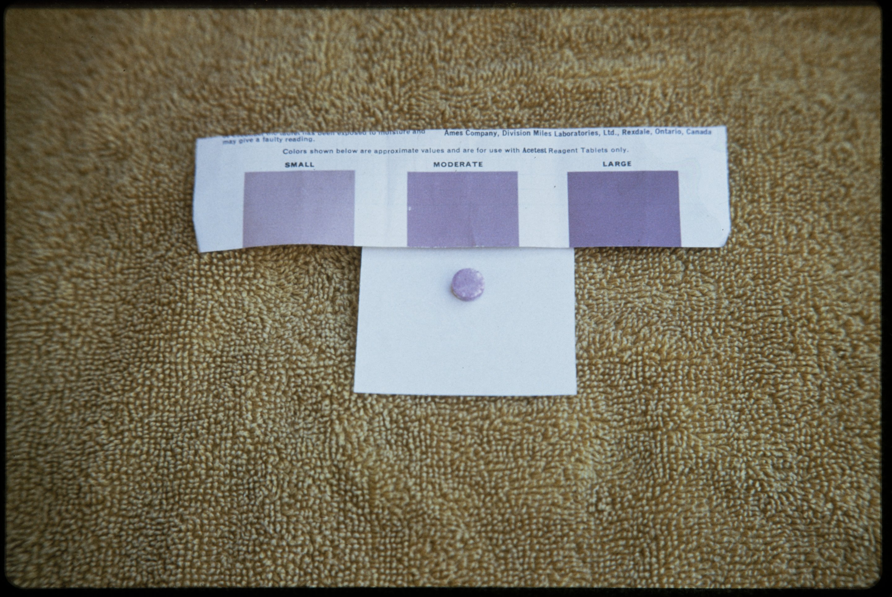 Small JPG1200 x 803px — 181 KBLarge JPG2880 x 1928px — 830 KBFull-sized JPG7552 x 5056px — 5.1 MBOriginal fileTIFF — 7552 x 5056px — 109 MBTwo photographs depicting a test for ketones in urine, serum, plasma, and whole blood using Acetest Reagent Tablets manufactured by the Ames Company. Included in the photographs are a color chart used to analyze the result.