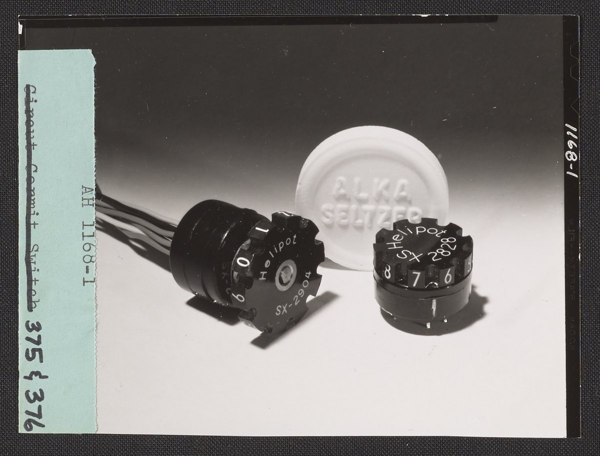 Armstrong & Hess. “Helipot Model 375 and 376 Switches with Alka-Seltzer,” 1950–1969. Beckman Historical Collection, Box 85. Science History Institute. Philadelphia. https://digital.sciencehistory.org/works/vq27zn89n.