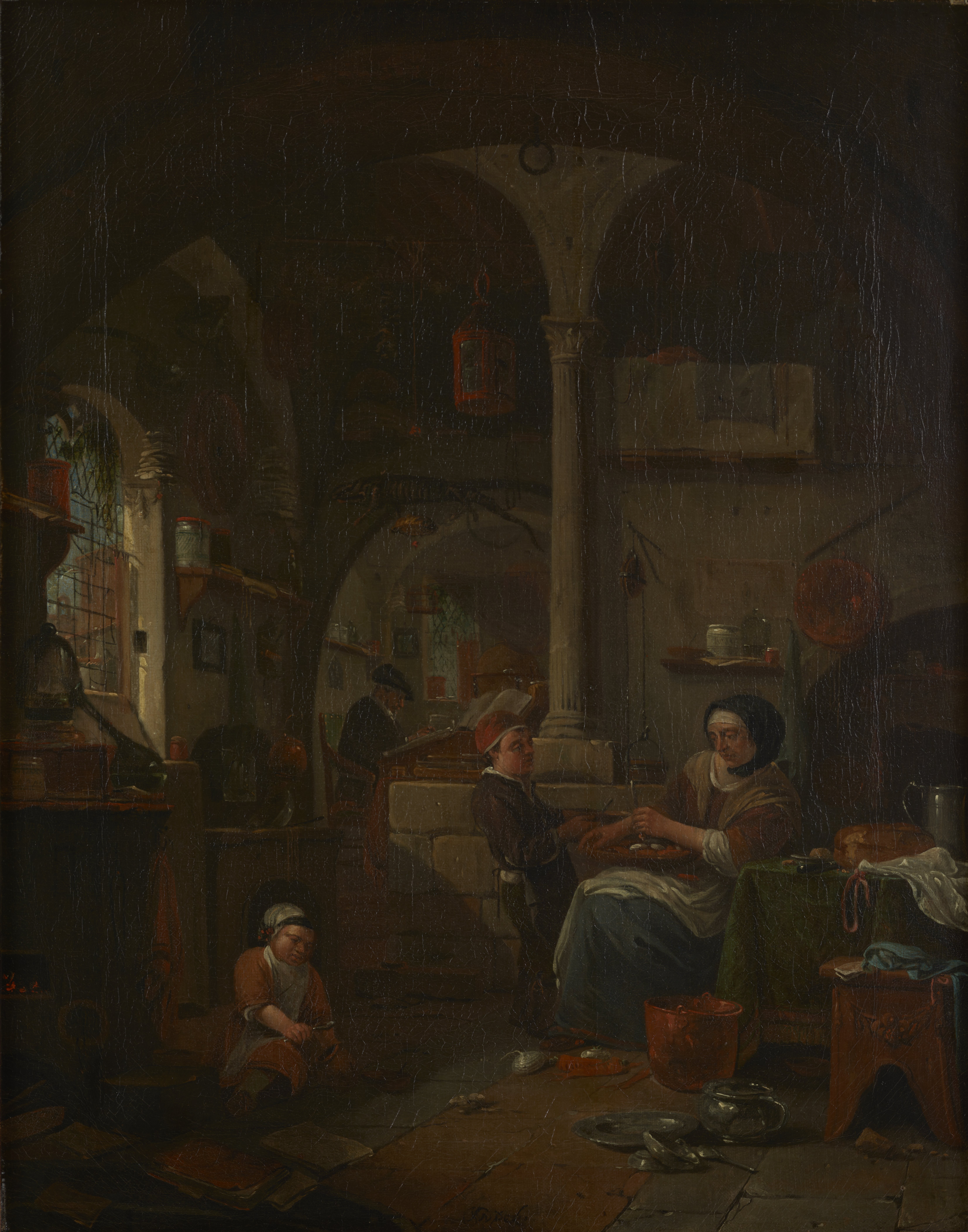 The alchemist sits in a small side chamber, absorbed by his readings, as his family works to prepare a meal in the open kitchen. Household and alchemical materials merge: a distillation apparatus sits on the hearth at left, as the alchemist's wife cuts and peels vegetables at right. Though the room is cluttered with copper vessels, texts, and instruments, the scene is suffused with domestic warmth. A stuffed iguana hangs overhead, a common trope of alchemical workrooms, but it is accompanied by a taxidermied turtle: an animal which symbolizes the safety and comfort of home.
