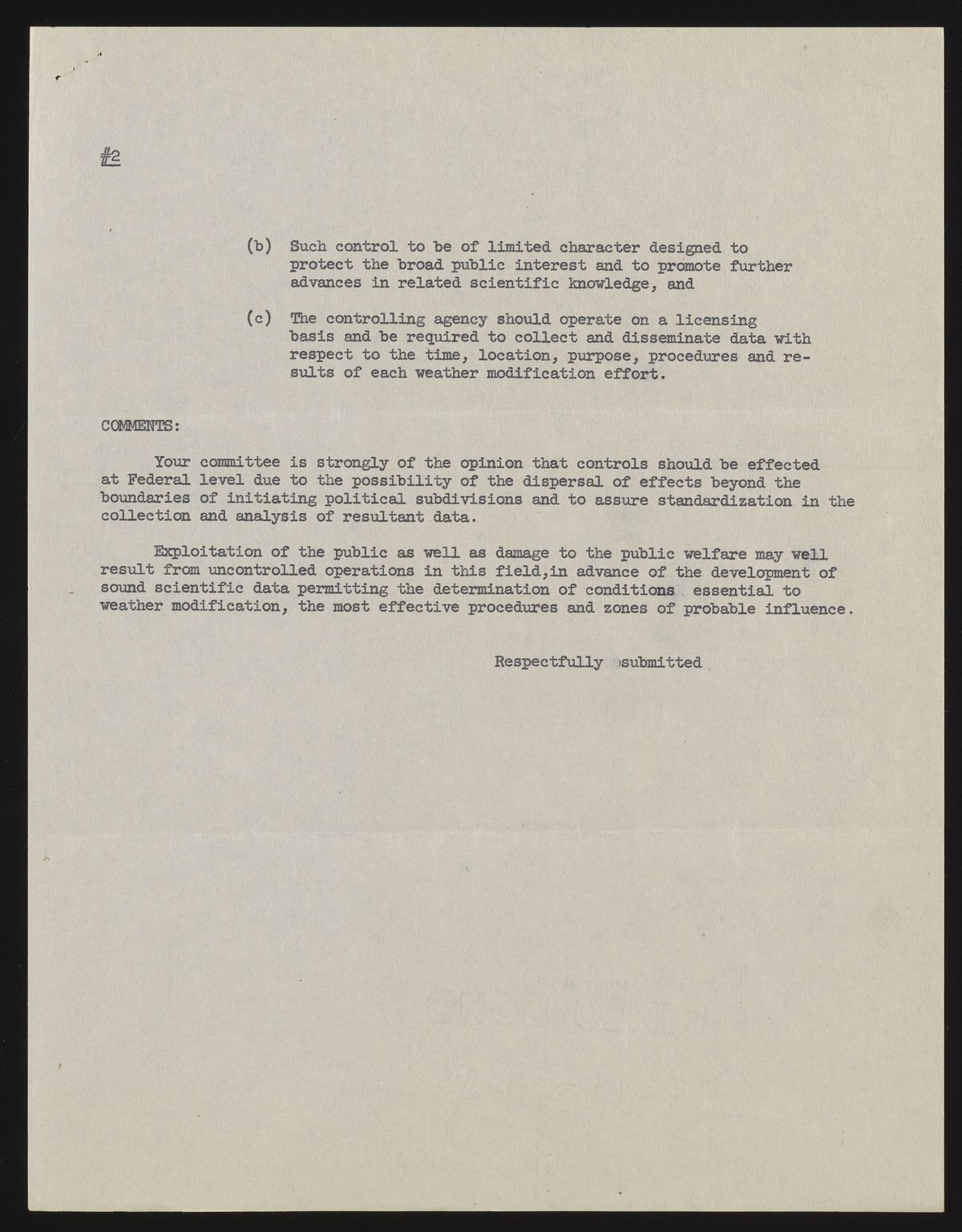 The report, from a committee chaired by Arnold O. Beckman, recommended that attempts to manipulate the weather be controlled and monitored by a federal agency.