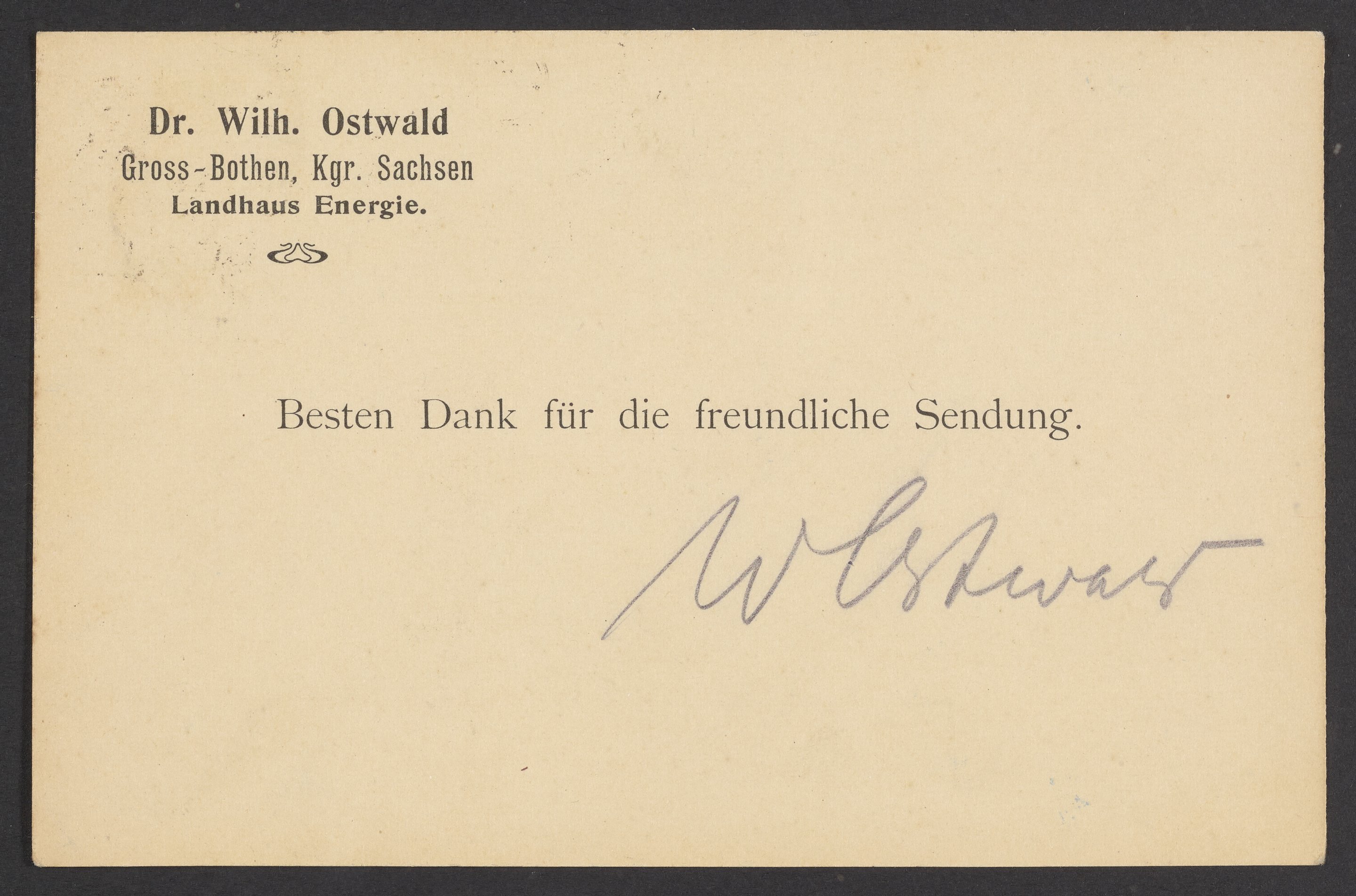 Small JPG1200 x 796px — 116 KBLarge JPG2880 x 1911px — 686 KBFull-sized JPG3538 x 2348px — 1015 KBOriginal fileTIFF — 3538 x 2348px — 23.8 MBWilhelm Ostwald (1853-1932) sends his thanks to Georg Bredig (1868-1944) for his correspondence.