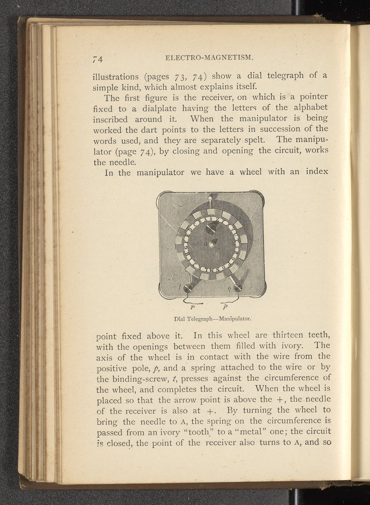 Ward, Lock. “Dial Telegraph Manipulator.” Wonders of Electricity and the Elements, Being a Popular Account of Modern Electrical and Magnetic Discoveries, Magnetism and Electric Machines, the Electric Telegraph and the Electric Light, and the Metal Bases, Salt, and Acids. London, England, 1870–1900. https://digital.sciencehistory.org/works/vv7o94e.