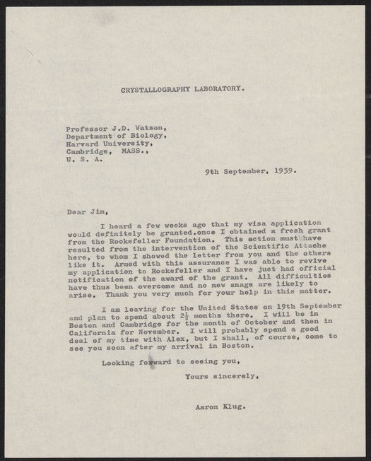 Klug, A. (Aaron), Sir. “Letter from Aaron Klug to James Watson, September 9, 1959,” September 9, 1959. History of Molecular Biology Collection, Box 28, Folder 8. Science History Institute. Philadelphia. https://digital.sciencehistory.org/works/vw857hb.