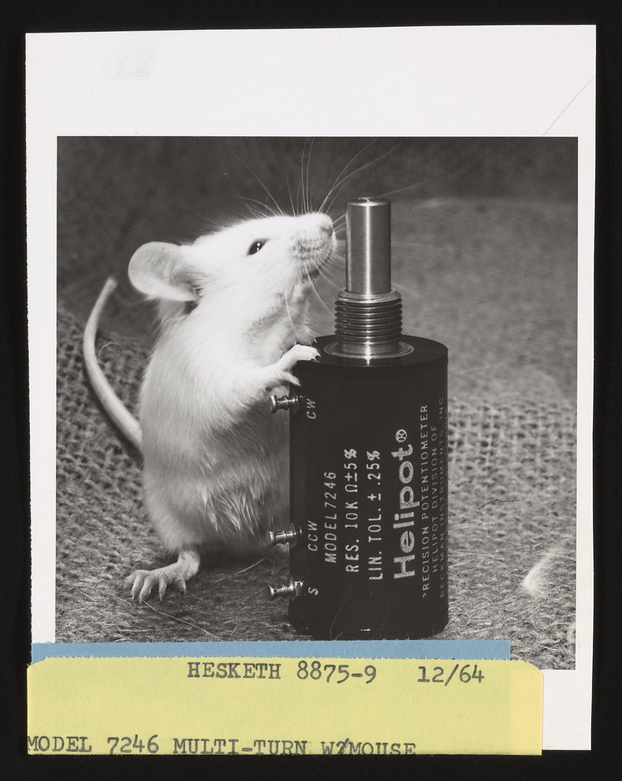 Hesketh, Dean D. “Mouse with a Helipot Model 7246 Multi-Turn Potentiometer,” December 1964. Beckman Historical Collection, Box 86. Science History Institute. Philadelphia. https://digital.sciencehistory.org/works/vx021f09b.