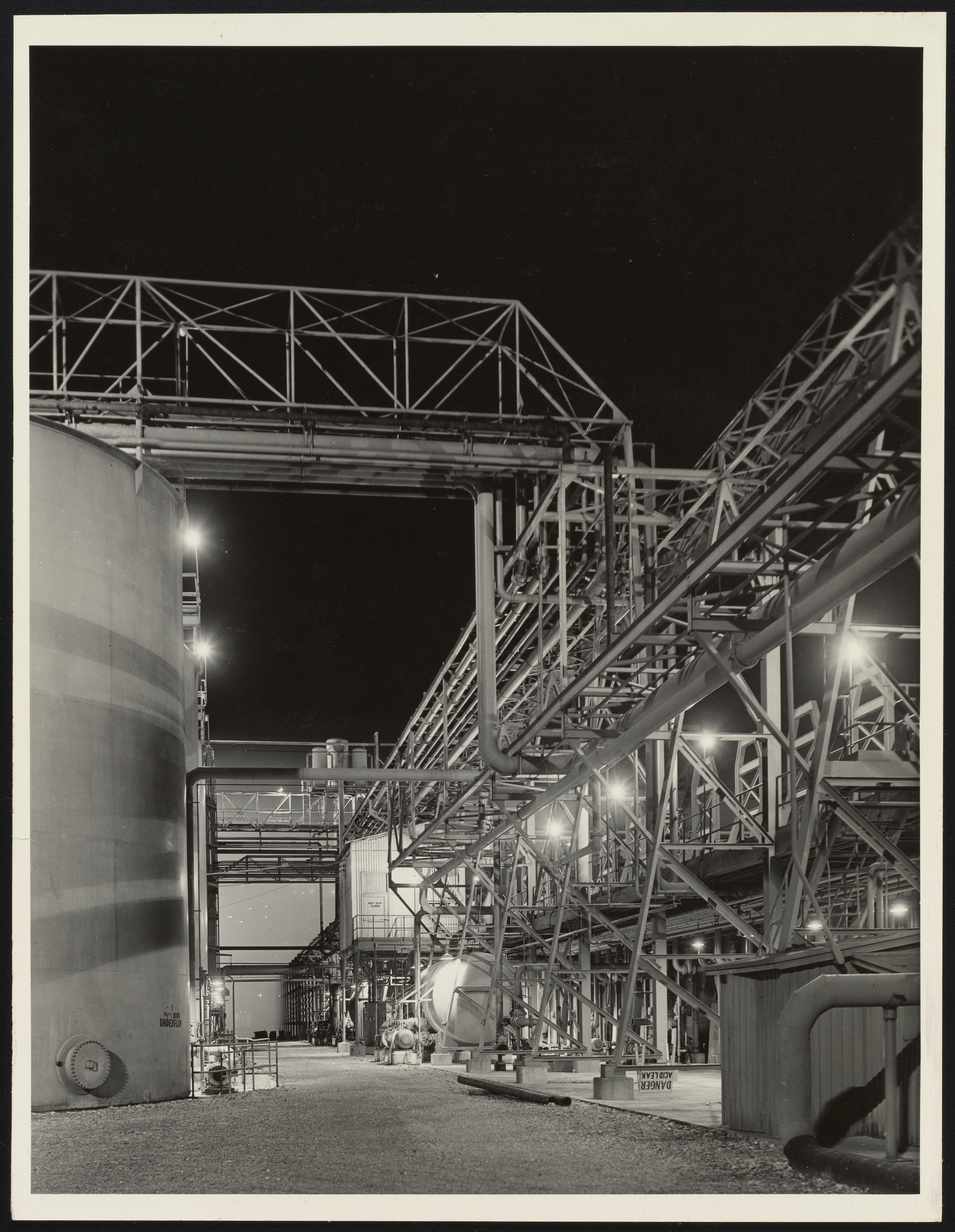 General view, taken at night, of the exterior of the Dow Chemical Company Texas Division plant located in Freeport, Texas. A range of products and processes were researched, developed, and produced at the plant, including chlorination, phenol, and magnesium.
