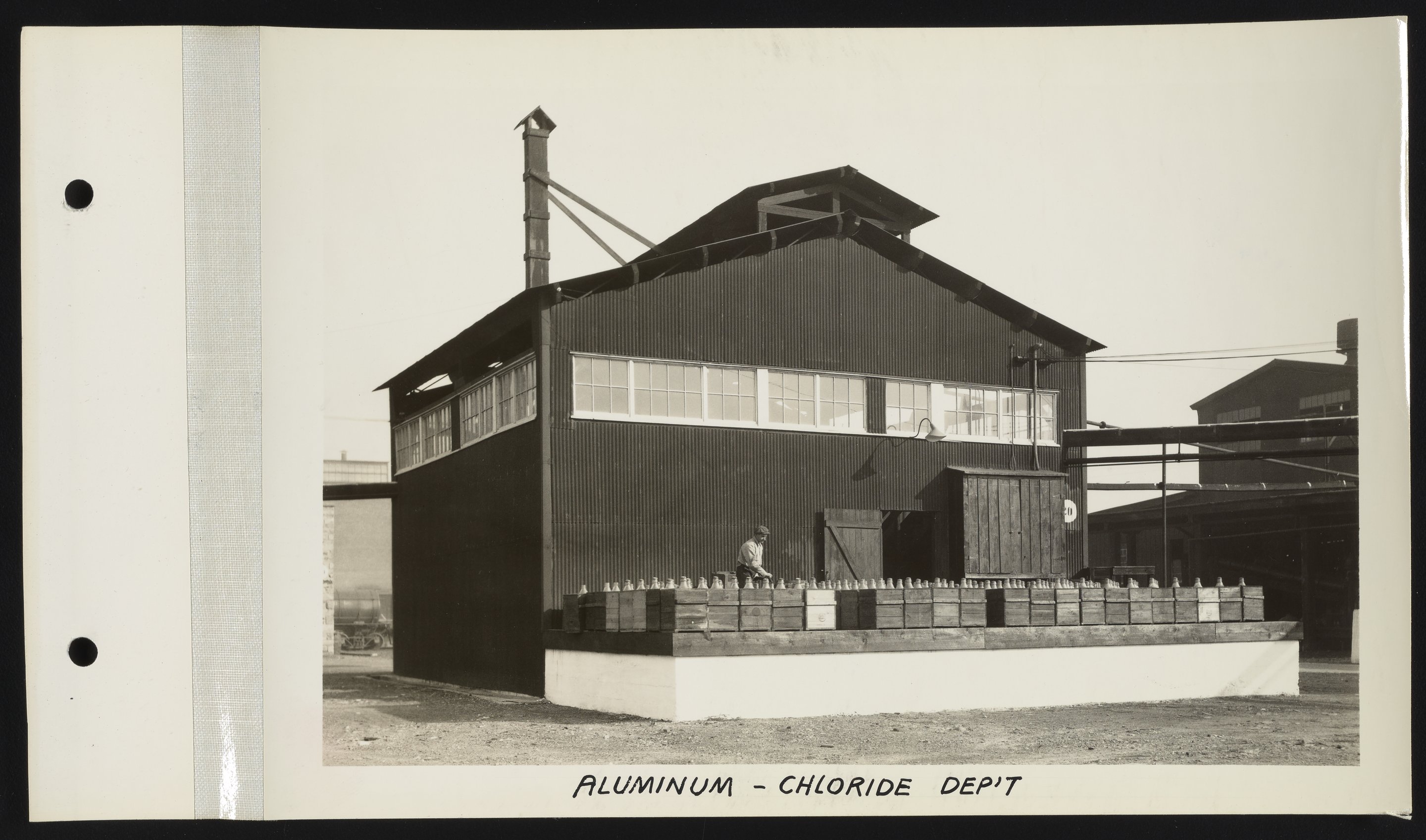 Exterior view of a section of the aluminum-chloride department at the Charles Lennig and Company chemical manufacturing plant in Bridesburg, a neighborhood located along the Delaware River in the Northeast section of Philadelphia, Pennsylvania. Charles Lennig and Company operated as a subsidiary of the Rohm and Haas Company, an international chemical company headquartered in Philadelphia, from 1920 to 1947. The employee visible in the photograph is unidentified.
