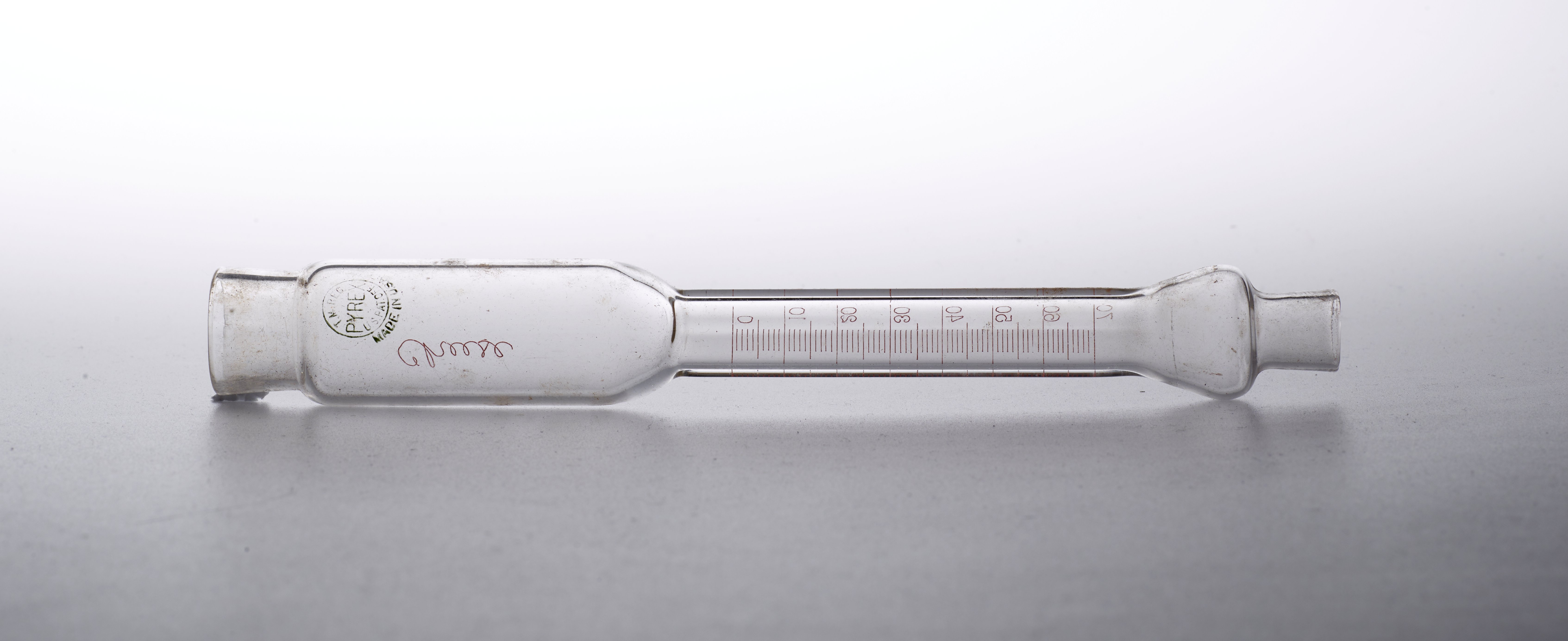 Small JPG1200 x 490px — 53.5 KBLarge JPG2880 x 1177px — 197 KBFull-sized JPG6772 x 2768px — 940 KBOriginal fileTIFF — 6772 x 2768px — 53.6 MBPyrex 70% Gerber Bottle - A glass tube bottle with bulbous ends and a flattened midsection. The mid-section has measurements from 0 to 70 mL. One end is inscribed in red "Cheese".