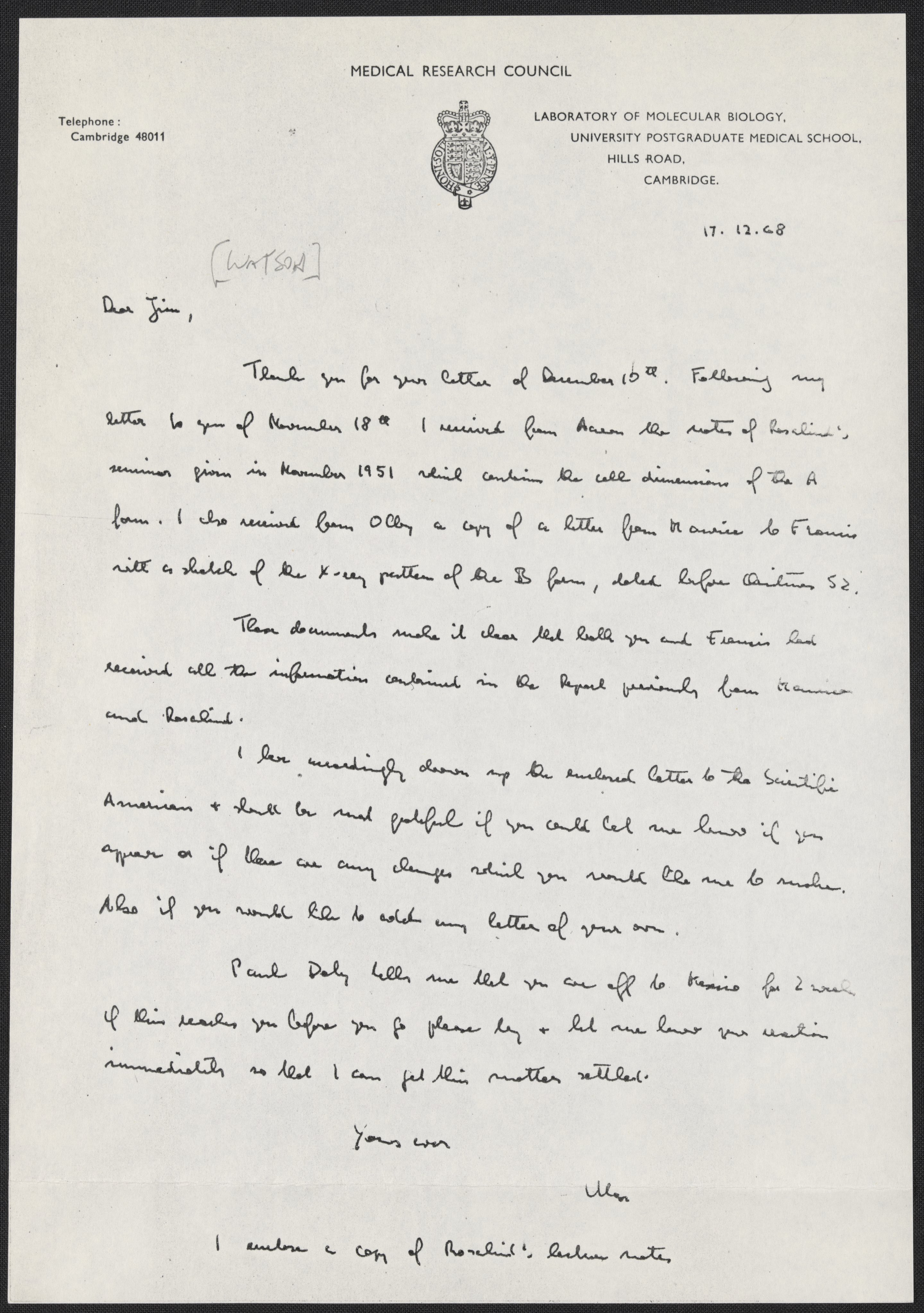 Letter from James D. Watson to Max Perutz, December 17, 1968