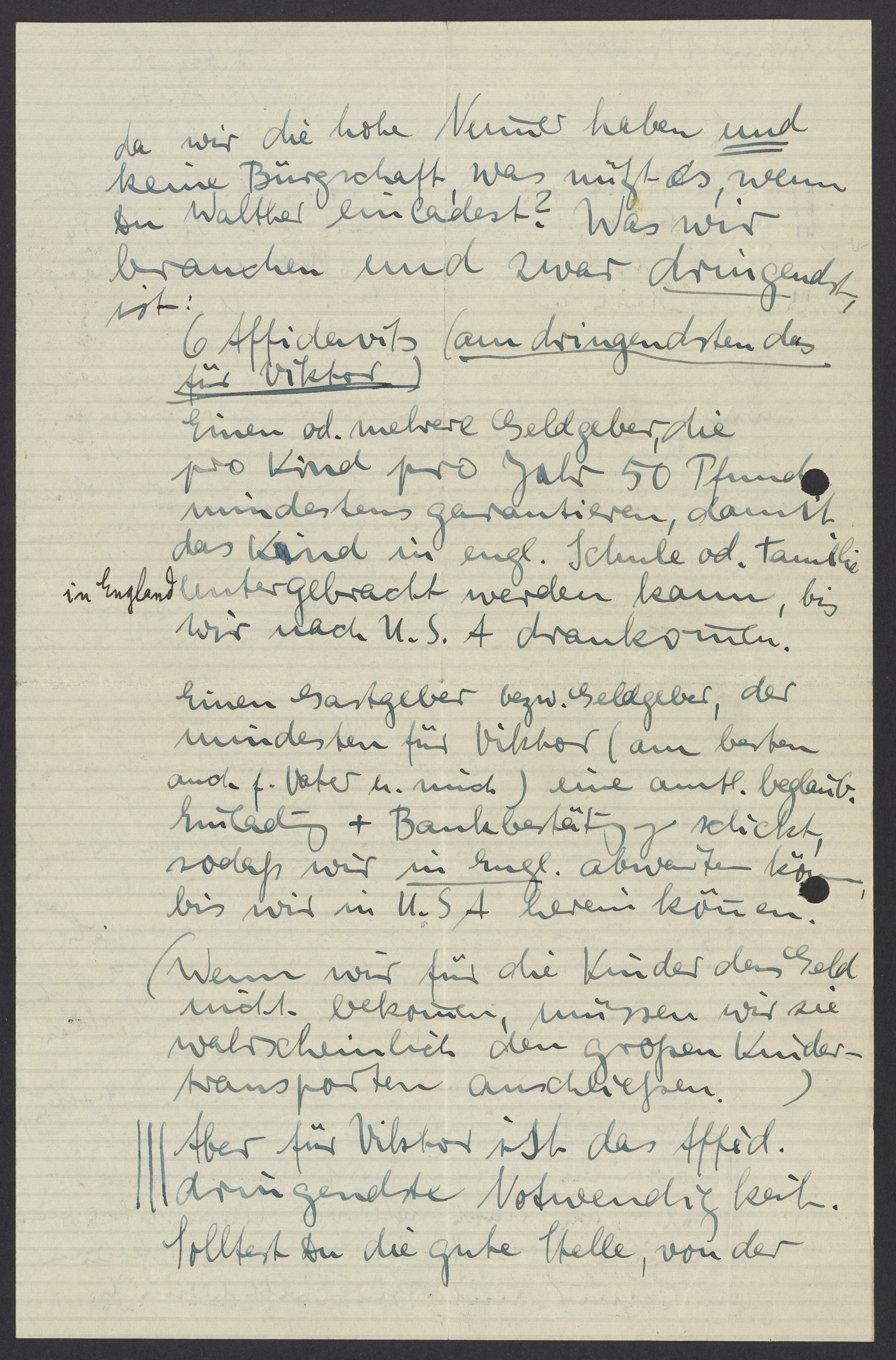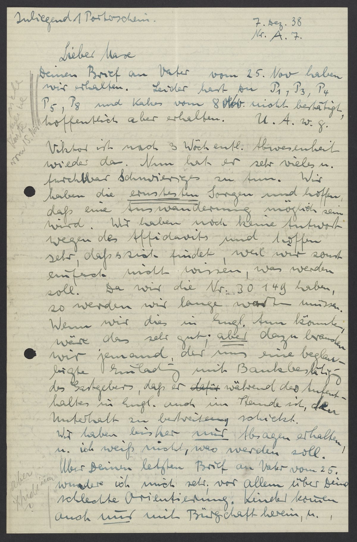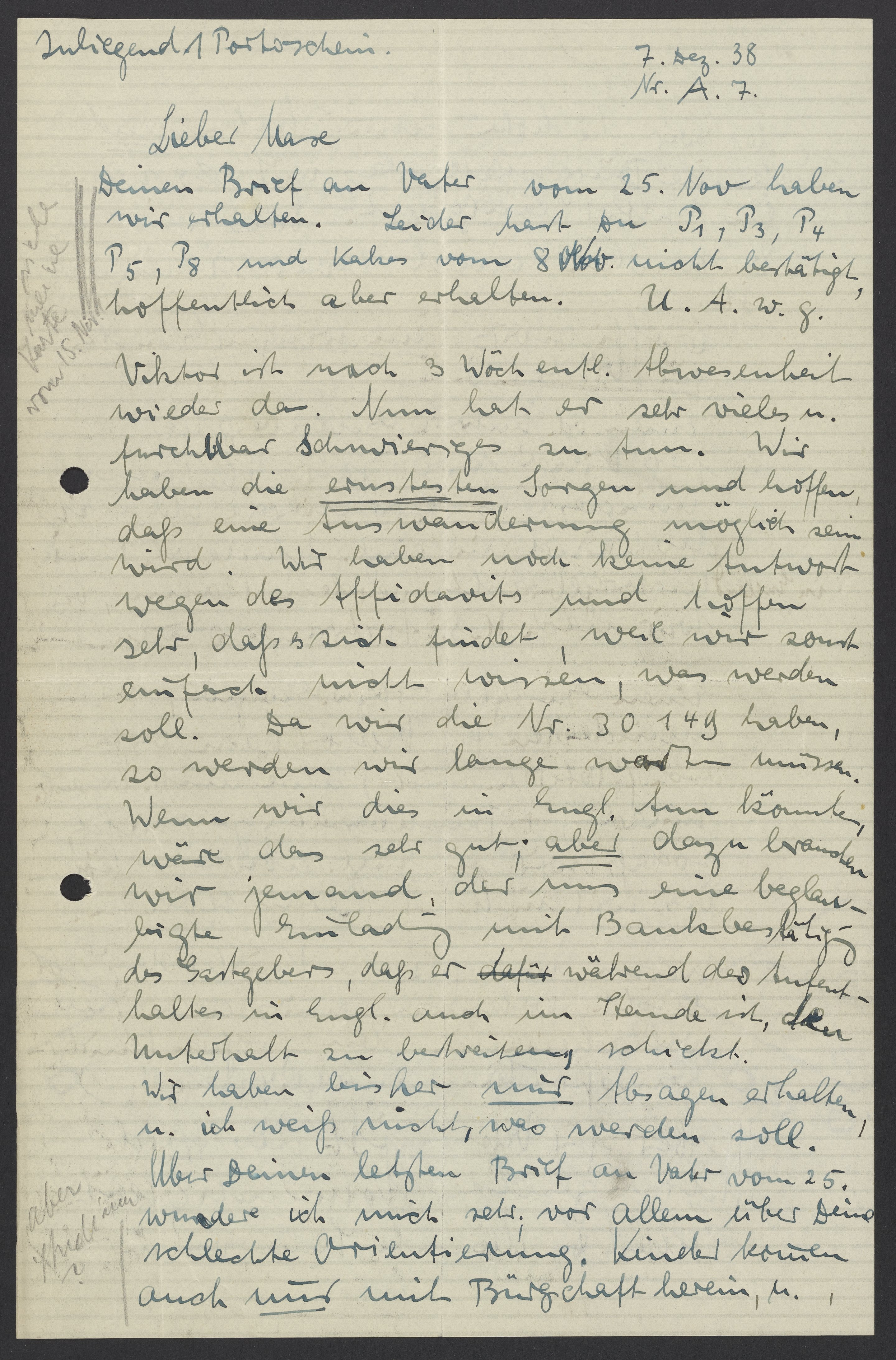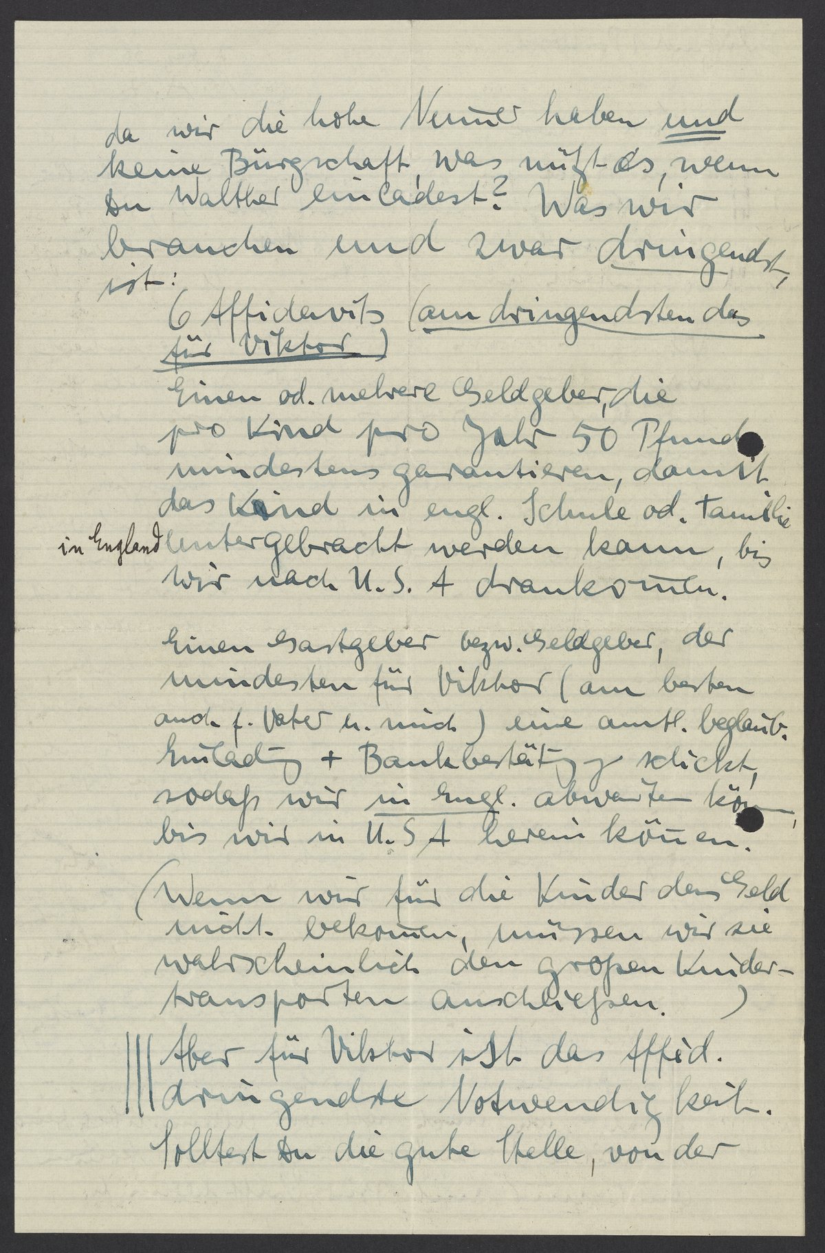 Viktor ist nach 3 wöchentl. Abwesenheit wieder da. Nun hat er vieles u. furchtbar schwieriges zu tun. Wir haben die ernstesten Sorgen und hoffen, dass eine Auswanderung möglich sein wird. Wir haben noch keine Antwort wegen des Affidavits und hoffen sehr, dass es sich findet, weil wir sonst einfach nicht wissen, was werden soll. Da wir die Nr. 30149 haben, so werden wir lange warten müssen. Wenn wir dies in England tun könnten, wäre das sehr gut; aber dazu brauchen wir jemand, der uns eine beglaubigte Einladung mit Bankbestätigung des Gastgebers, dass er während des Aufenthaltes in Engl. auch im Stande ist, den Unterhalt zu bereiten, schickt.