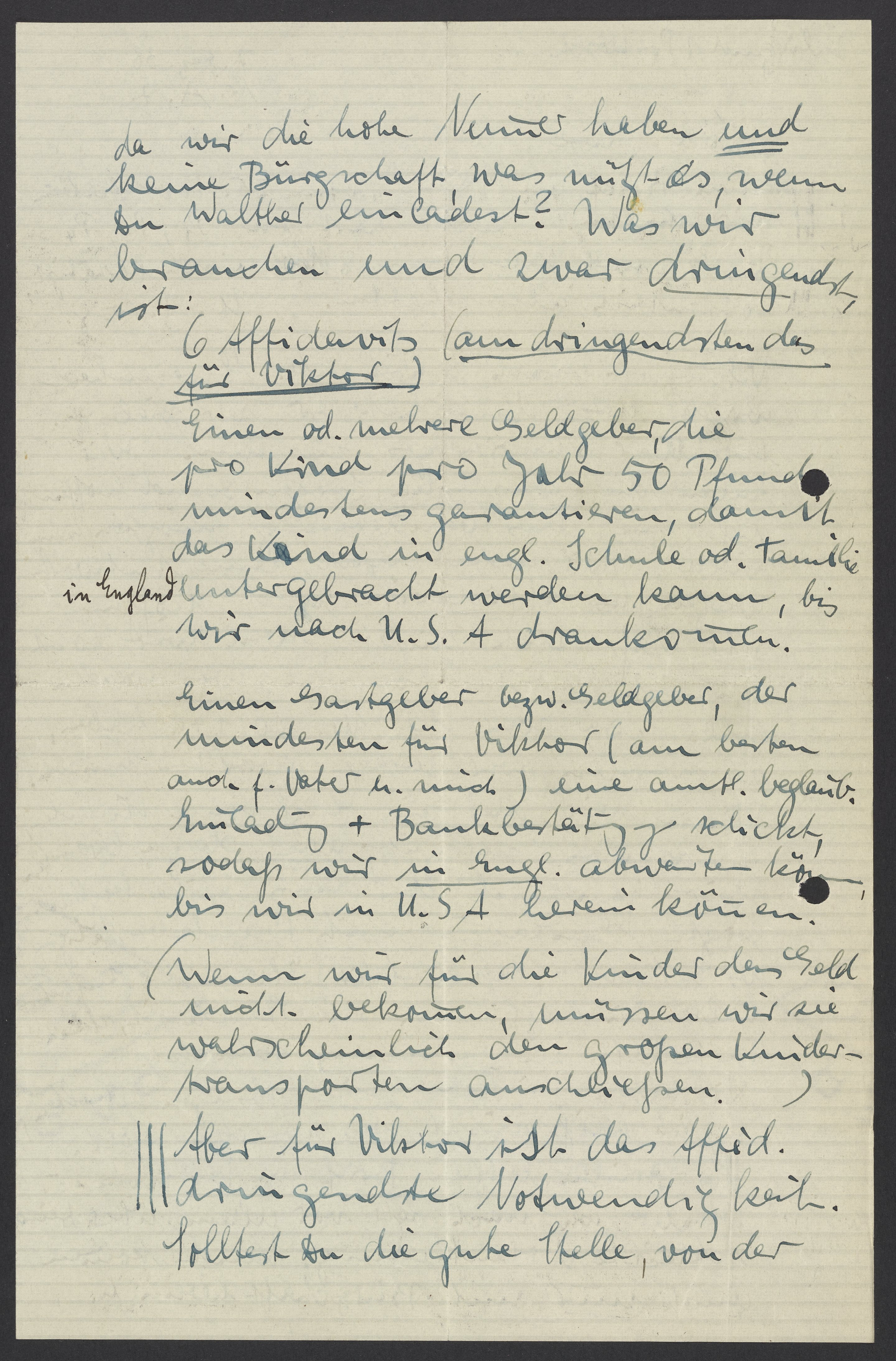 Small JPG1200 x 1822px — 412 KBLarge JPG2880 x 4372px — 2.1 MBFull-sized JPG4233 x 6426px — 4.3 MBOriginal fileTIFF — 4233 x 6426px — 77.9 MBMarianne Homburger (1903-1987) explains to her brother, Max Bredig (1902-1977), which documents and financial assets would be necessary for her and her family to emigrate to England while they await a visa for the United States. The final page of this letter is missing.