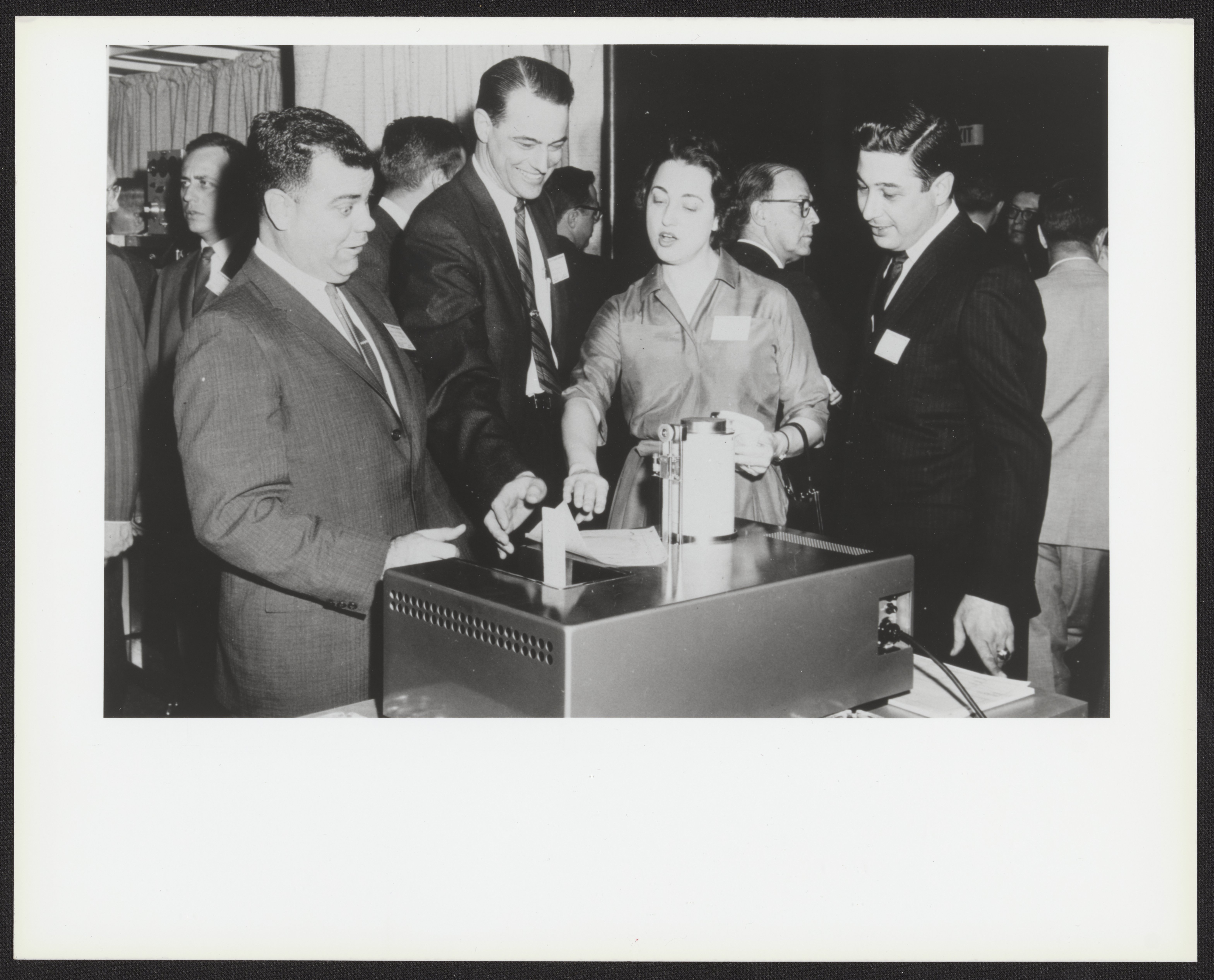 Black and white photograph of Clara Smith Craver, Jack Bauden, Bill Potts, and Bob Moreno at the Pittsburgh Conference and Exposition on Analytical Chemistry and Applied Spectroscopy (PITTCON) in 1957. PITTCON was first held in Pittsburgh, Pennsylvania, in 1950.