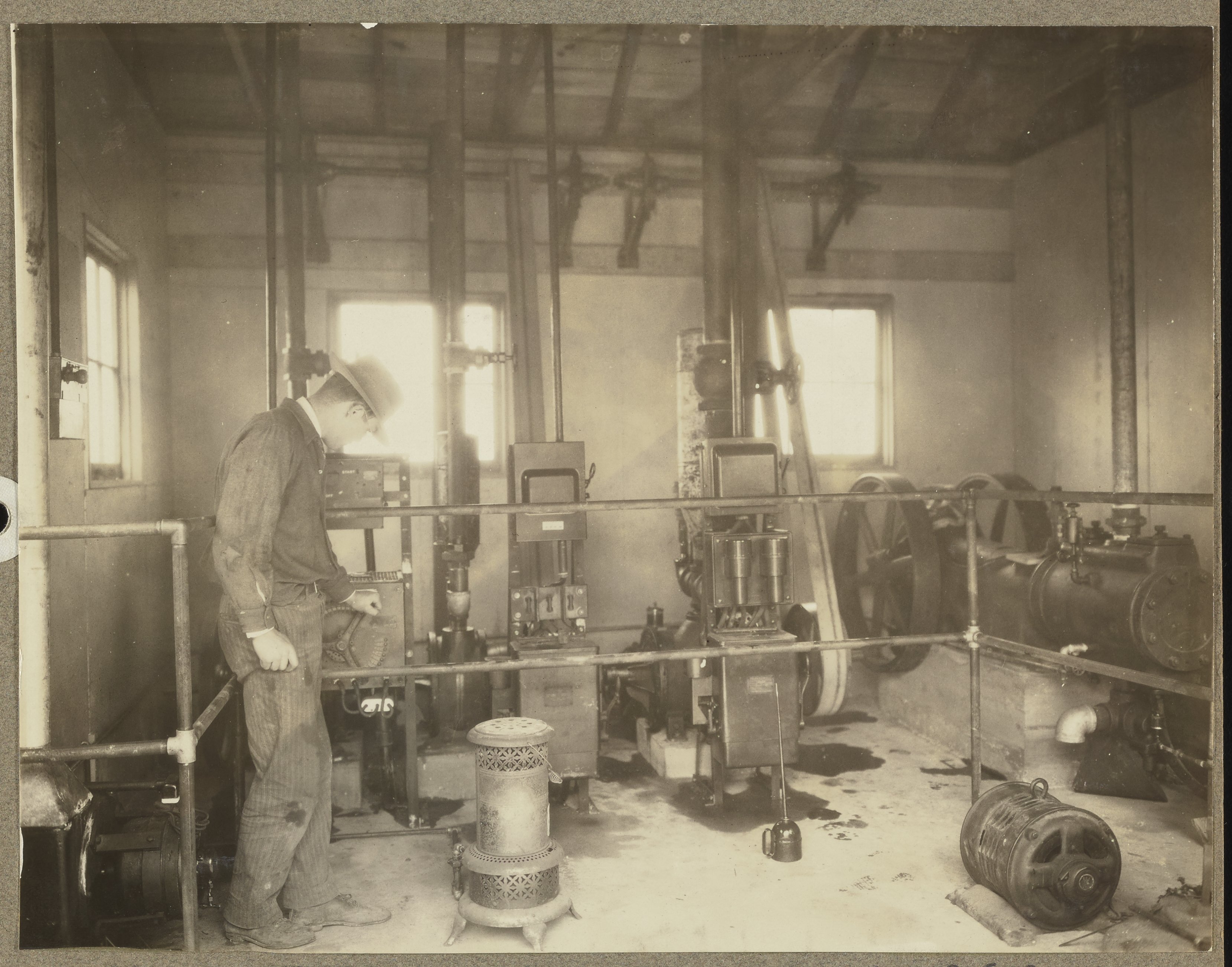 General view of Travis P. Hignett demonstrating use of the blowing engines for the experimental blast furnace at the U.S. Department of Agriculture's Fixed Nitrogen Research Laboratory located in Washington, D.C. A blowing engine is a large stationary steam or internal combustion engine directly coupled to air pumping cylinders. Blowing engines are used to provide the air blast for blast furnaces and other forms of smelter.