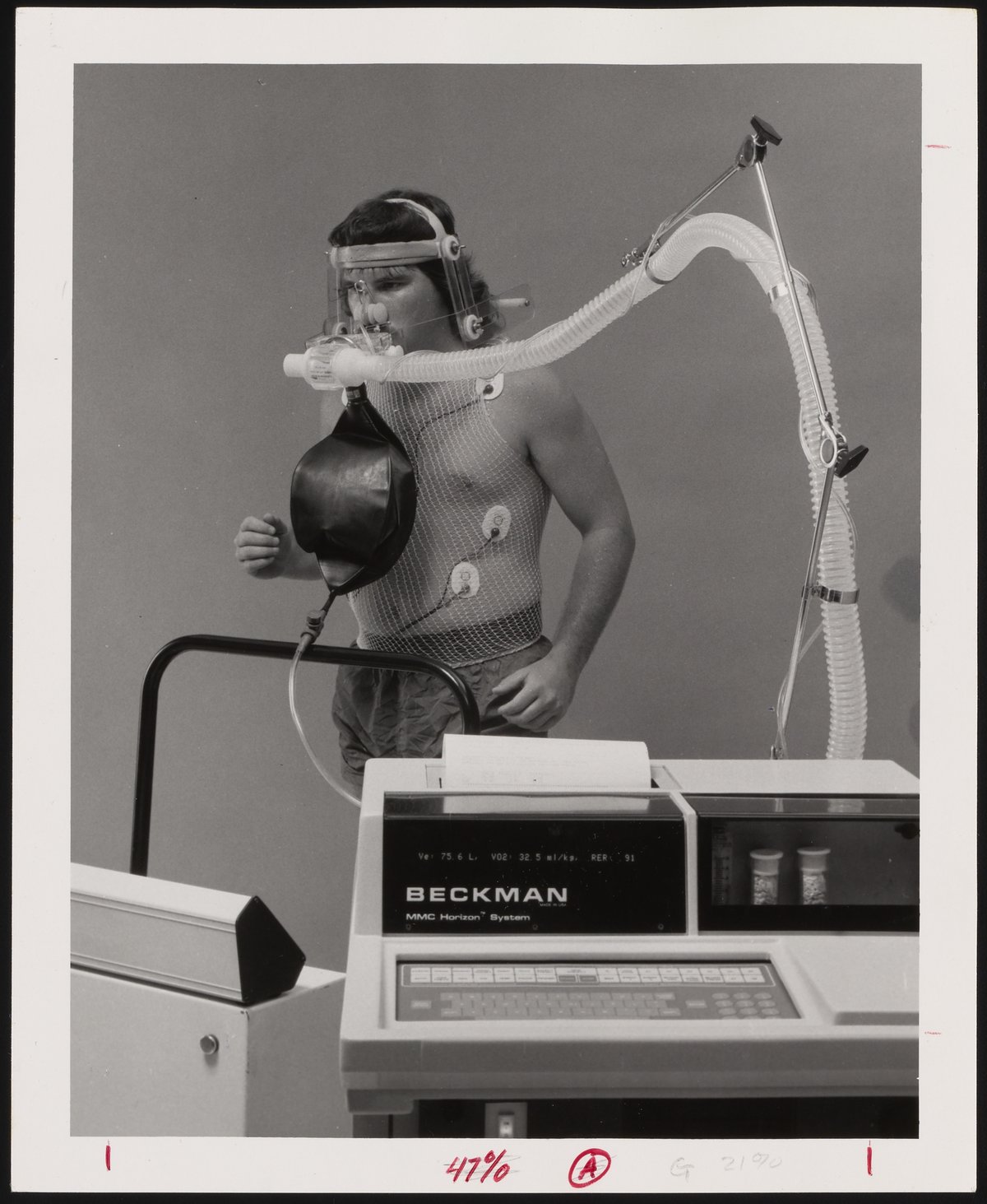Photographers III. “Man with Breathing Apparatus and Electrodes of Beckman MMC Horizon System,” 1975–1984. Beckman Historical Collection, Box 82. Science History Institute. Philadelphia. https://digital.sciencehistory.org/works/w6634378j.